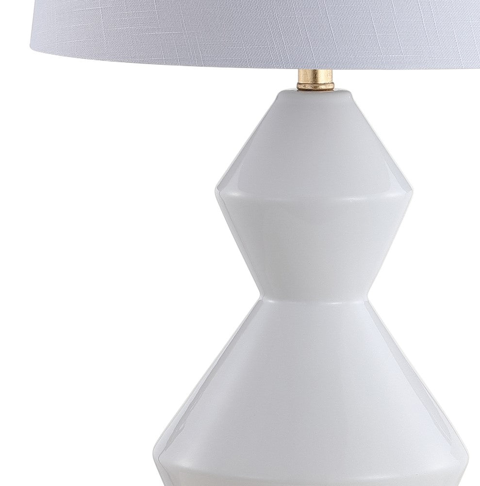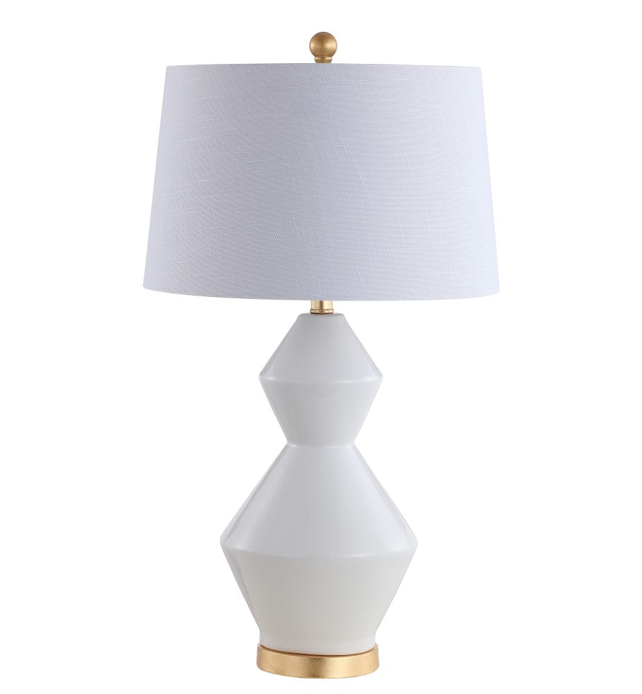 The stacked geometric shape of this modern table lamp serves as a great focal point for any room. Glazed to have a high-gloss effect, the white finish stands out while being versatile for any color scheme. Topped with an off-white drum shade, this modern design is accented in a gold finish that extends to the matching finial on top.