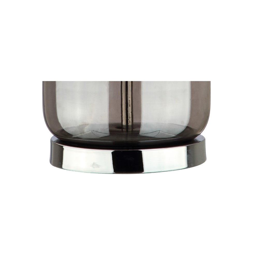 Inspired by collectible colored glass vases and bottles, the smoked glass table lamp is a perfect accessory for cottage-style interiors. Silver fittings, gray glass, and an off-white cotton hardback drum shade update the romantic vintage look. A silk-wrapped cord completes the elegant look.