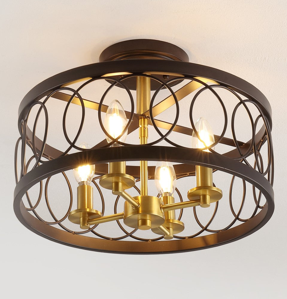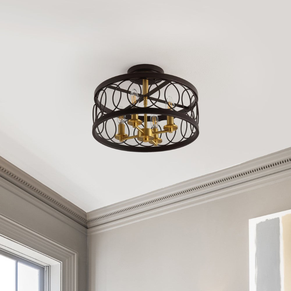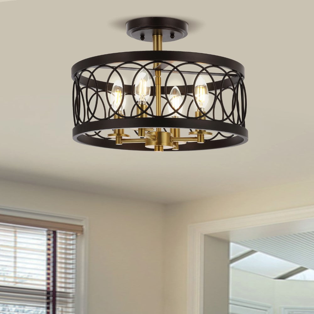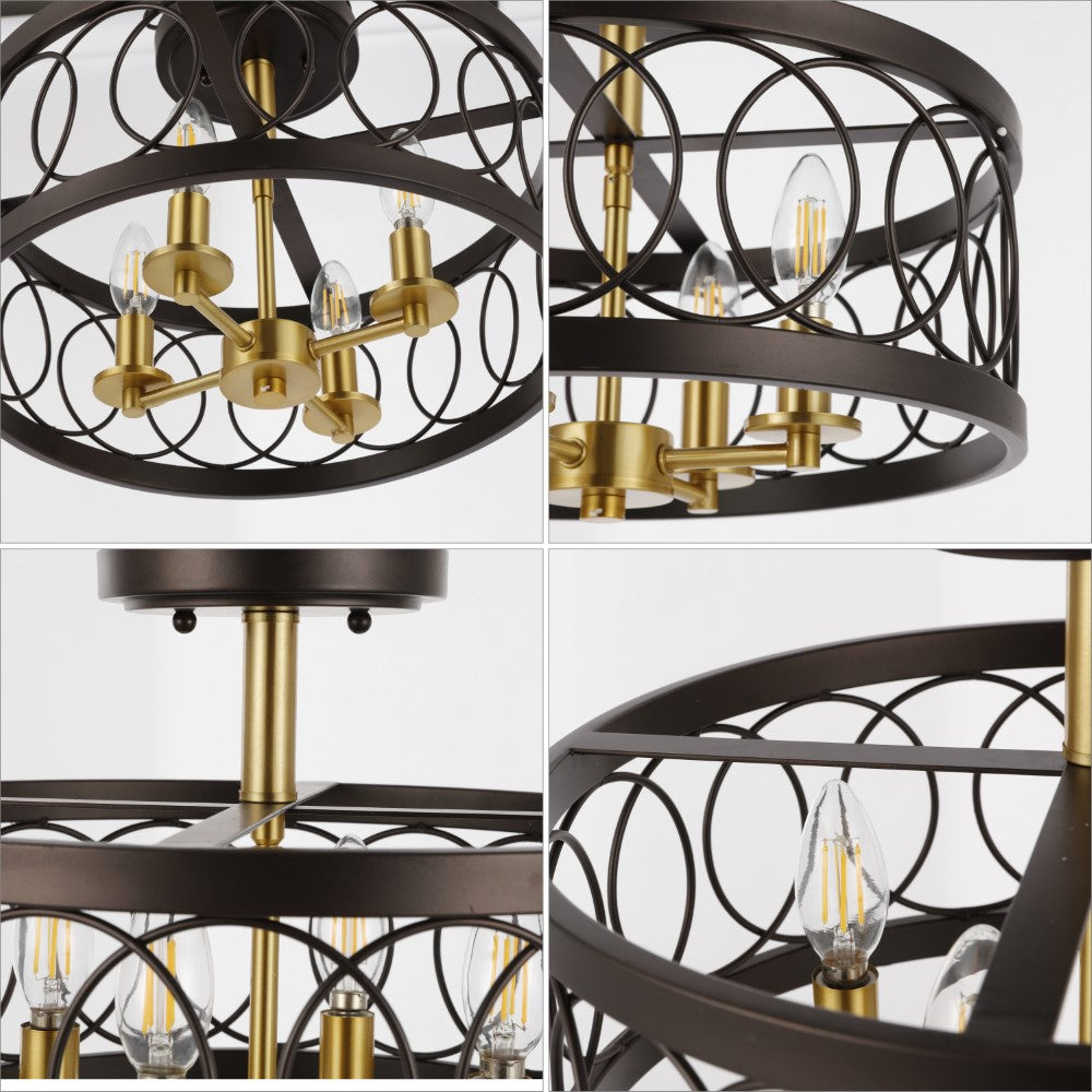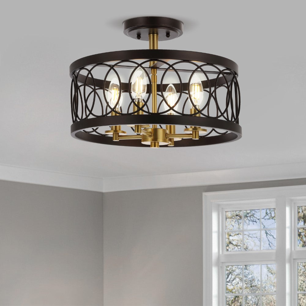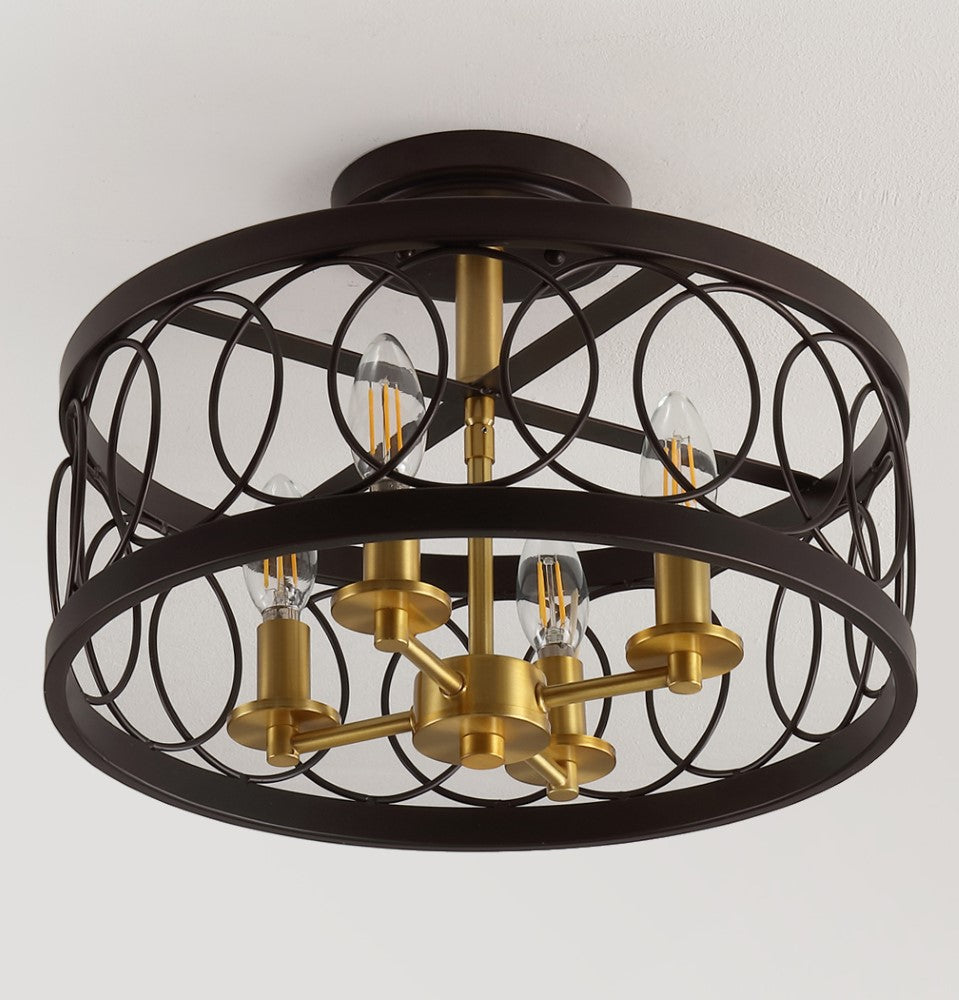 Overlapping circles create a beautiful cursive fretwork metal shade on this 4-light semi-flush mount fixture. More opulent than an exposed bulb, the metalwork on this style was designed by artisans that have been producing similar pendants for decades -- we had them update the scale to a statement making 15.5" diameter, and voila! A piece that would look elegant in a bedroom, gracious in a bathroom, or welcoming in an entry.