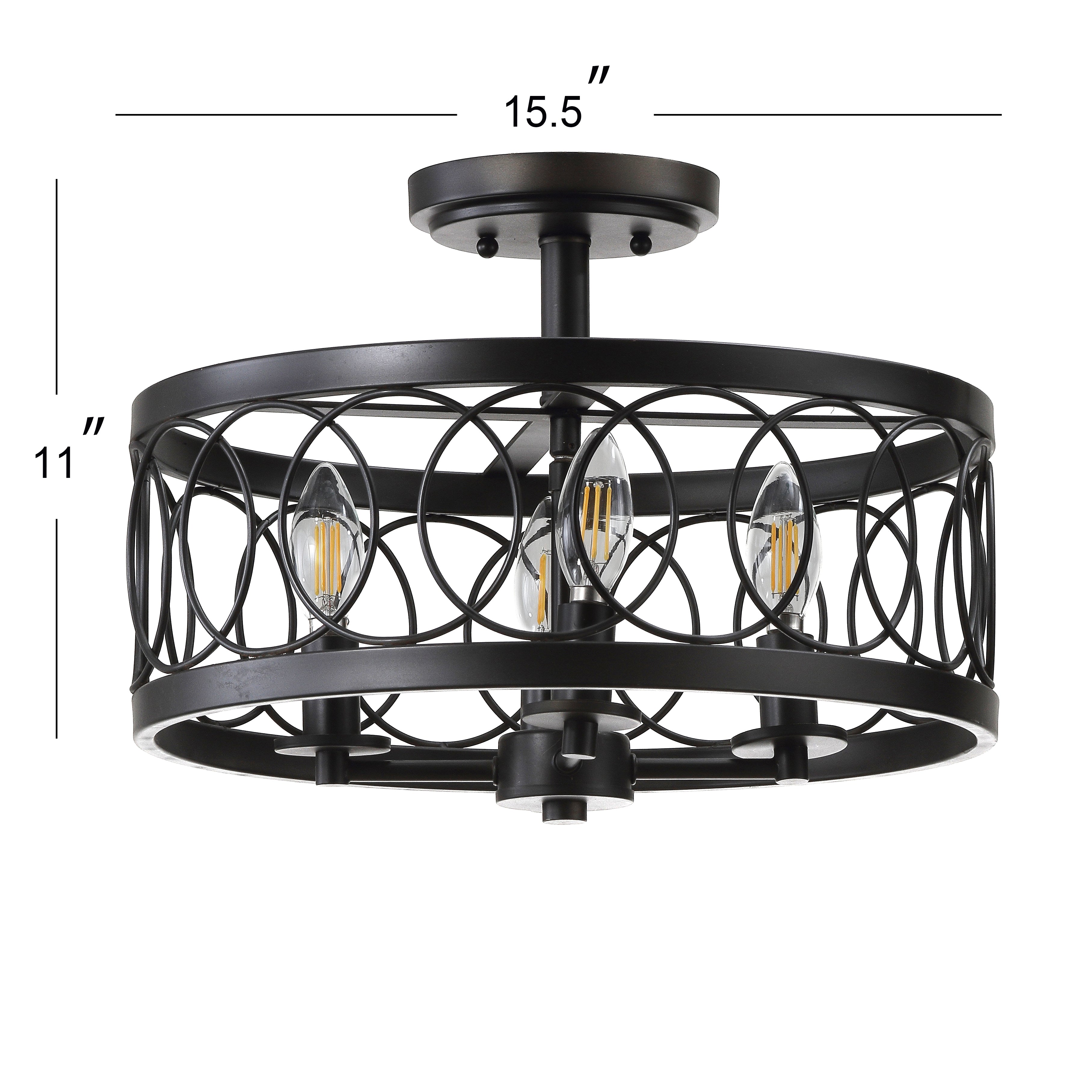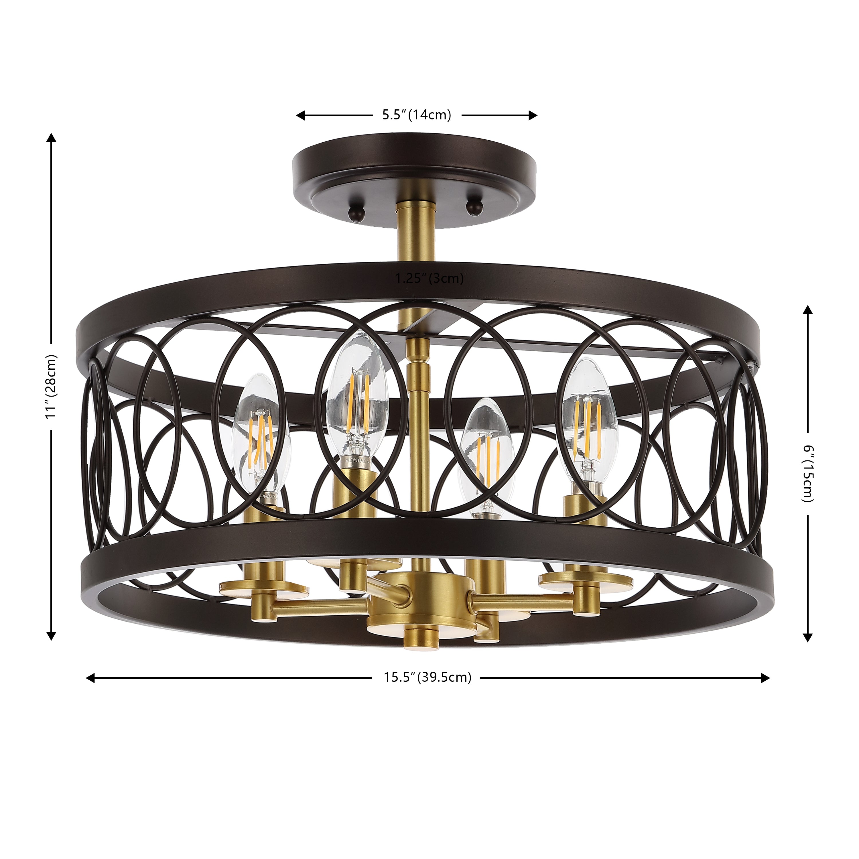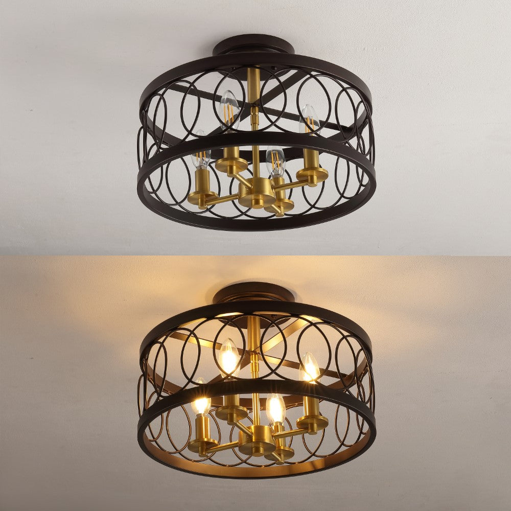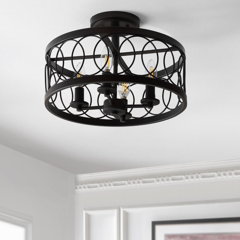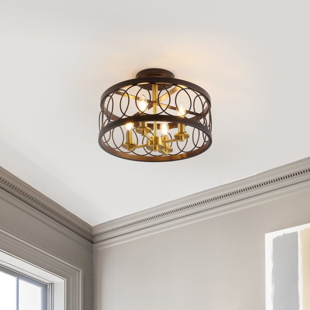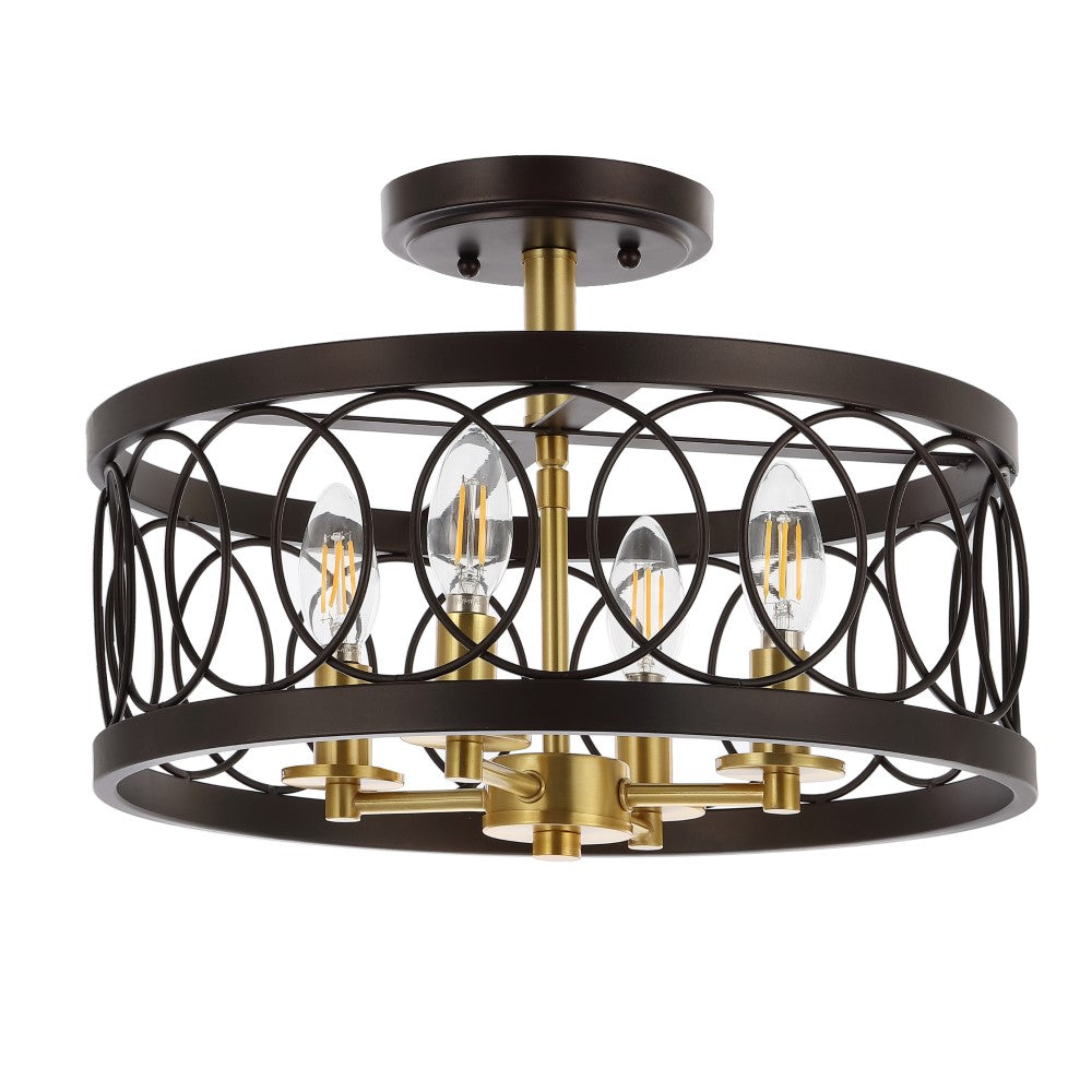 Overlapping circles create a beautiful cursive fretwork metal shade on this 4-light semi-flush mount fixture. More opulent than an exposed bulb, the metalwork on this style was designed by artisans that have been producing similar pendants for decades -- we had them update the scale to a statement making 15.5" diameter, and voila! A piece that would look elegant in a bedroom, gracious in a bathroom, or welcoming in an entry.