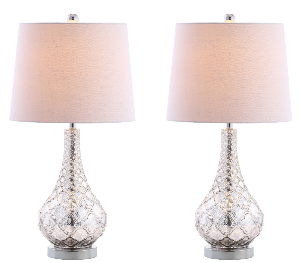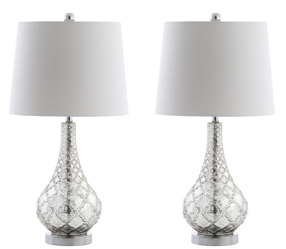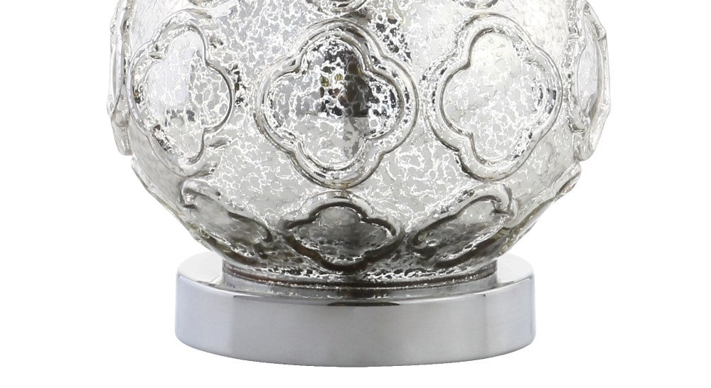 Featuring an antiqued silver finish applied within the lamp's body, this transitional table lamp boasts modern elegance to complement any contemporary decor. The slightly tapered linen drum shade is smooth and stylish, complementing the textured quatrefoil trellis pattern on the body. Finished in a silk-wrapped cord and chrome finial, it would be lovely on a bedside table or in a living room.