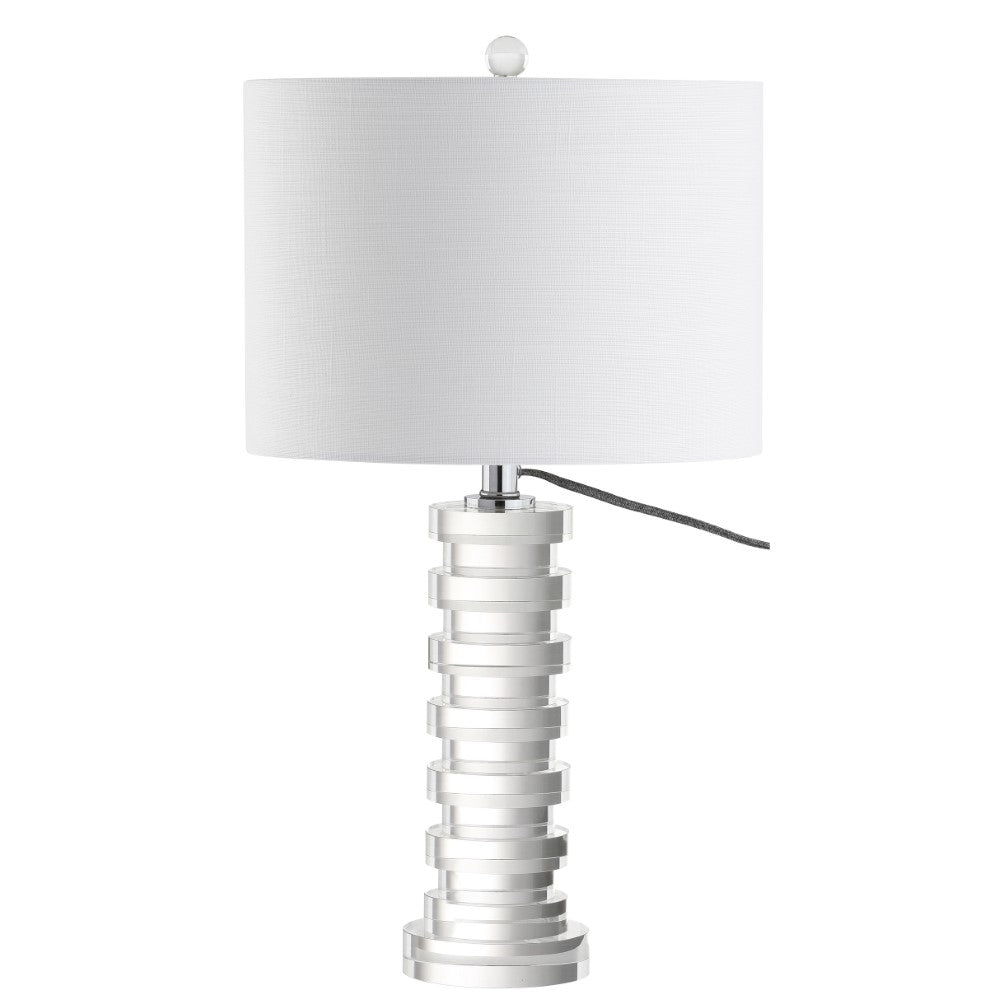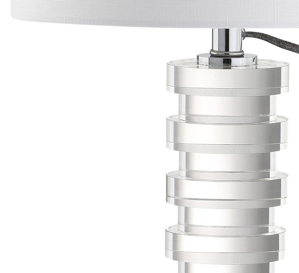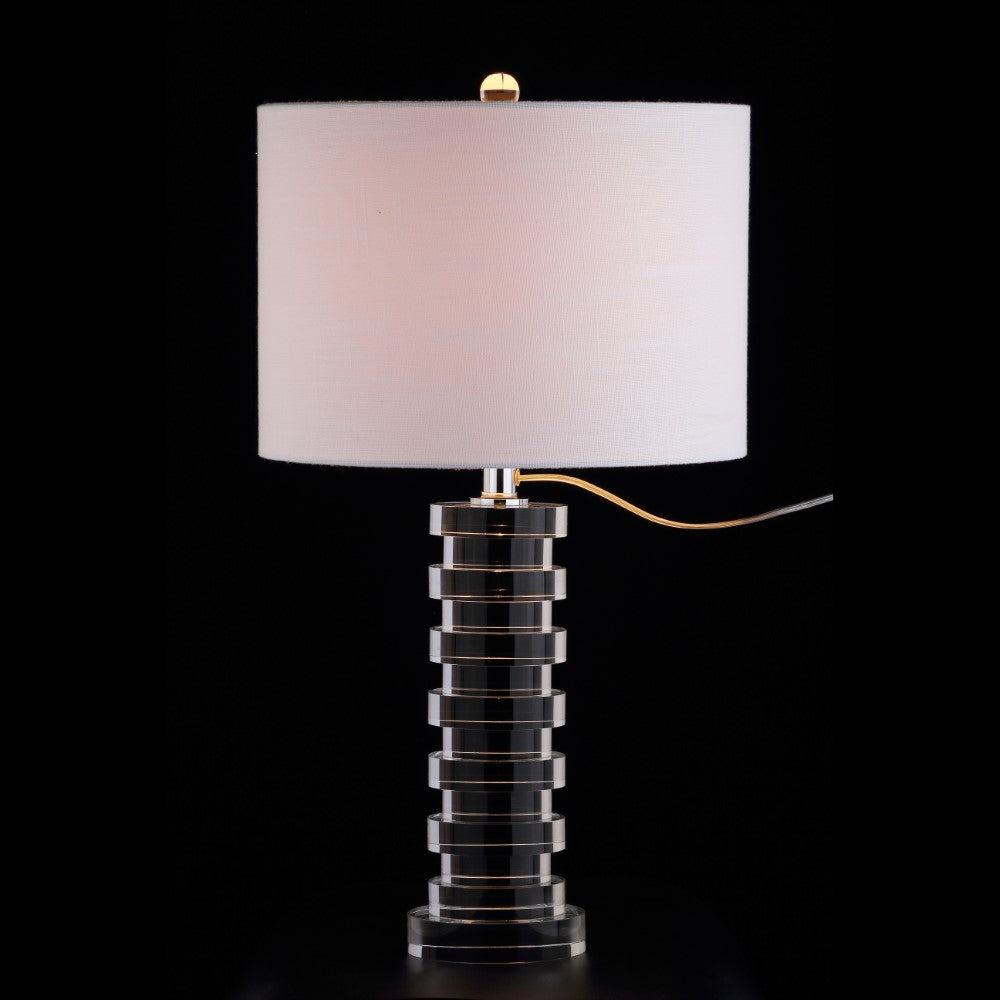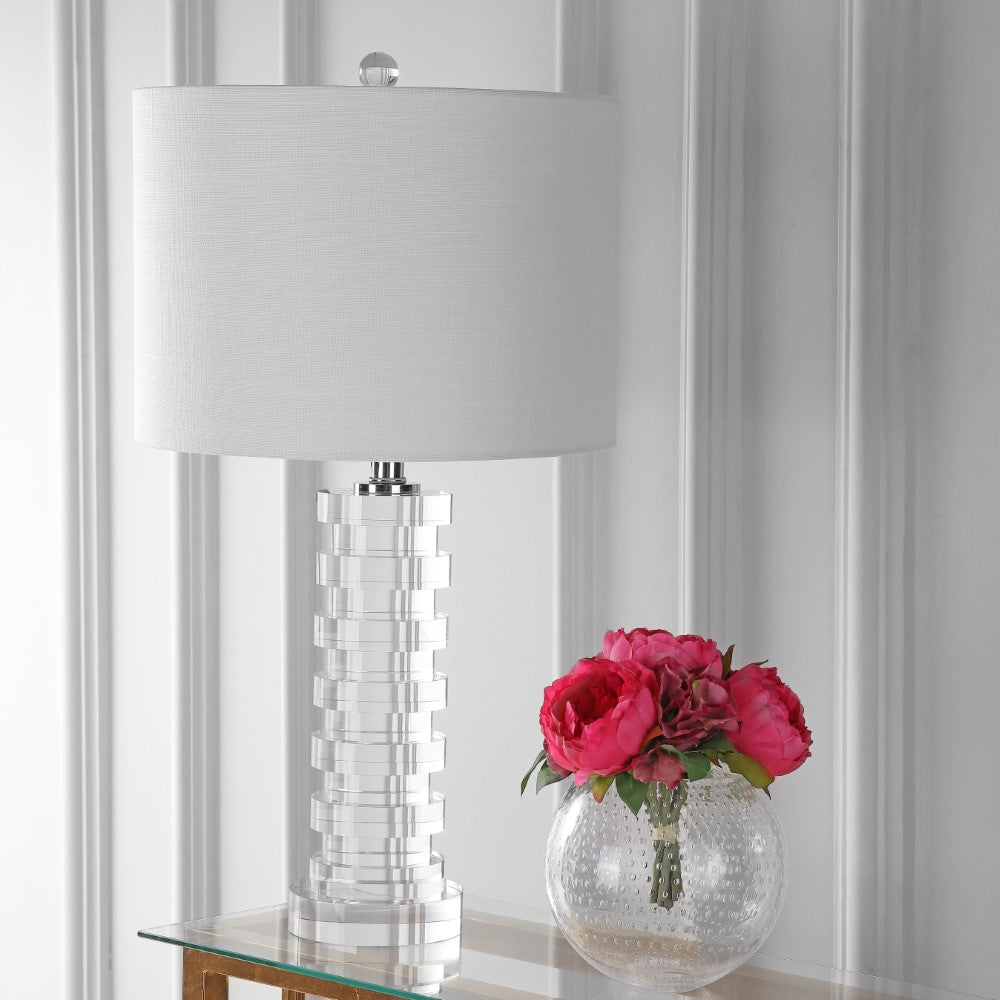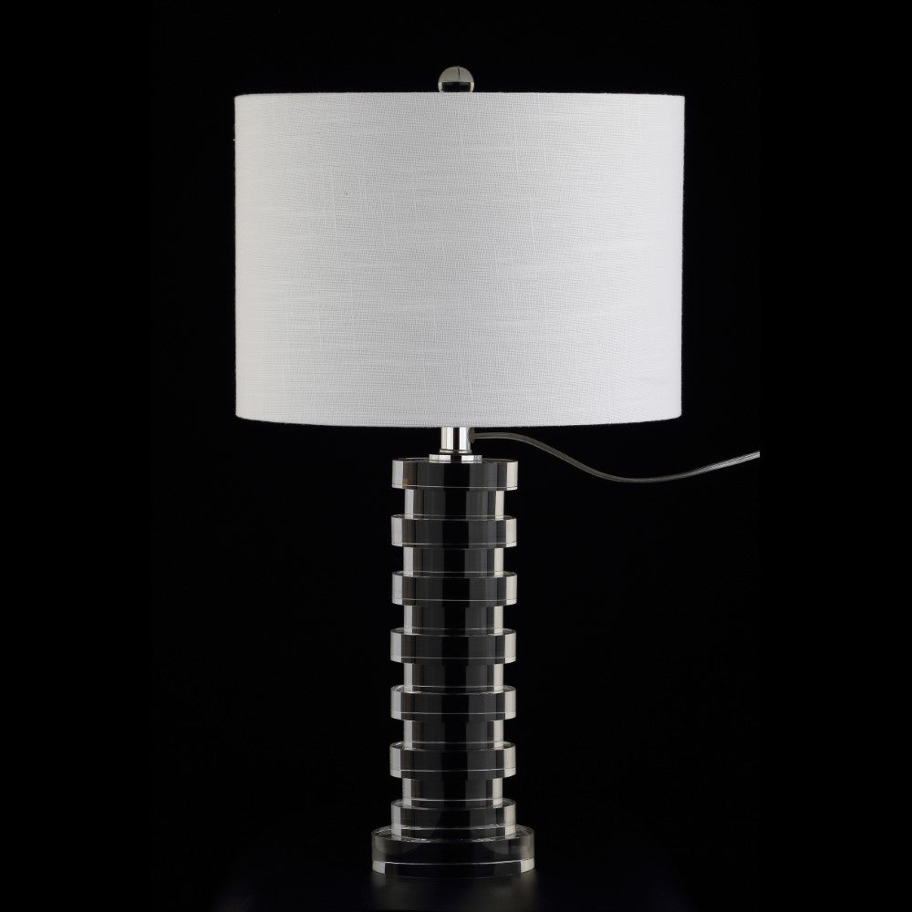 Staggered crystals in a geometric column base add modern elegance when illuminated beneath a classic linen drum shade. This crystal table lamp with chrome electrical fittings and a silk-wrapped cord is pretty enough to be the focal point of your room, but versatile enough to go anywhere. Standing at 25" tall, it's perfect proportions make it well suited to illuminate bedsides, console tables, or reading nooks.