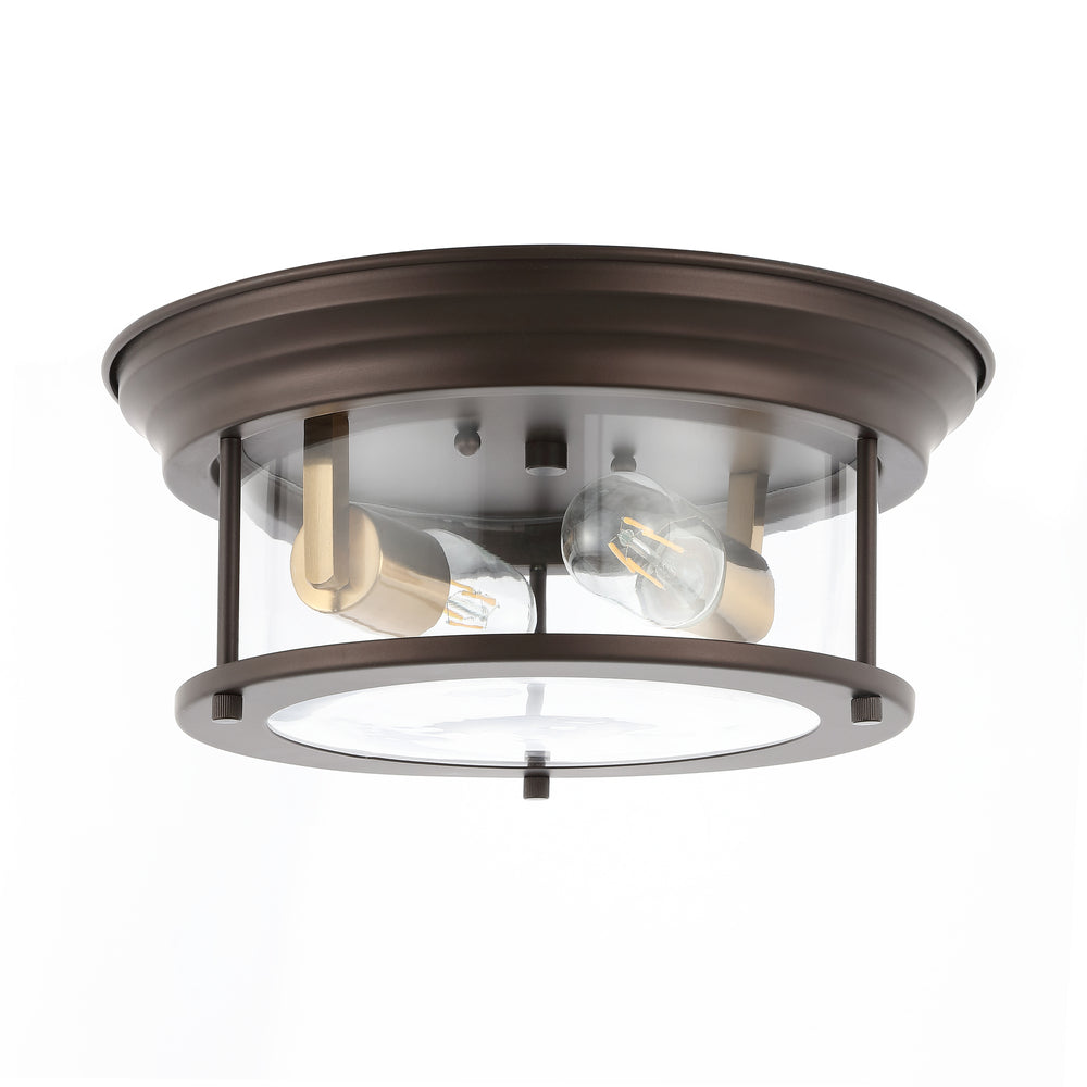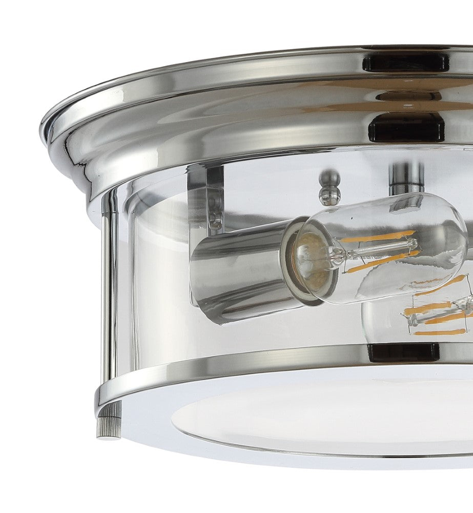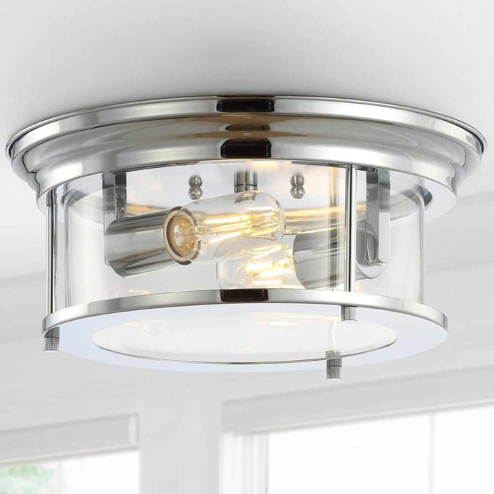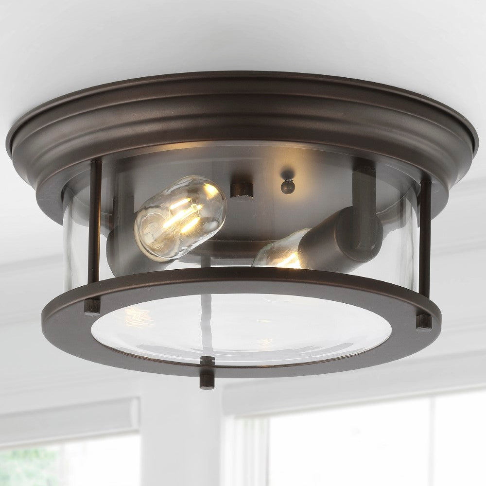 This flush mount puts a refined spin on an industrial-inspired design. The underside is sealed with white glass to cast a soft glow. With 2 light within, its a great fixture for kitchens, bathrooms, and dining areas needing dimmable light.