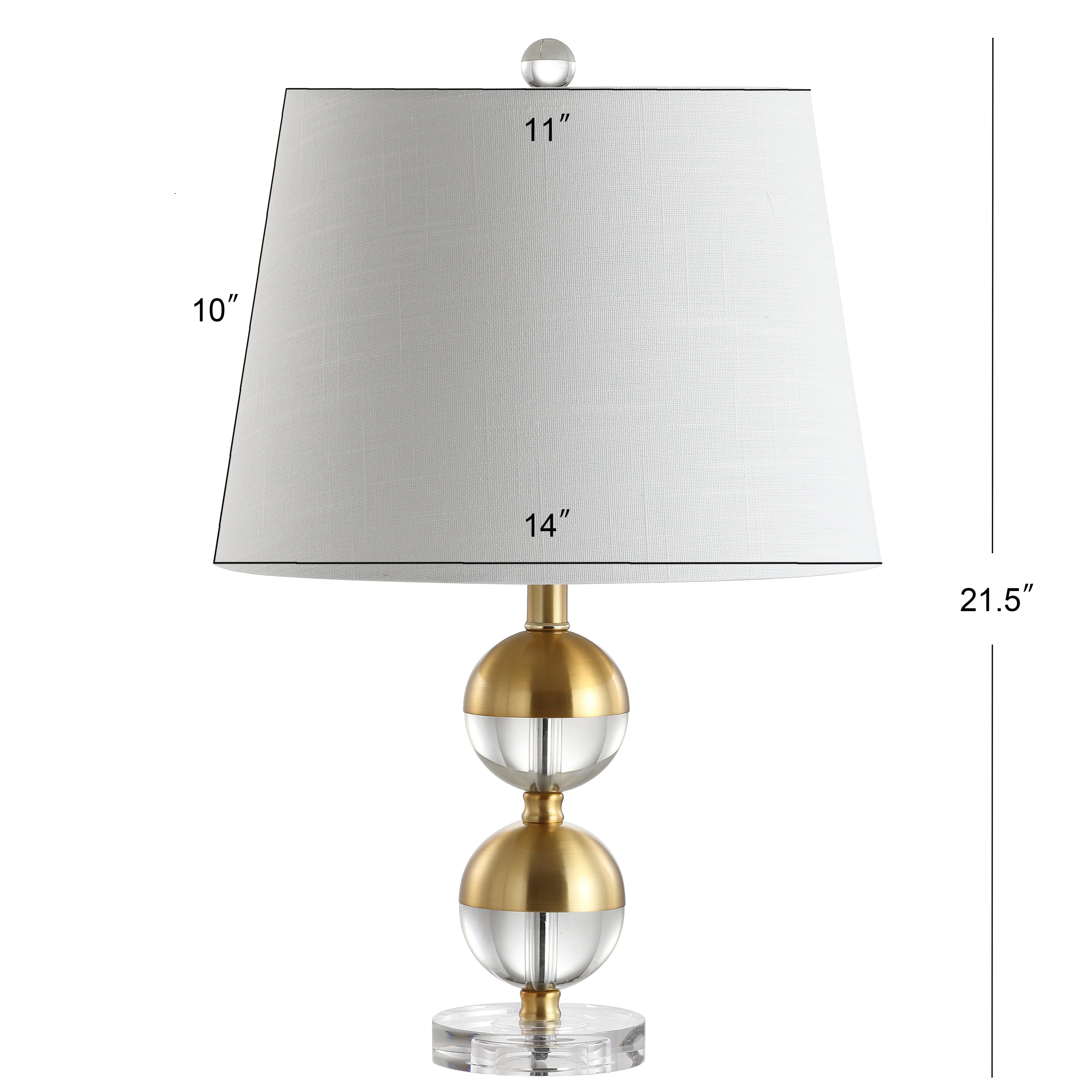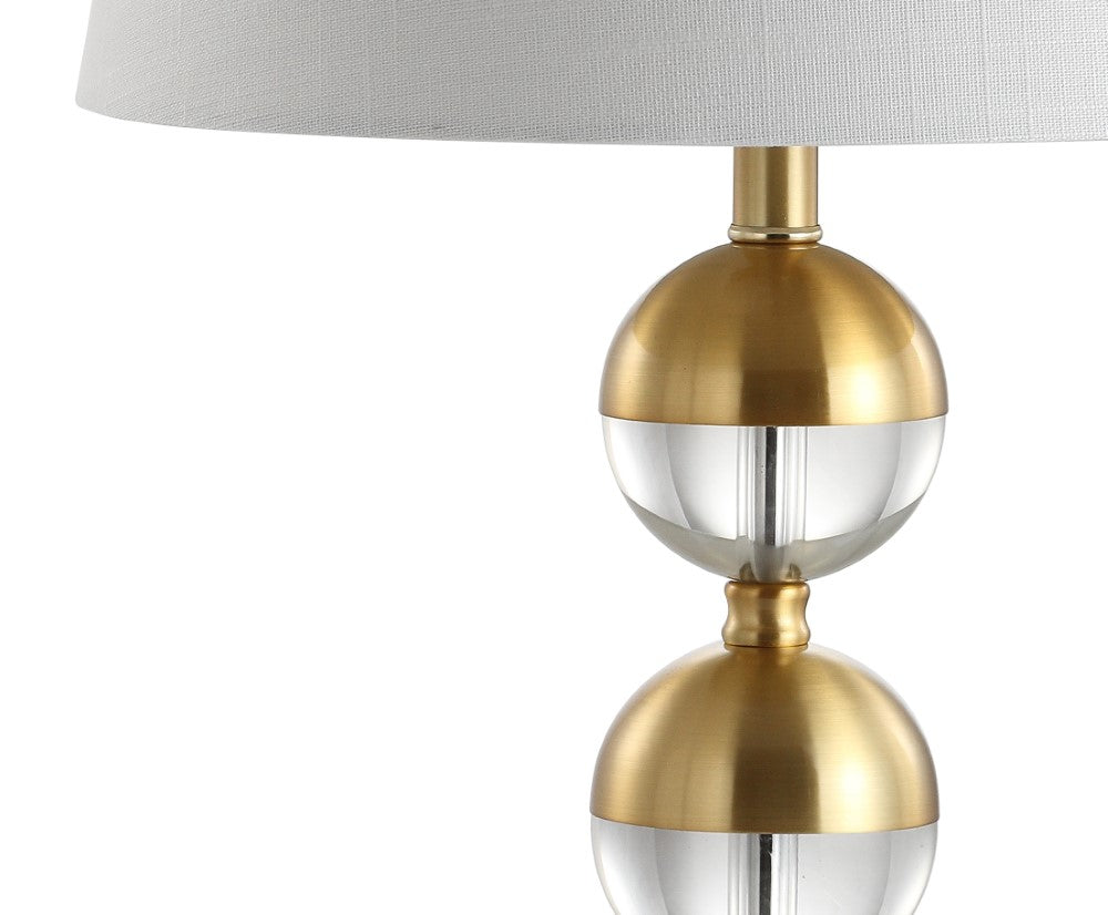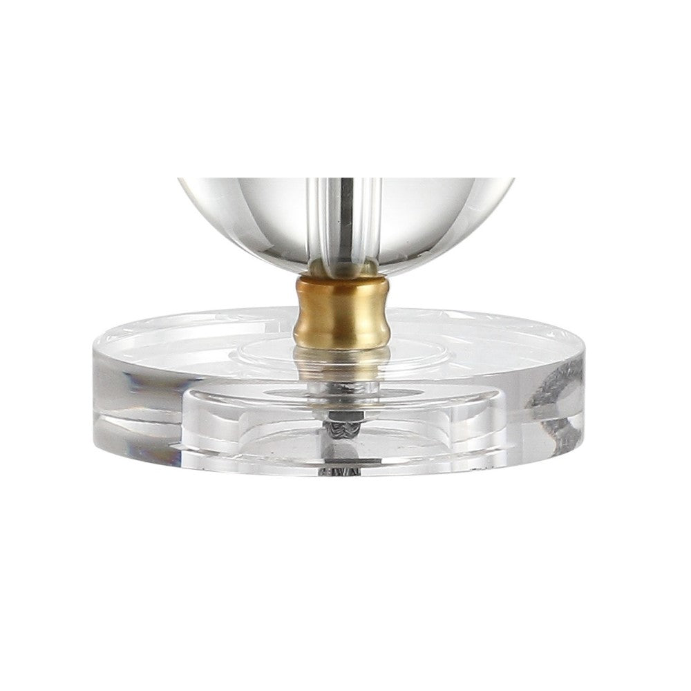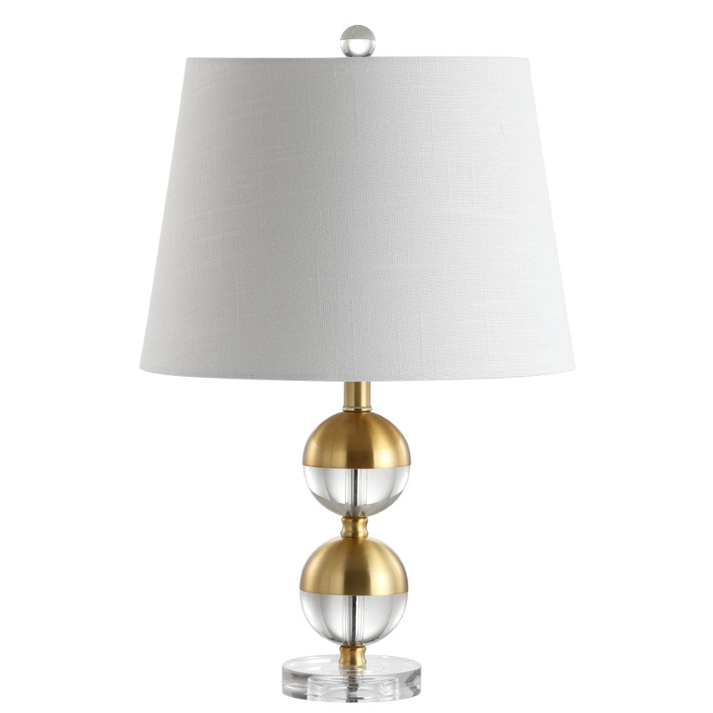 A duo of crystal and brass spheres adds visual interest to this 23" mini table lamp. Best suited for end tables and living spaces, its small size packs a lot of punch. When illuminated, the brass accents reflect warm light from the bulb above.
