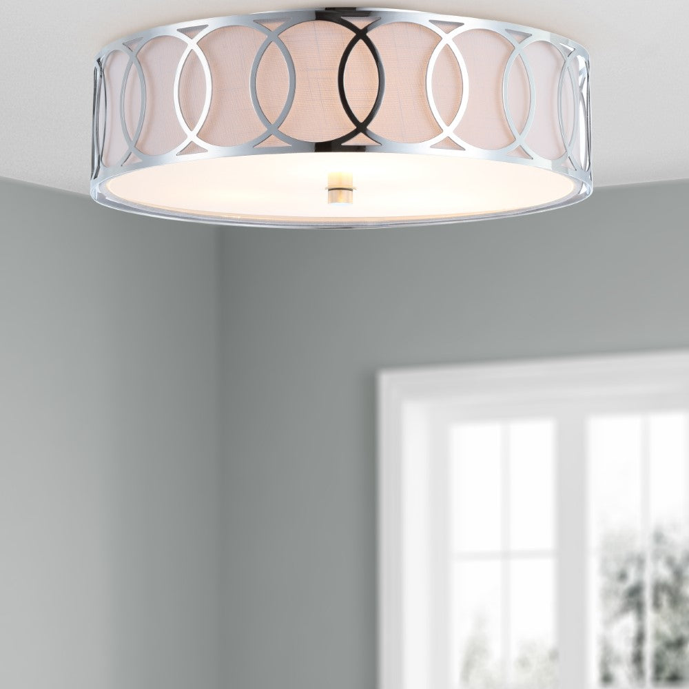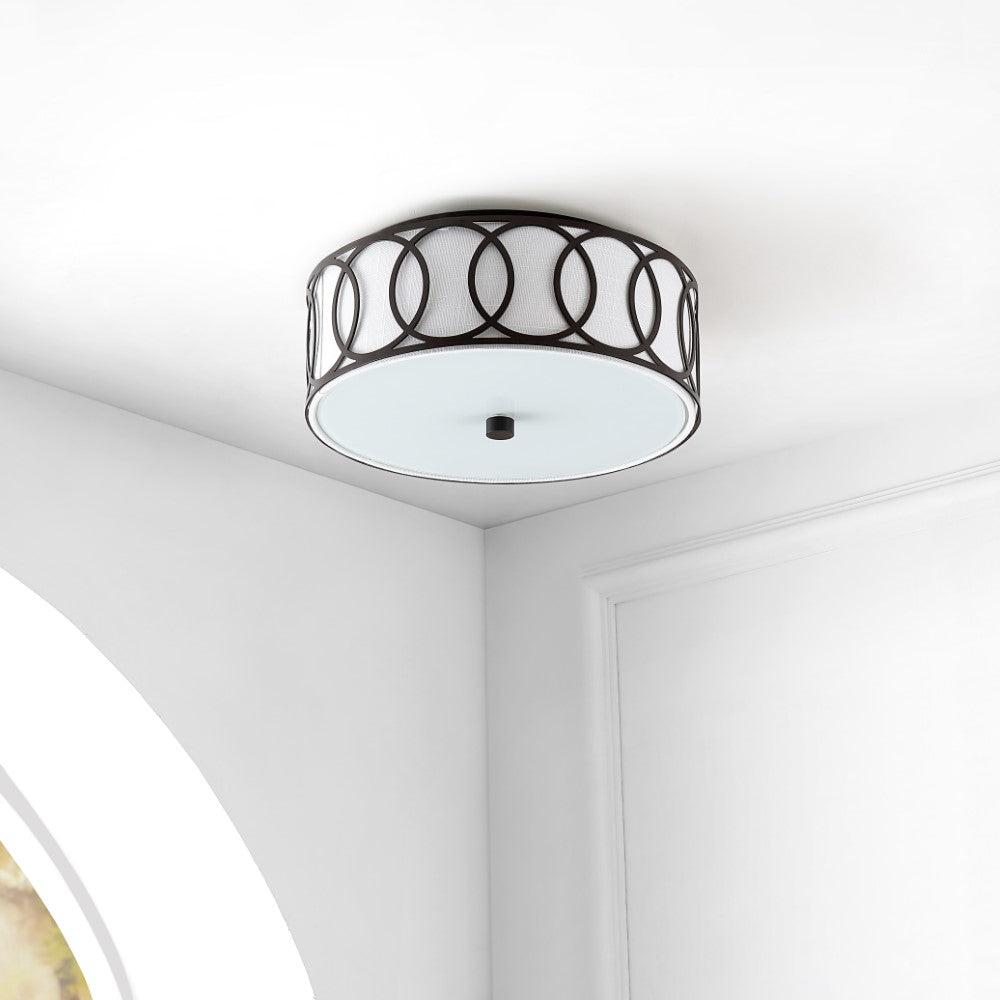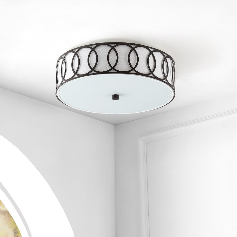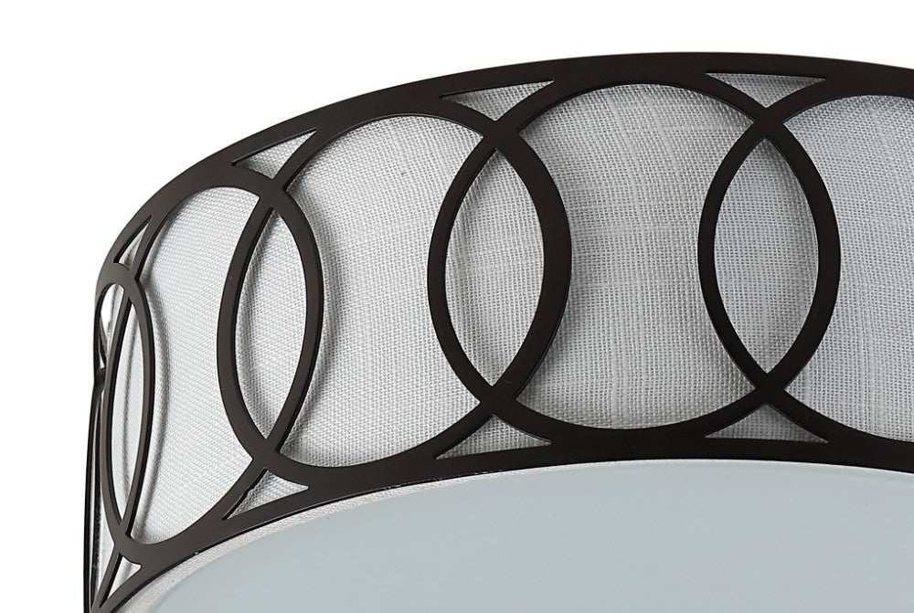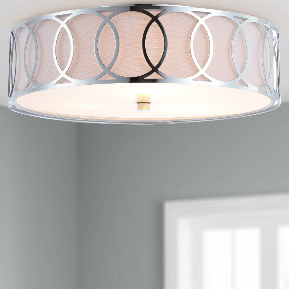 - This eye-catching flush mount ceiling light features overlapping circle fretwork surrounding a round linen shade