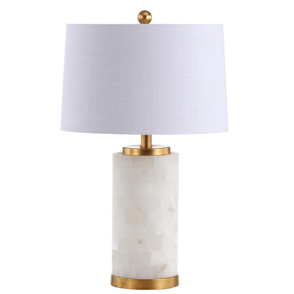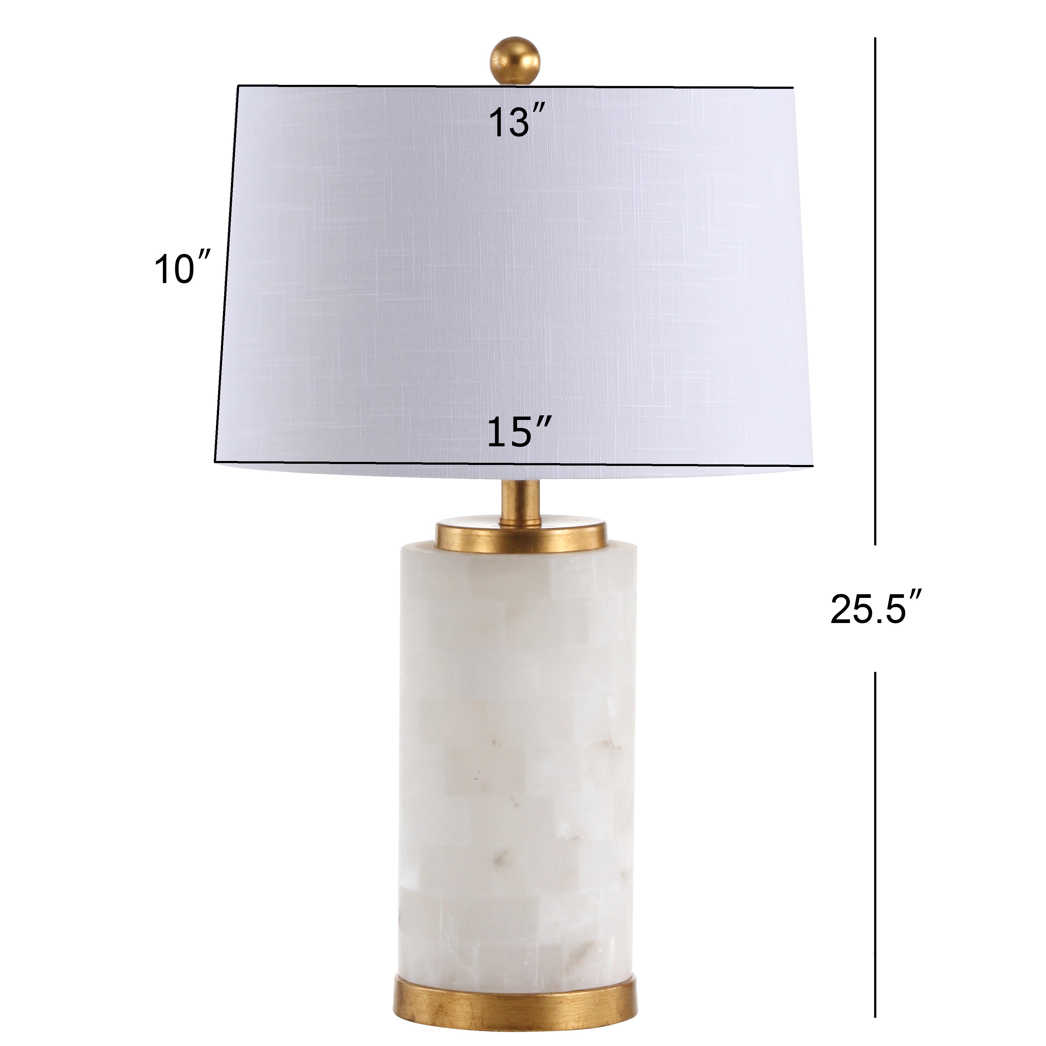 Made from real stone, our alabaster lamp’s geometric lines are accented with metallic gold. This modern lamp features a built-in accent light; a low-watt LED bulb inside the base gives the alabaster a soft glow. Quality touches include a empire linen shade, gold finial and silk-wrapped cord.