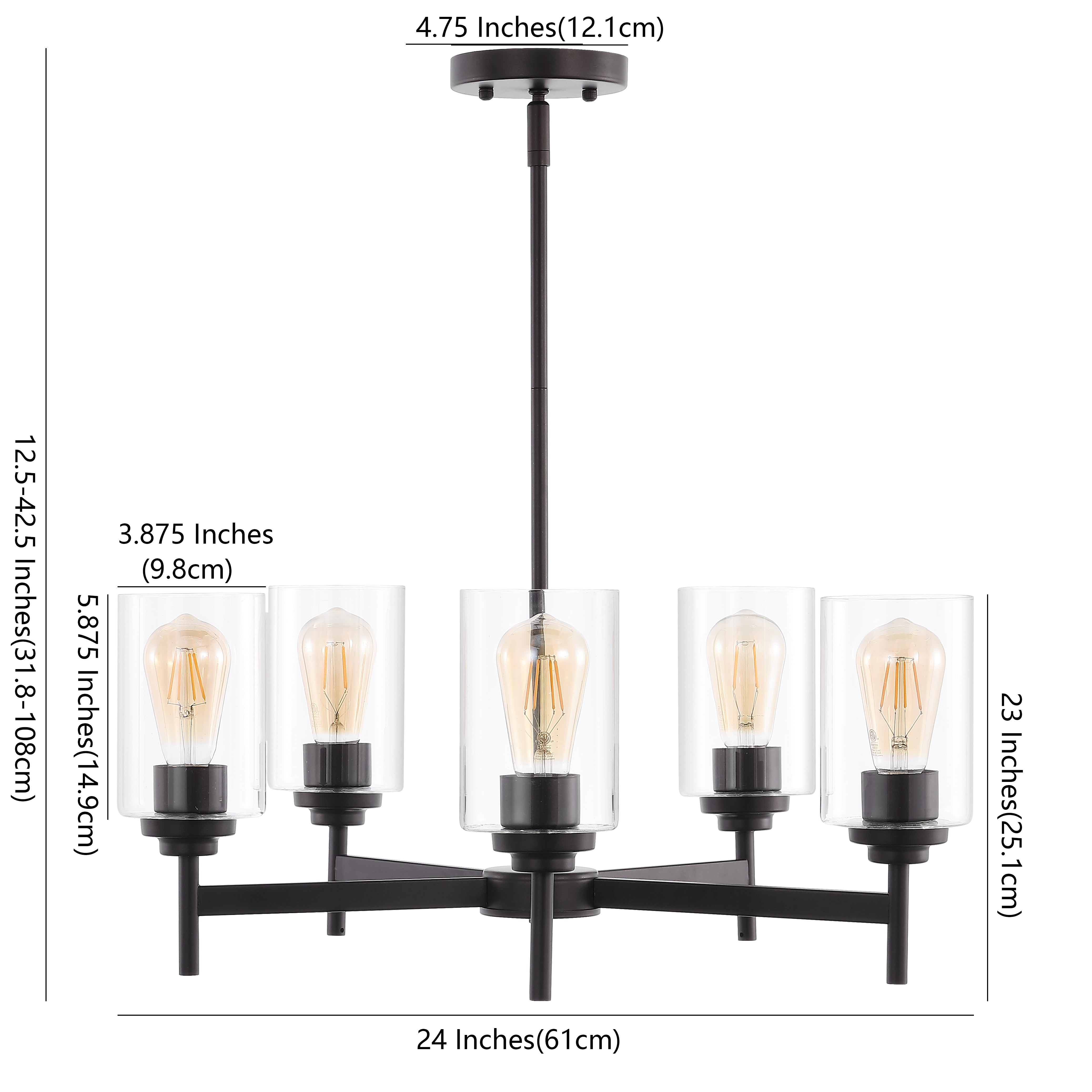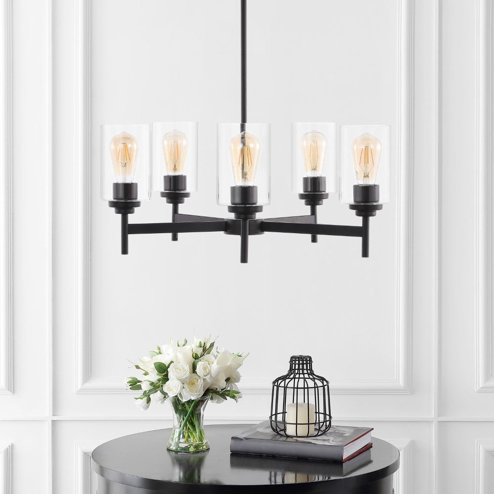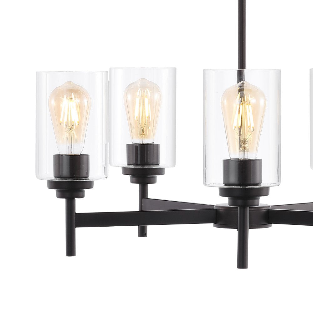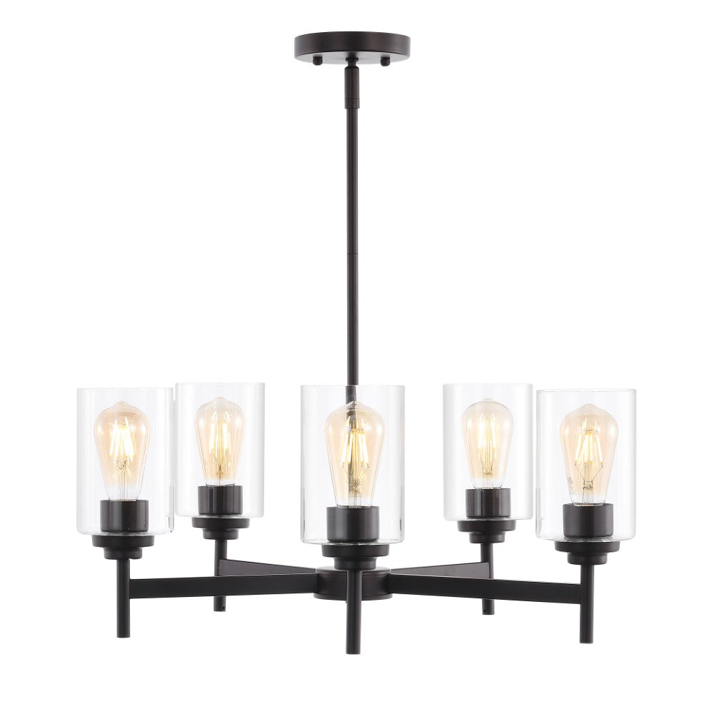 Add vintage flair with our classic industrial-style ceiling fixture. Five Edison-style LED bulbs are encased in clear glass cylinders to provide plenty of light. Clean lines and a bronze finish add a rustic-modern touch to a kitchen, dining room, or entry.