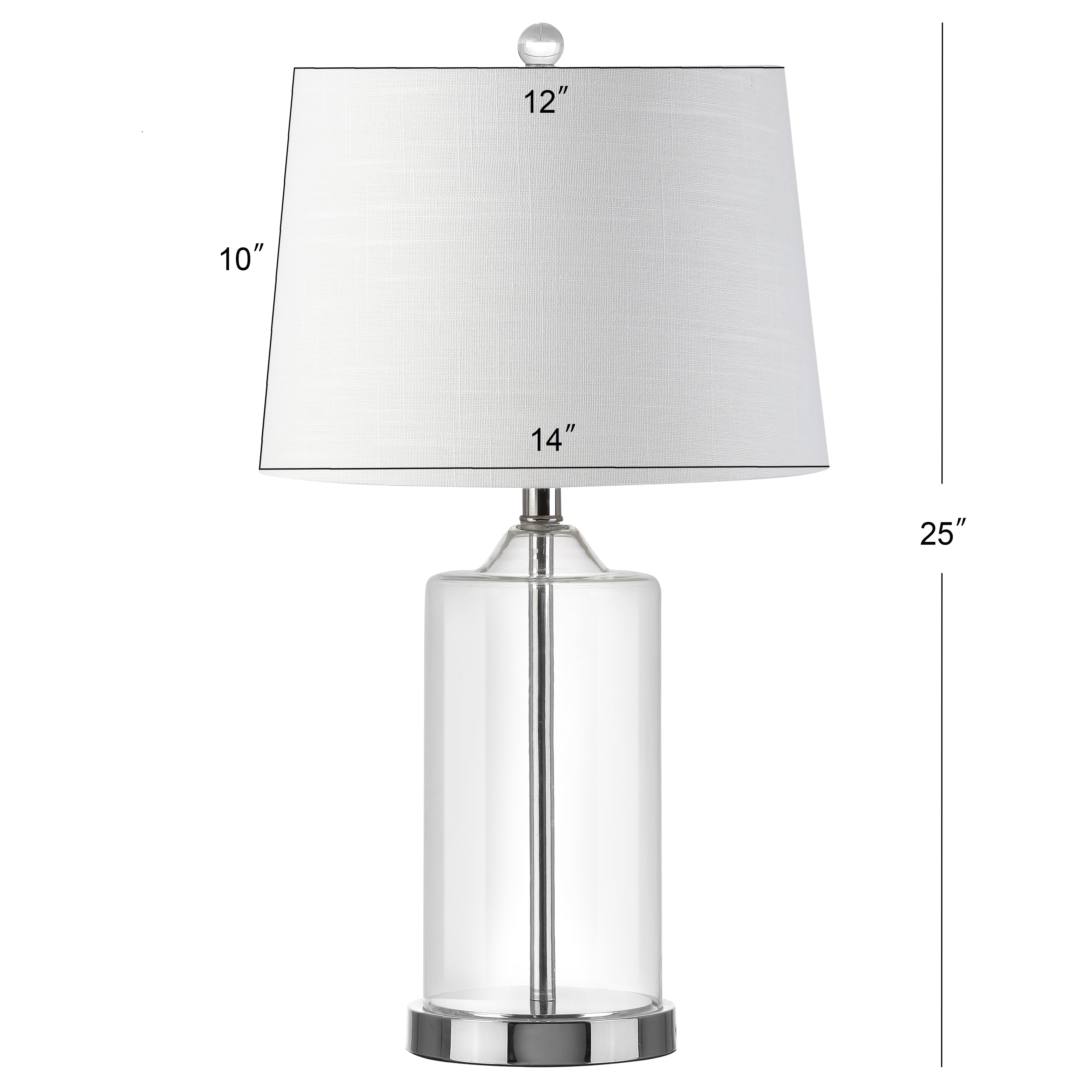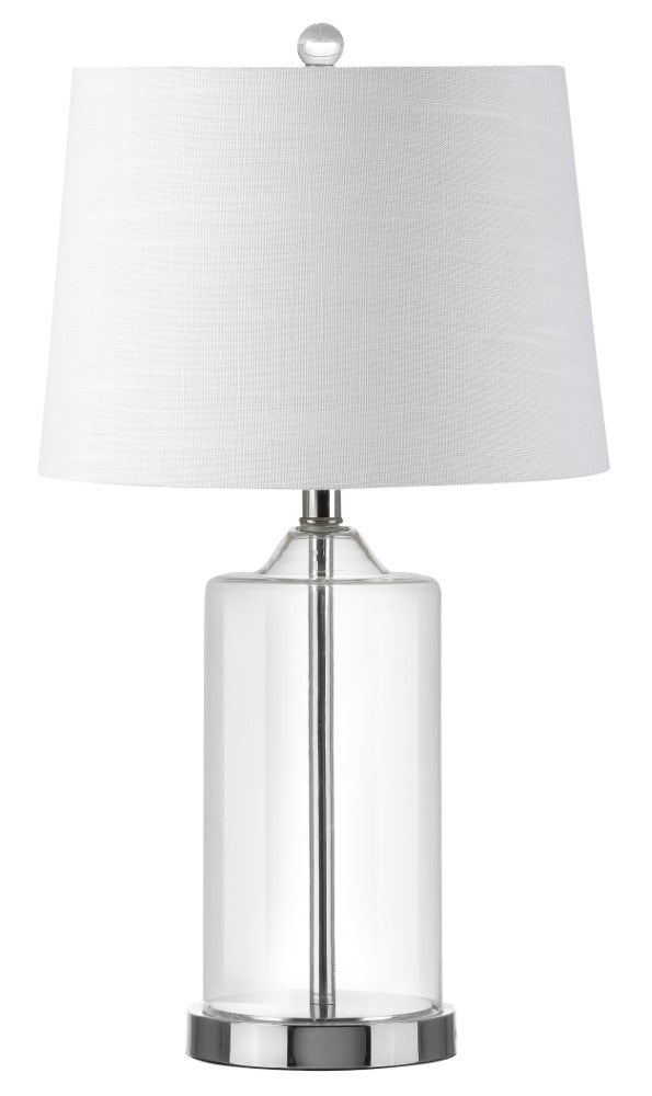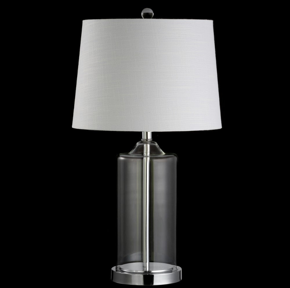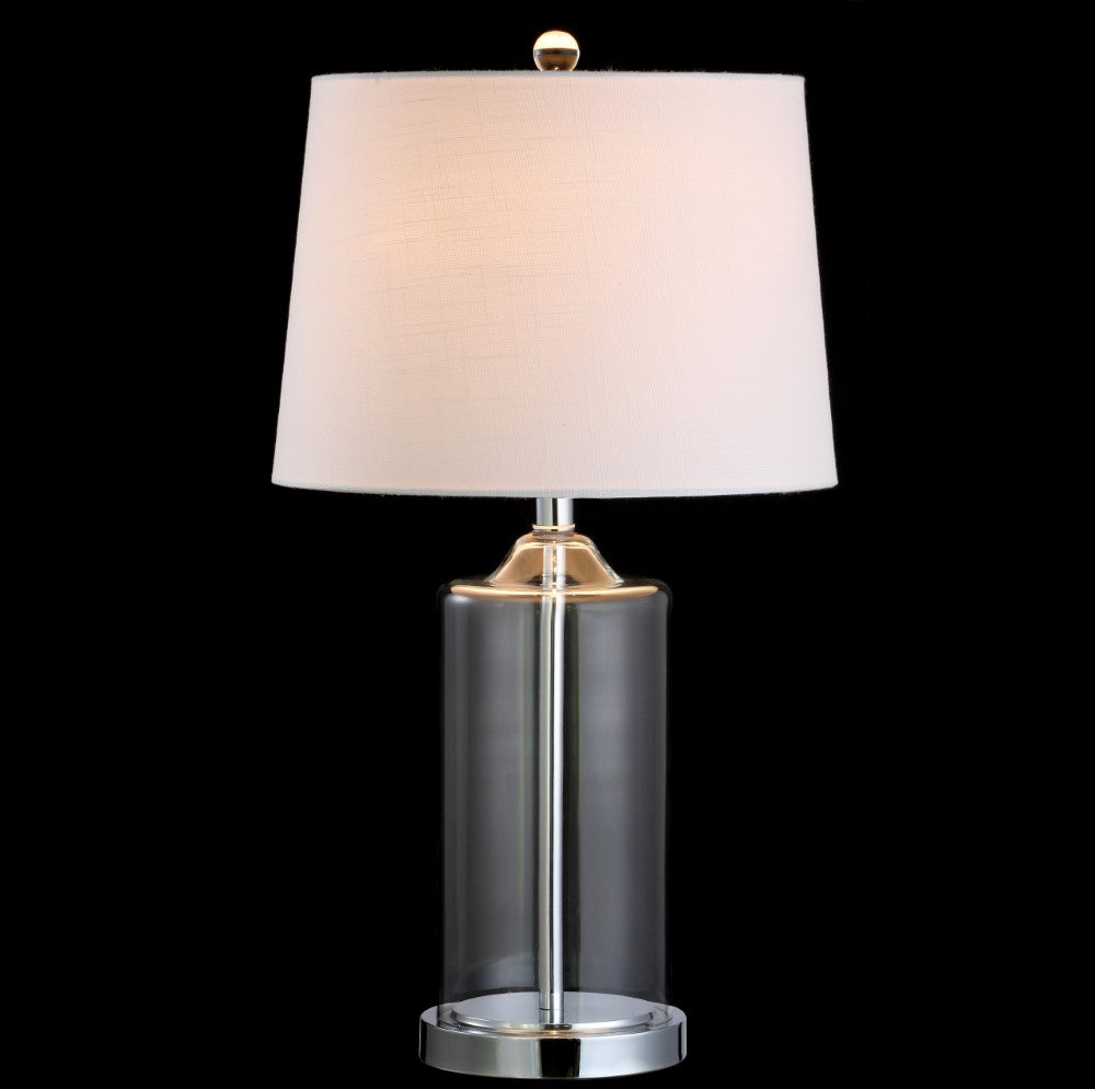 This table lamp radiates modern elegance with its glass base and polished nickel accents. Simple, but stylish, the details -- an acrylic finial, silk-wrapped cord, and rotary switch -- exude luxury. A linen shade completes the design.