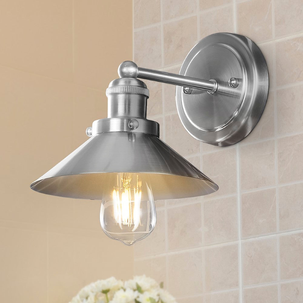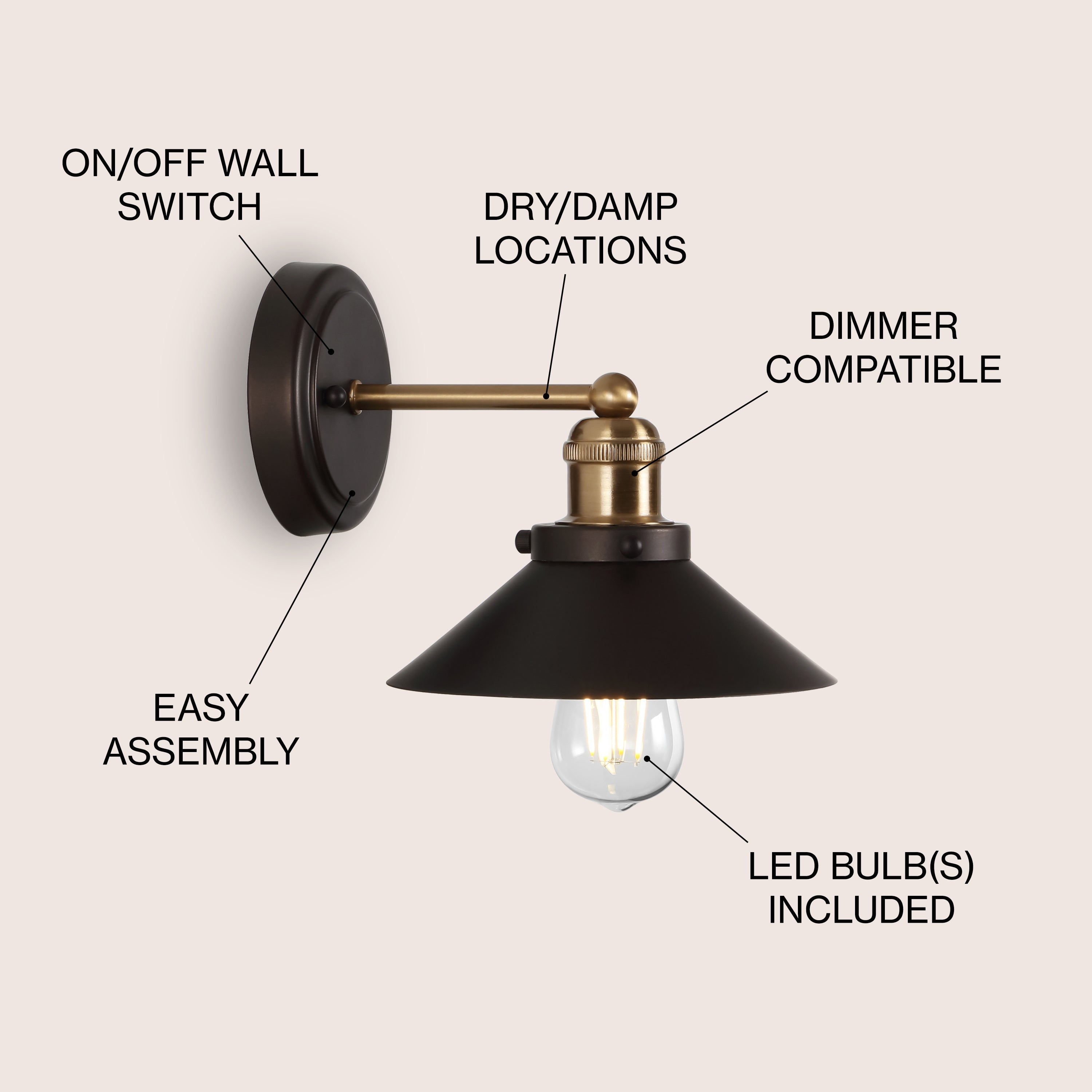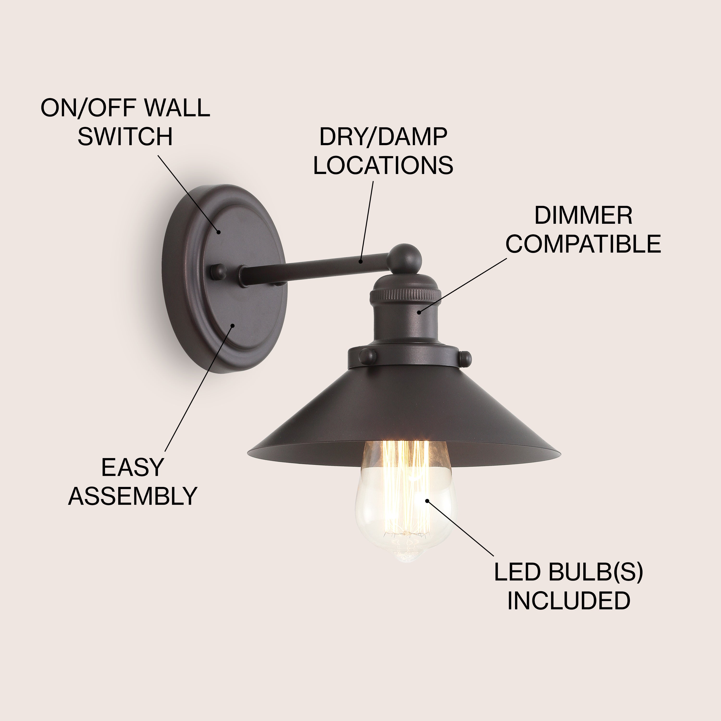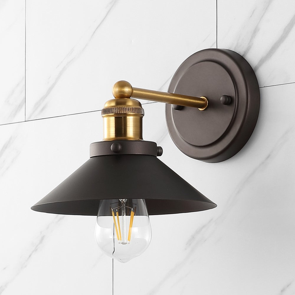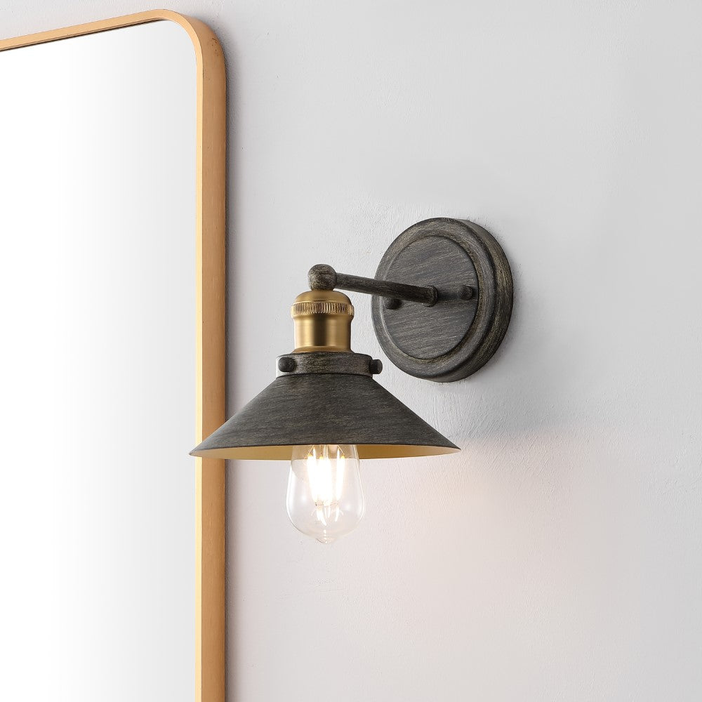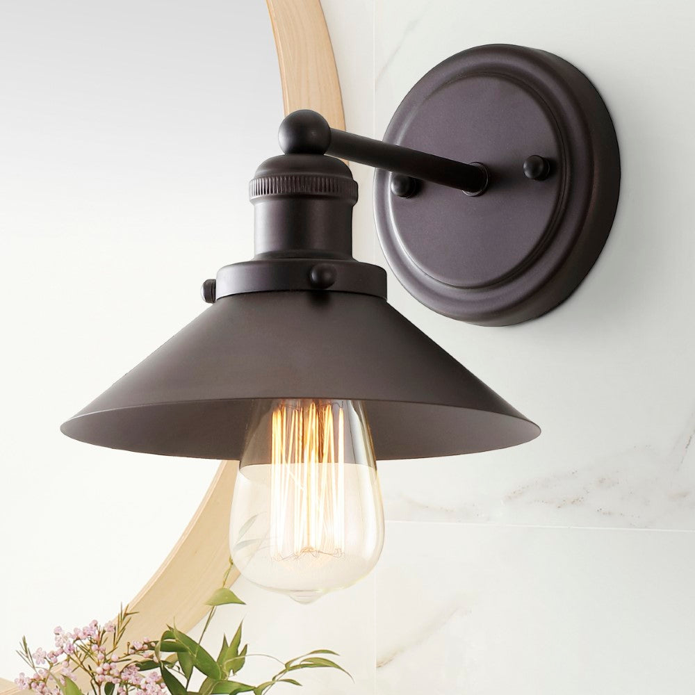 Like a classic barn light but in a modern shape and smaller scale, this classic design features a metal cone shade that conceals the top half of the bulb -- perfect for a clean, industrial look. In a matte orb finish, this sconce is perfectly at home on either side of a bathroom mirror or as extra lighting in kitchens, where your hardware truly shines. Also available in multi-light configurations, the geometric shape adds elegant interest to any space.