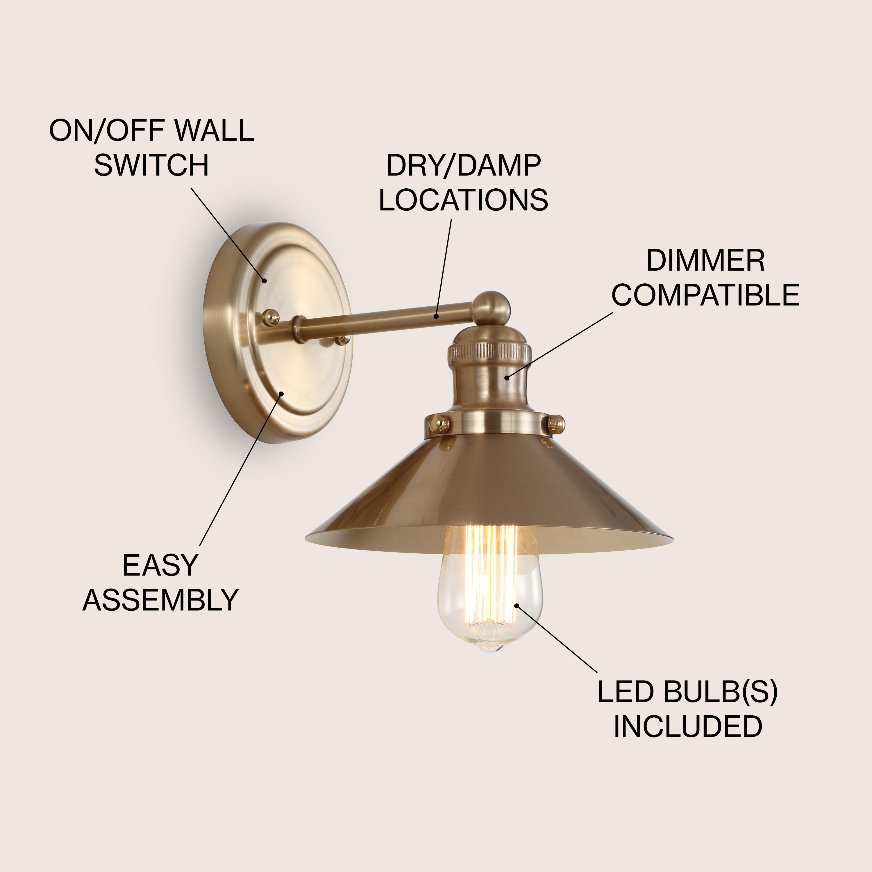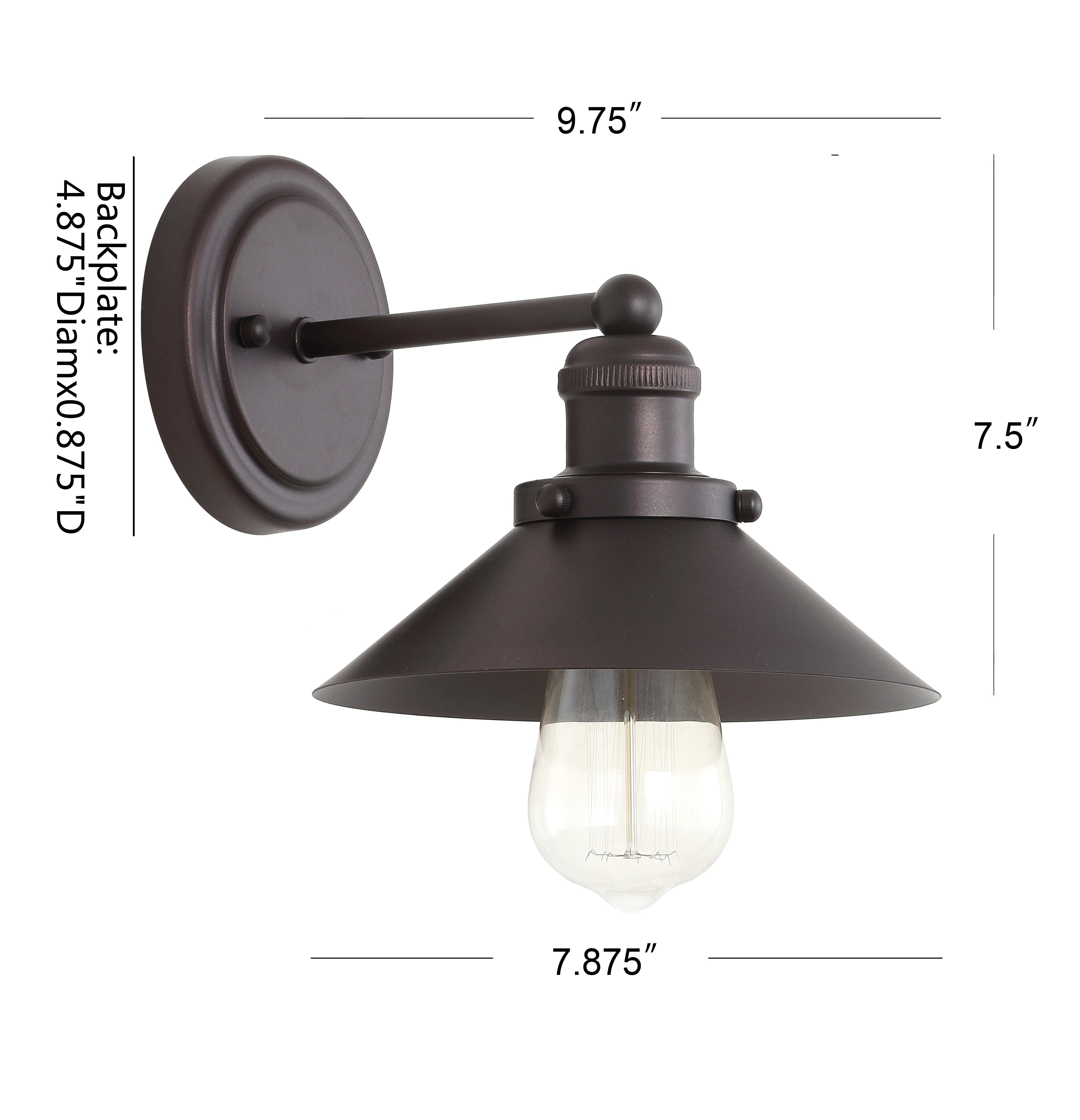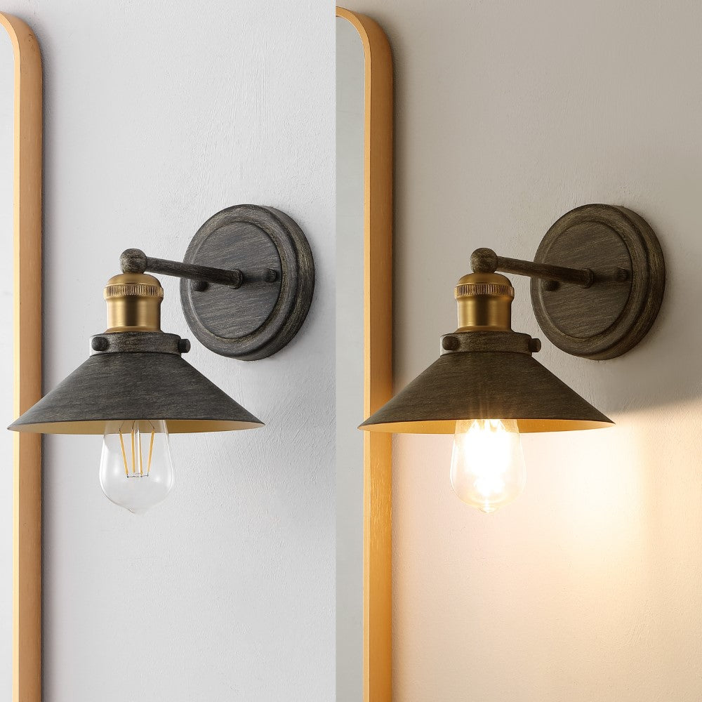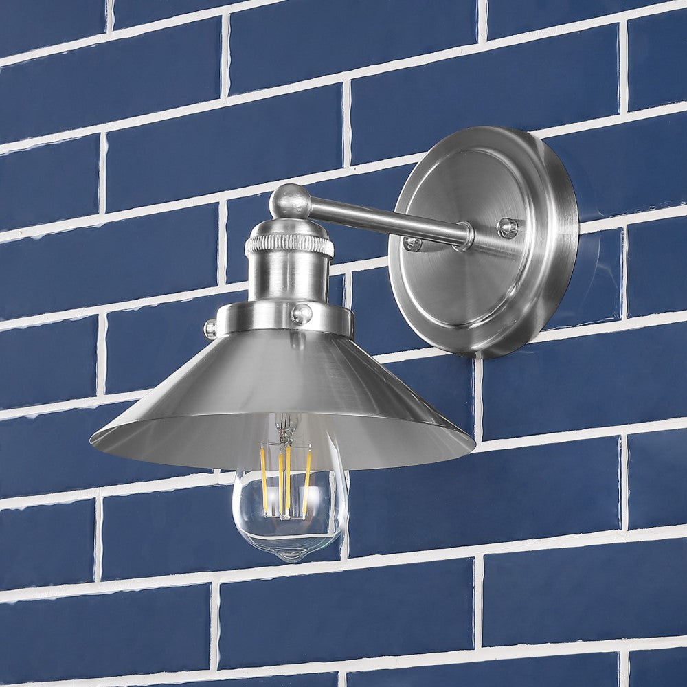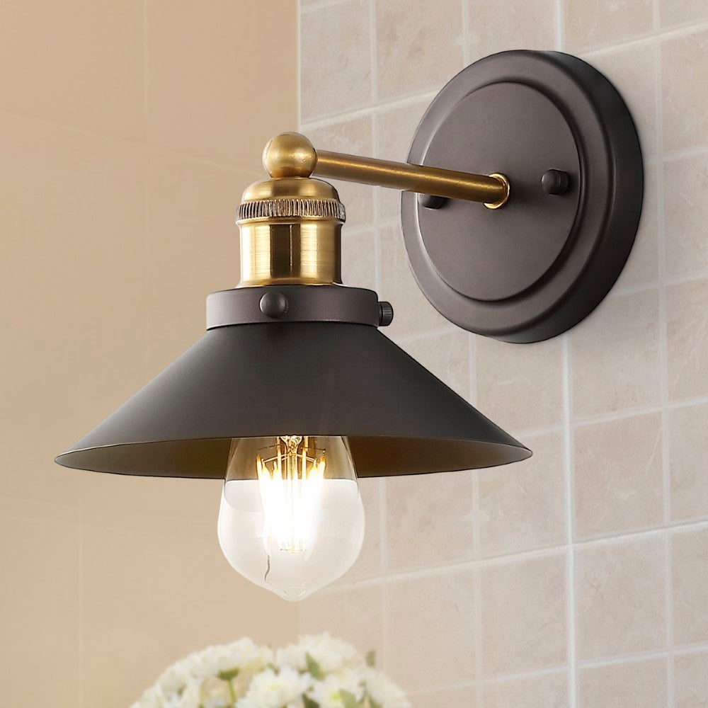 Like a classic barn light but in a modern shape and smaller scale, this classic design features a metal cone shade that conceals the top half of the bulb -- perfect for a clean, industrial look. In a matte orb finish, this sconce is perfectly at home on either side of a bathroom mirror or as extra lighting in kitchens, where your hardware truly shines. Also available in multi-light configurations, the geometric shape adds elegant interest to any space.