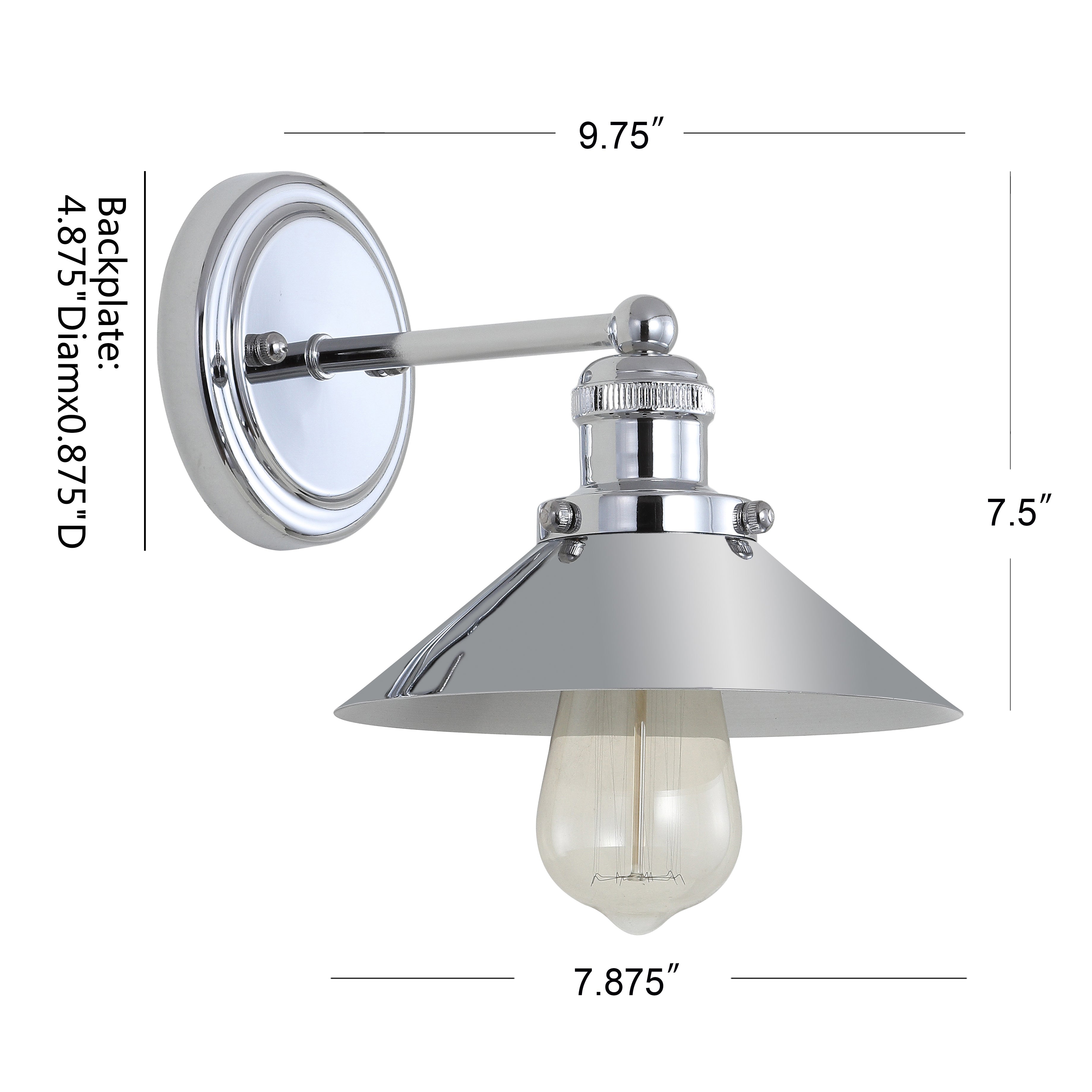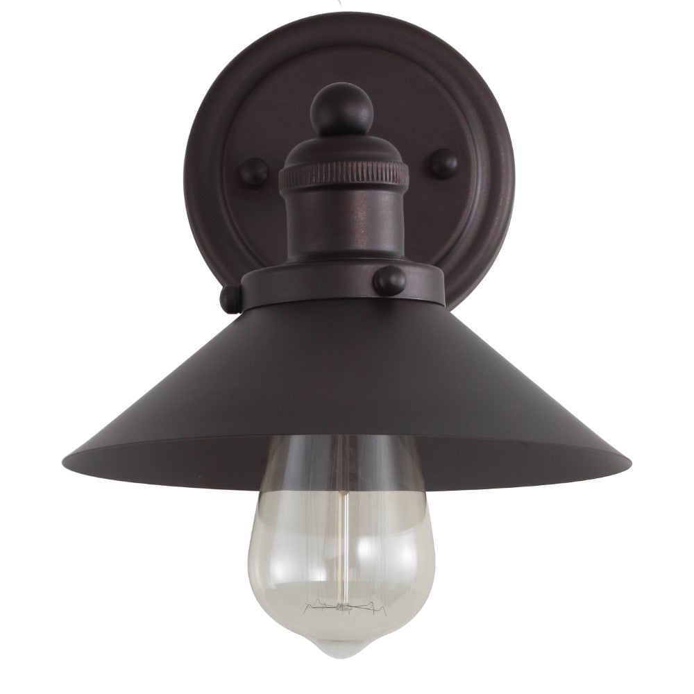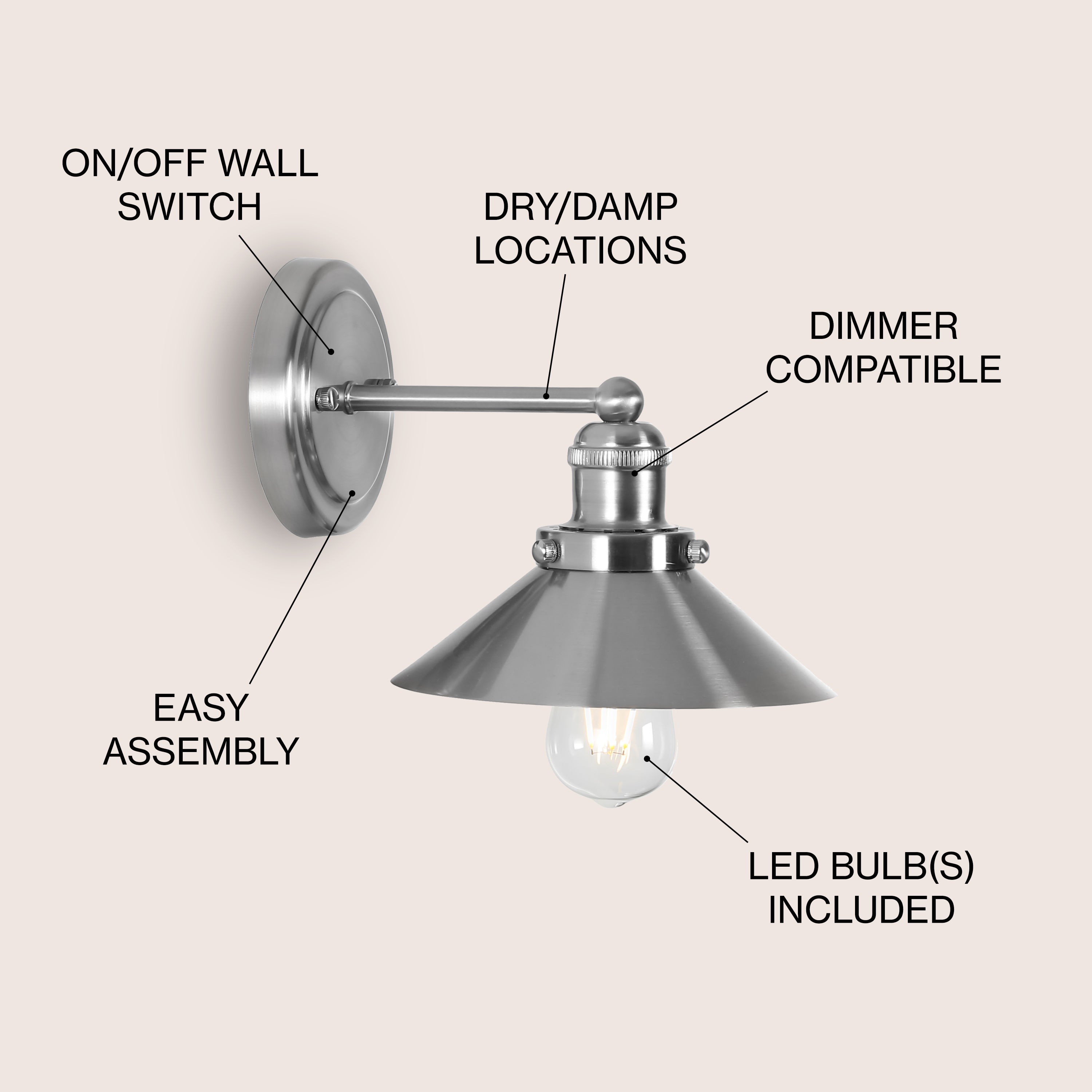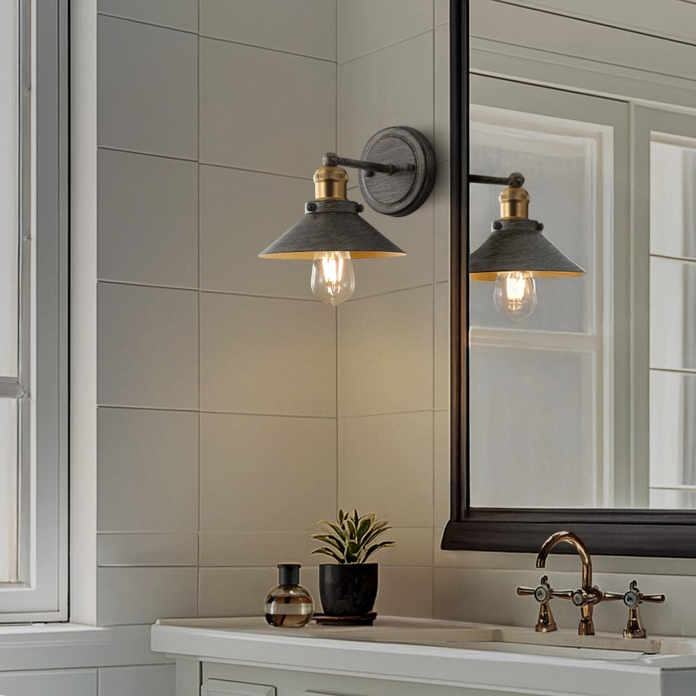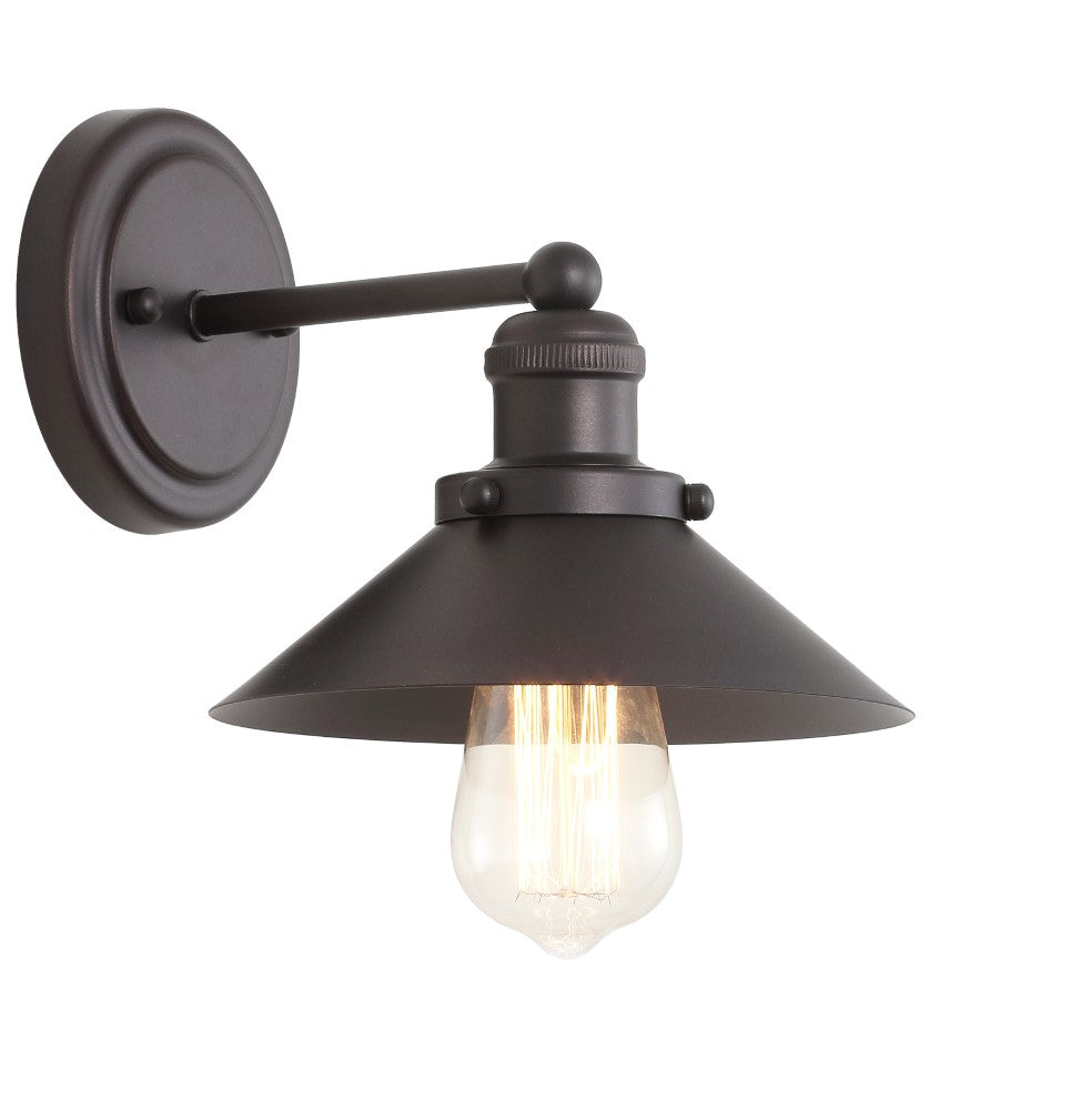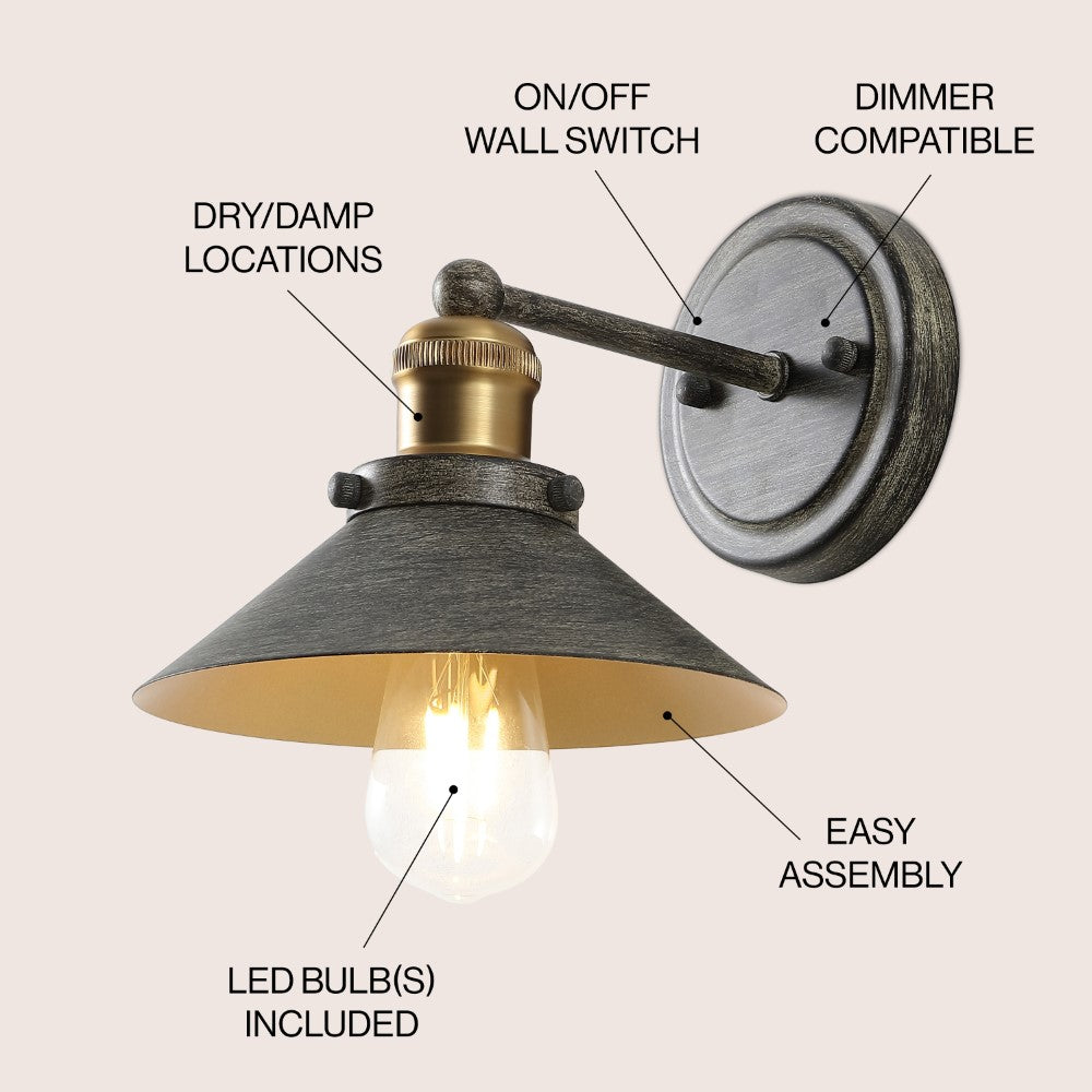 Like a classic barn light but in a modern shape and smaller scale, this classic design features a metal cone shade that conceals the top half of the bulb -- perfect for a clean, industrial look. In a matte orb finish, this sconce is perfectly at home on either side of a bathroom mirror or as extra lighting in kitchens, where your hardware truly shines. Also available in multi-light configurations, the geometric shape adds elegant interest to any space.