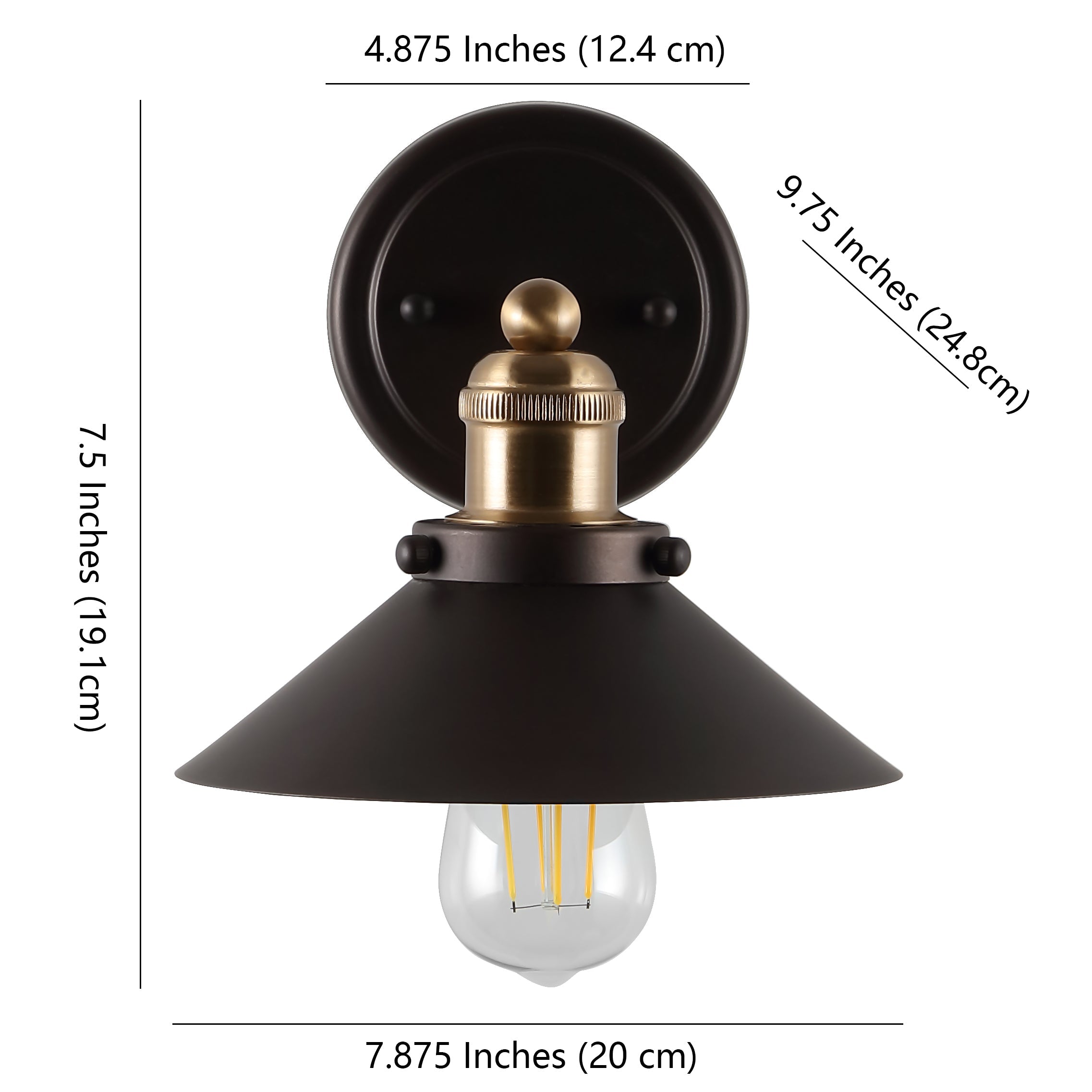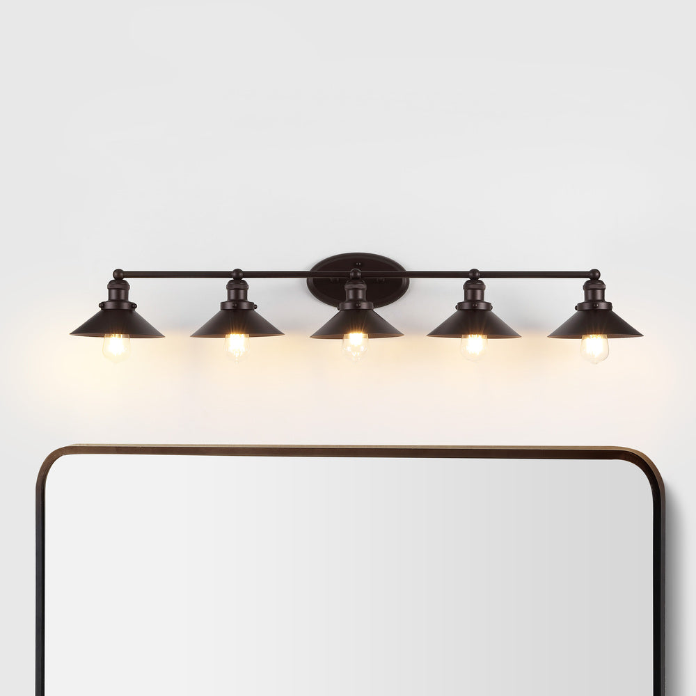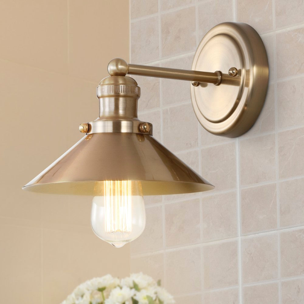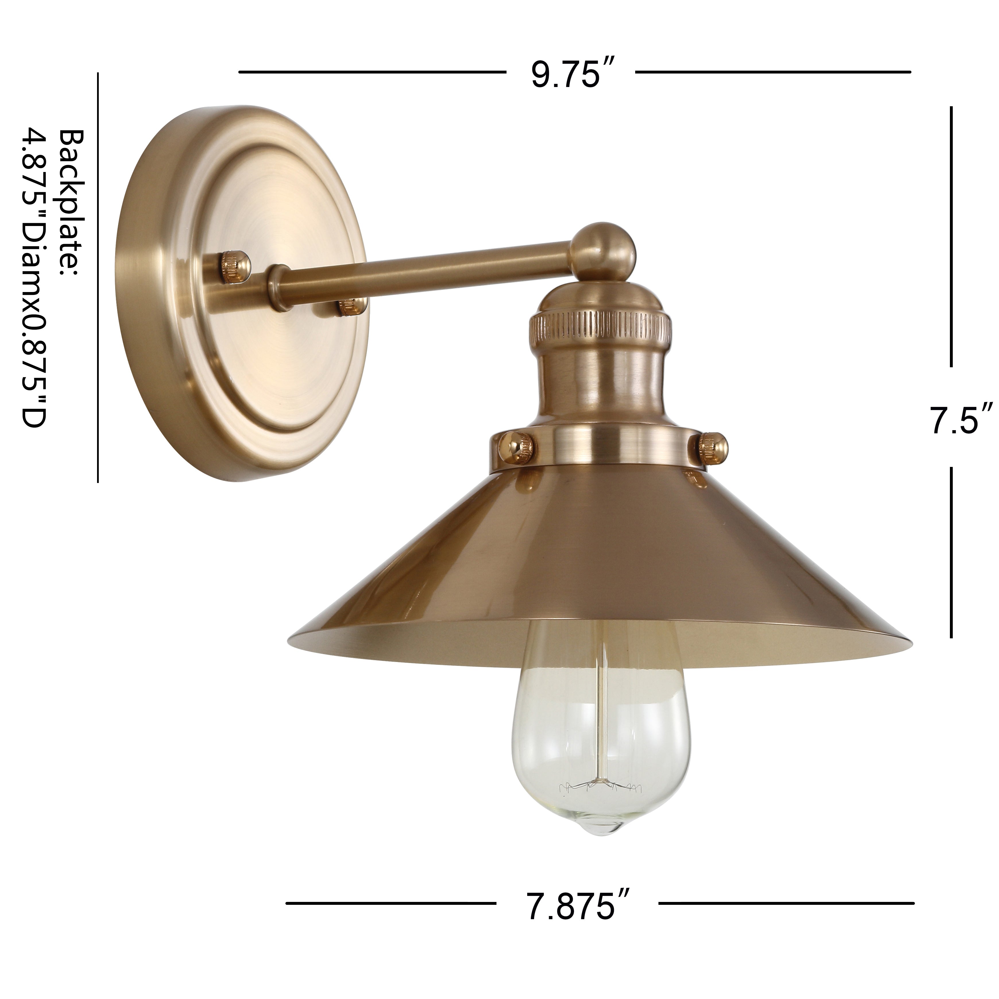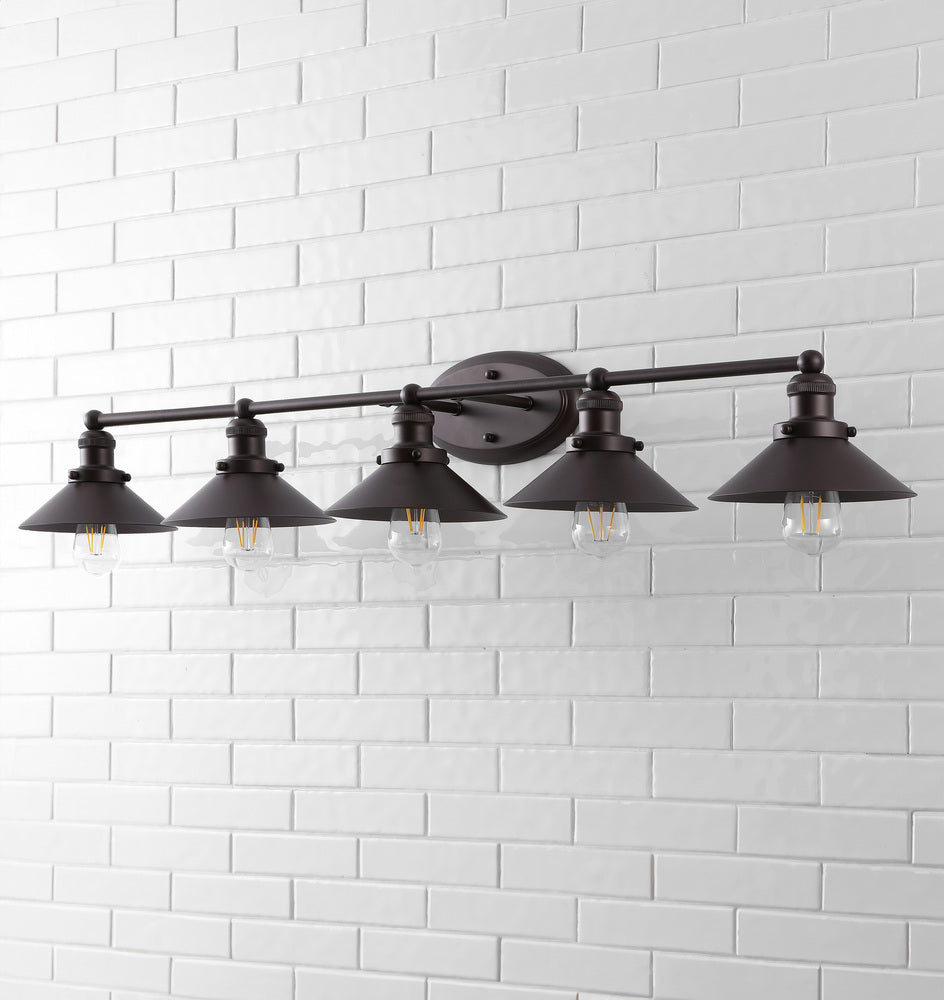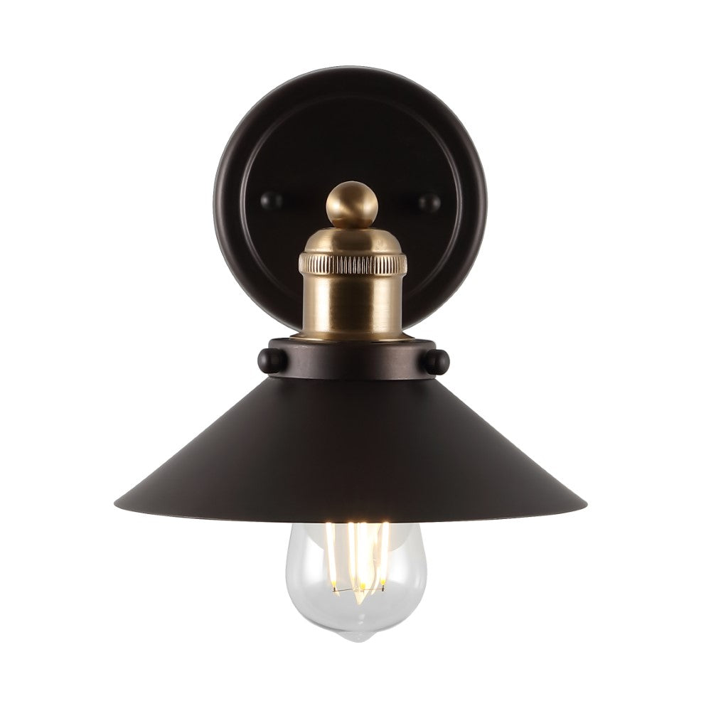 Like a classic barn light but in a modern shape and smaller scale, this classic design features a metal cone shade that conceals the top half of the bulb -- perfect for a clean, industrial look. In a matte orb finish, this sconce is perfectly at home on either side of a bathroom mirror or as extra lighting in kitchens, where your hardware truly shines. Also available in multi-light configurations, the geometric shape adds elegant interest to any space.