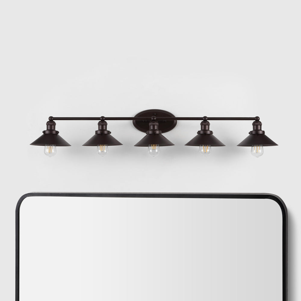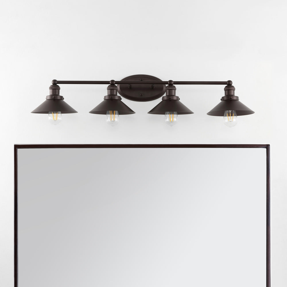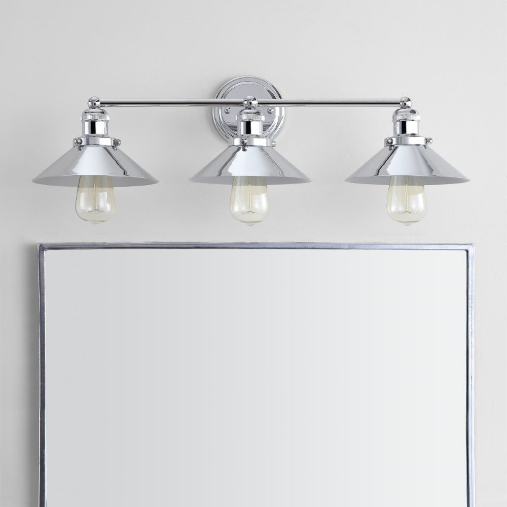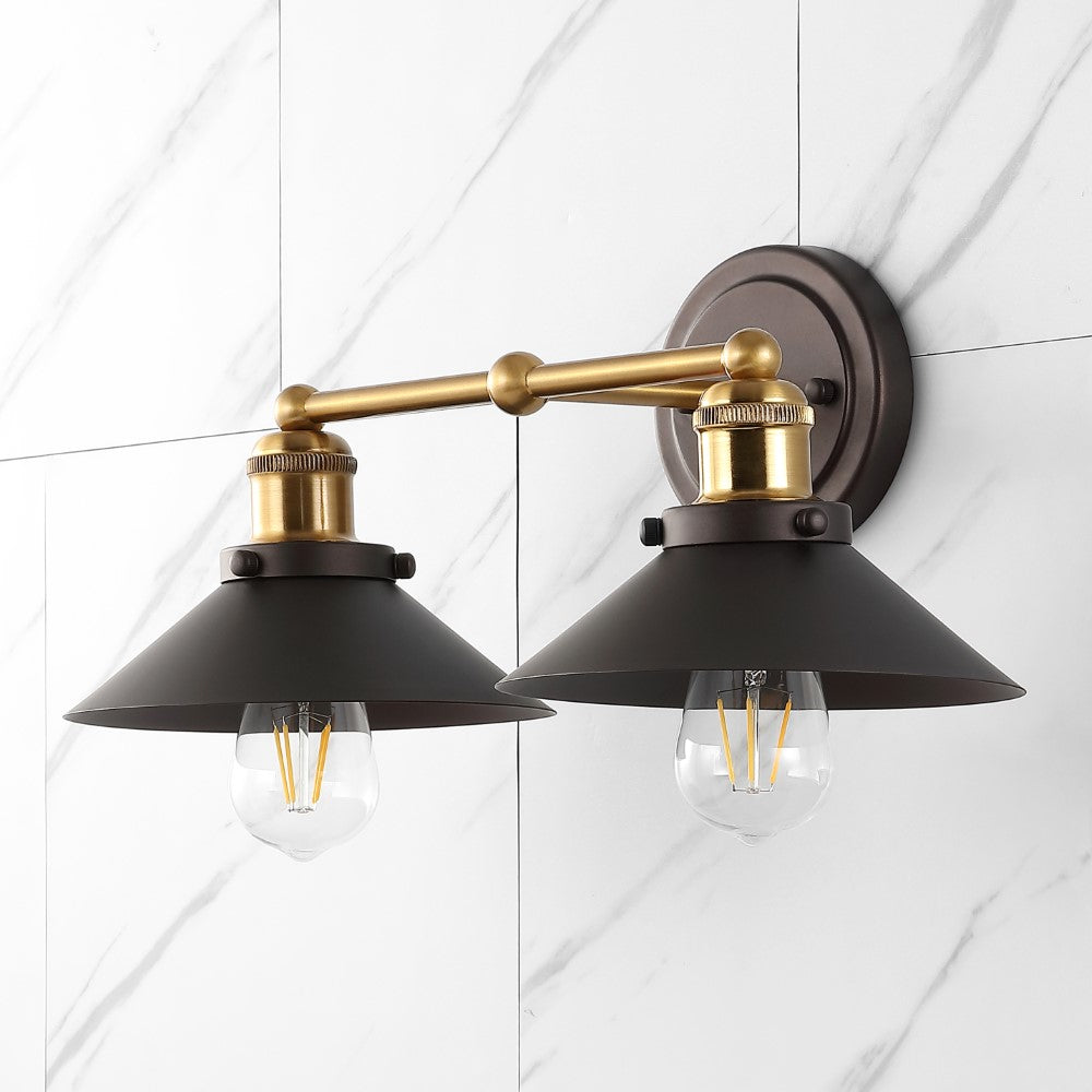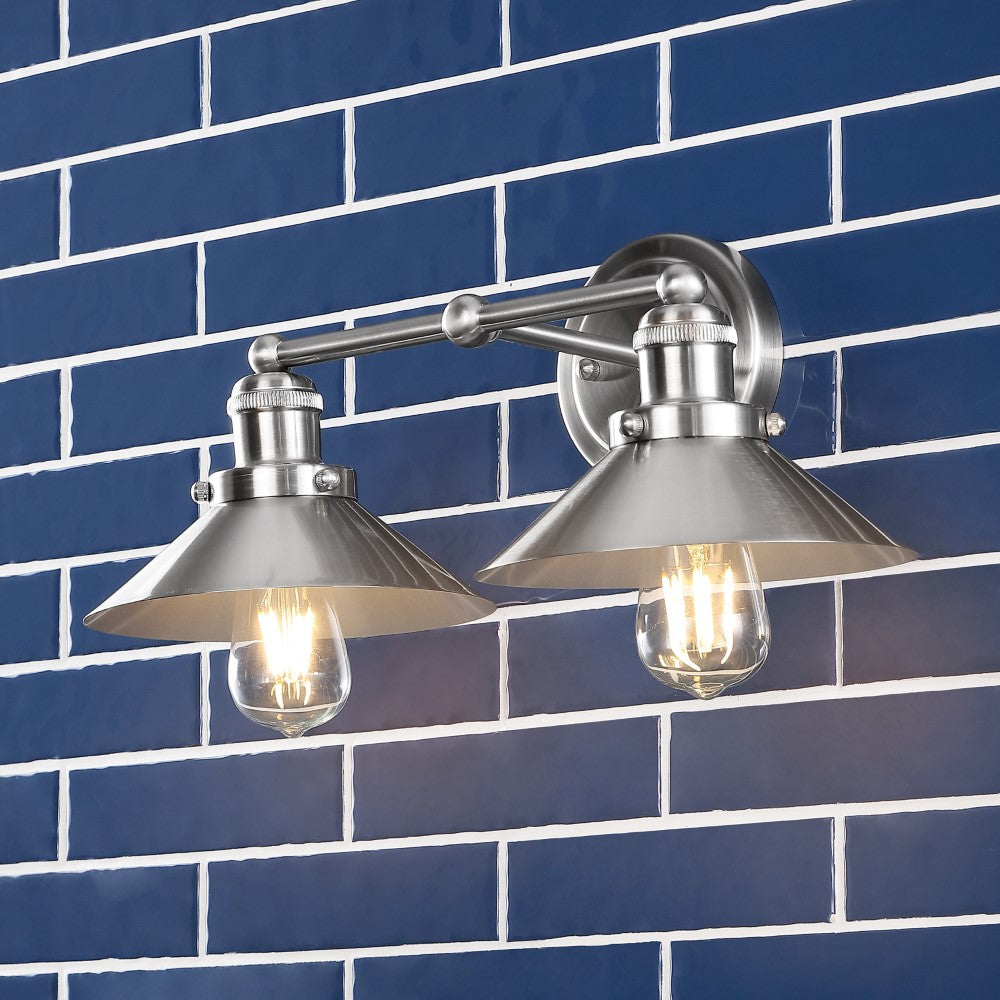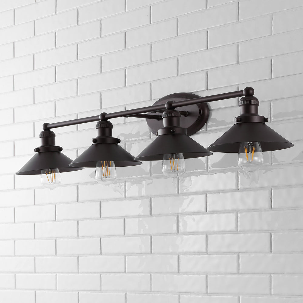 Like a classic barn light but in a modern shape and smaller scale, this classic design features a metal cone shade that conceals the top half of the bulb -- perfect for a clean, industrial look. In a matte orb finish, this sconce is perfectly at home on either side of a bathroom mirror or as extra lighting in kitchens, where your hardware truly shines. Also available in multi-light configurations, the geometric shape adds elegant interest to any space.