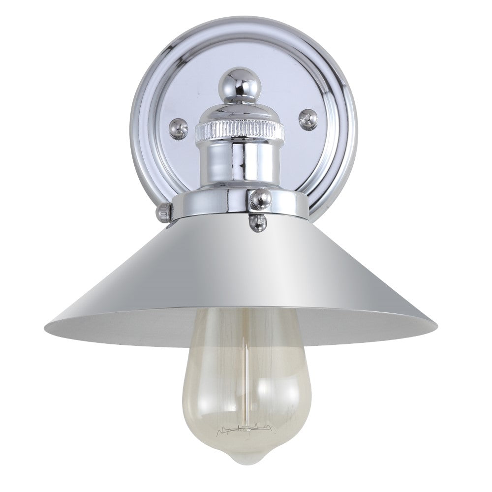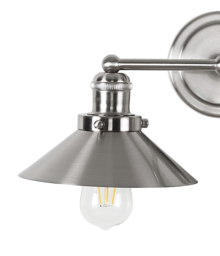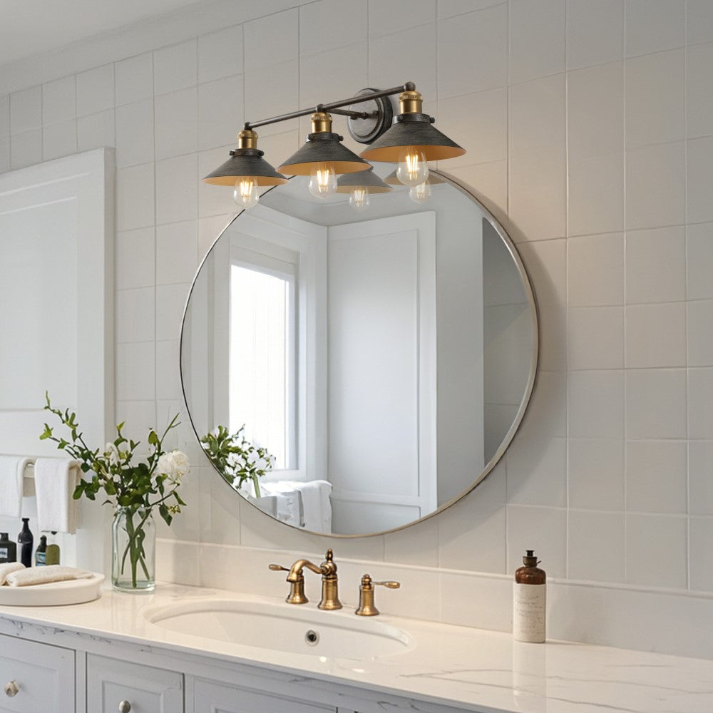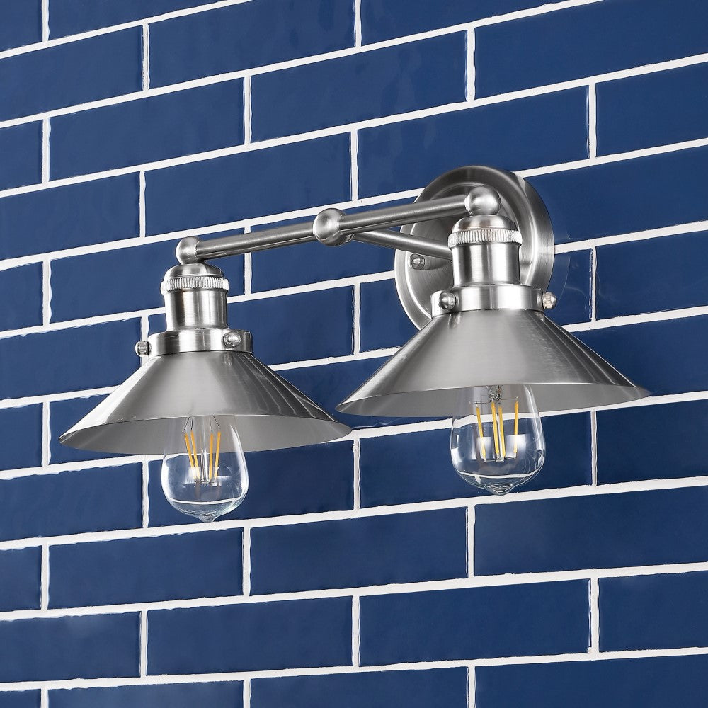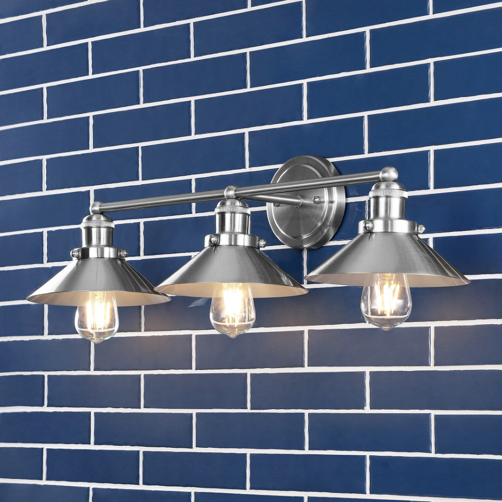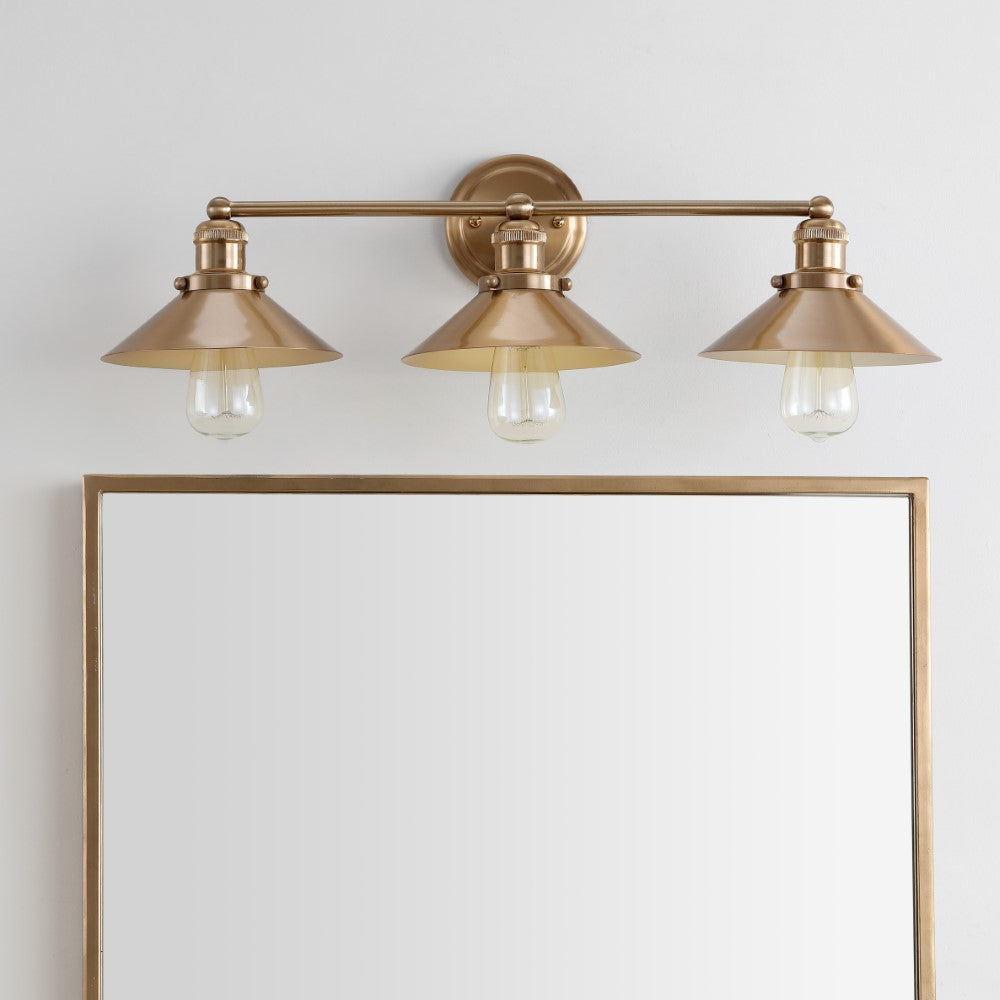 Like a classic barn light but in a modern shape and smaller scale, this classic design features a metal cone shade that conceals the top half of the bulb -- perfect for a clean, industrial look. In a matte orb finish, this sconce is perfectly at home on either side of a bathroom mirror or as extra lighting in kitchens, where your hardware truly shines. Also available in multi-light configurations, the geometric shape adds elegant interest to any space.