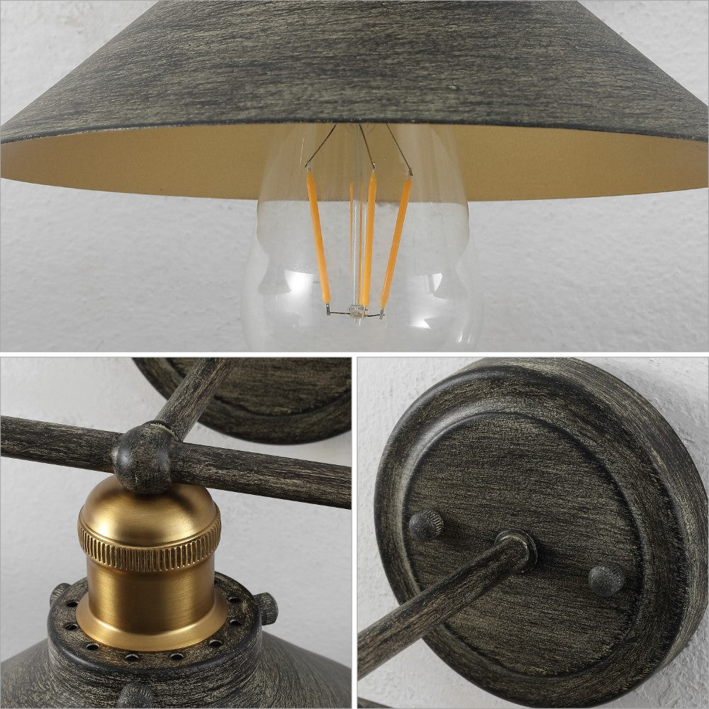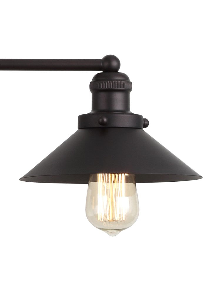 - Orb-finished cone shades add industrial charm to the classic barn-style light