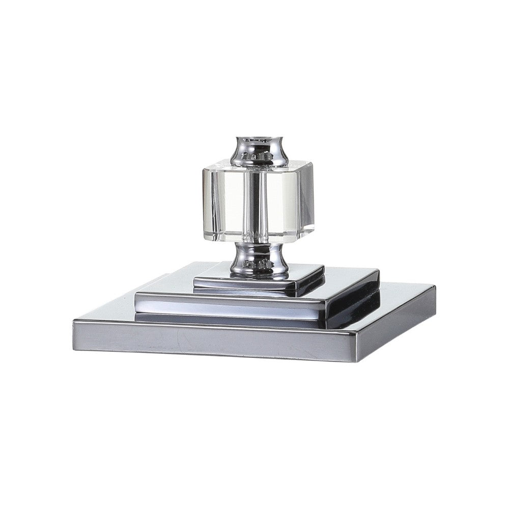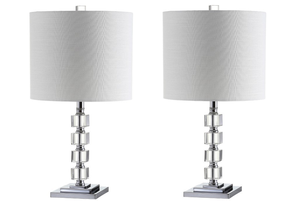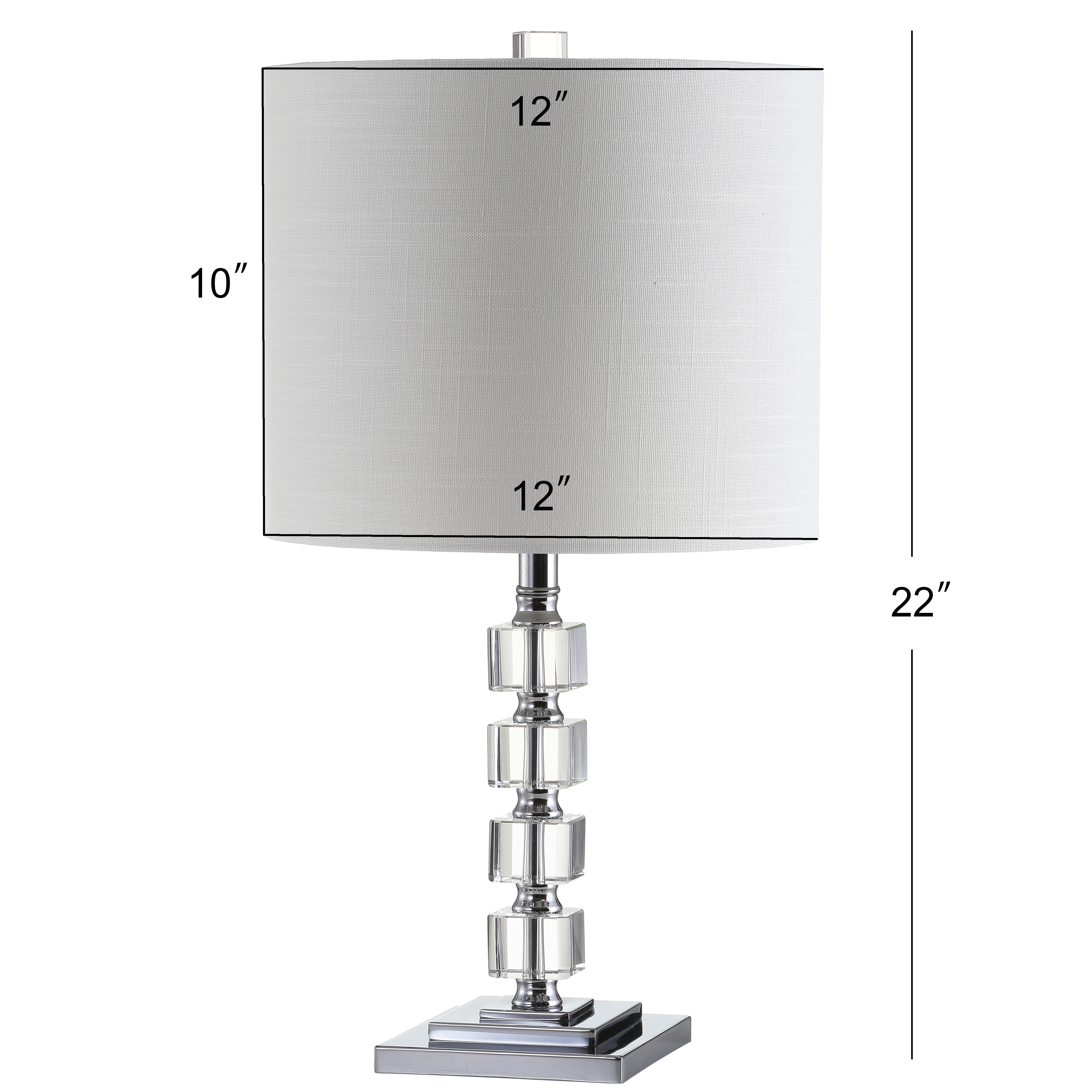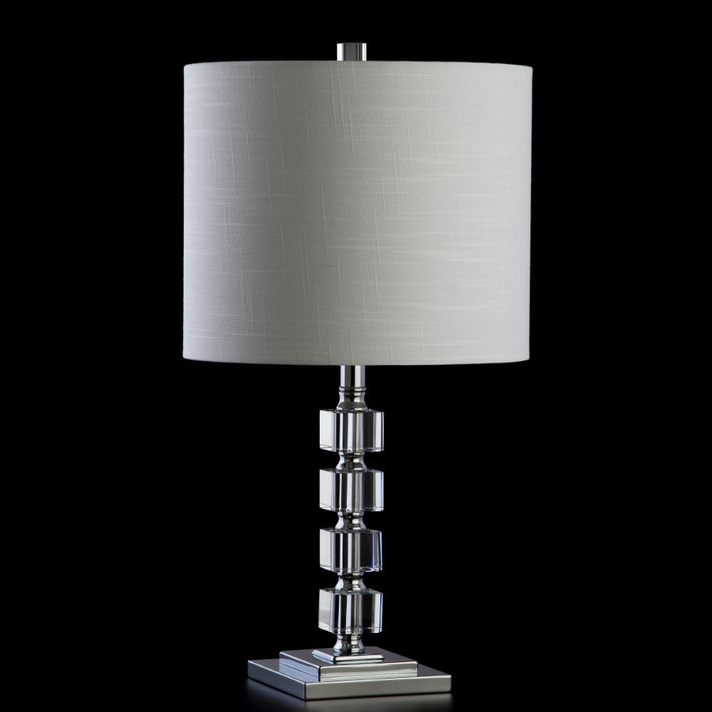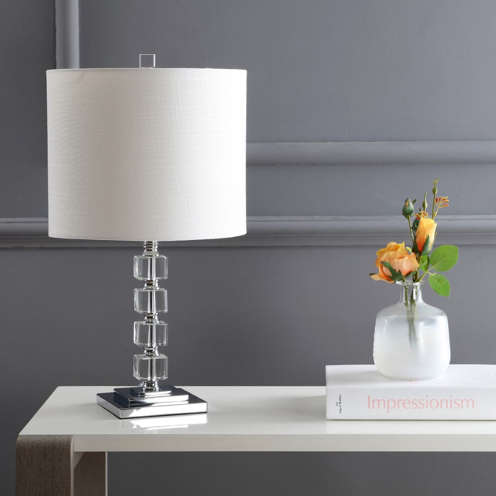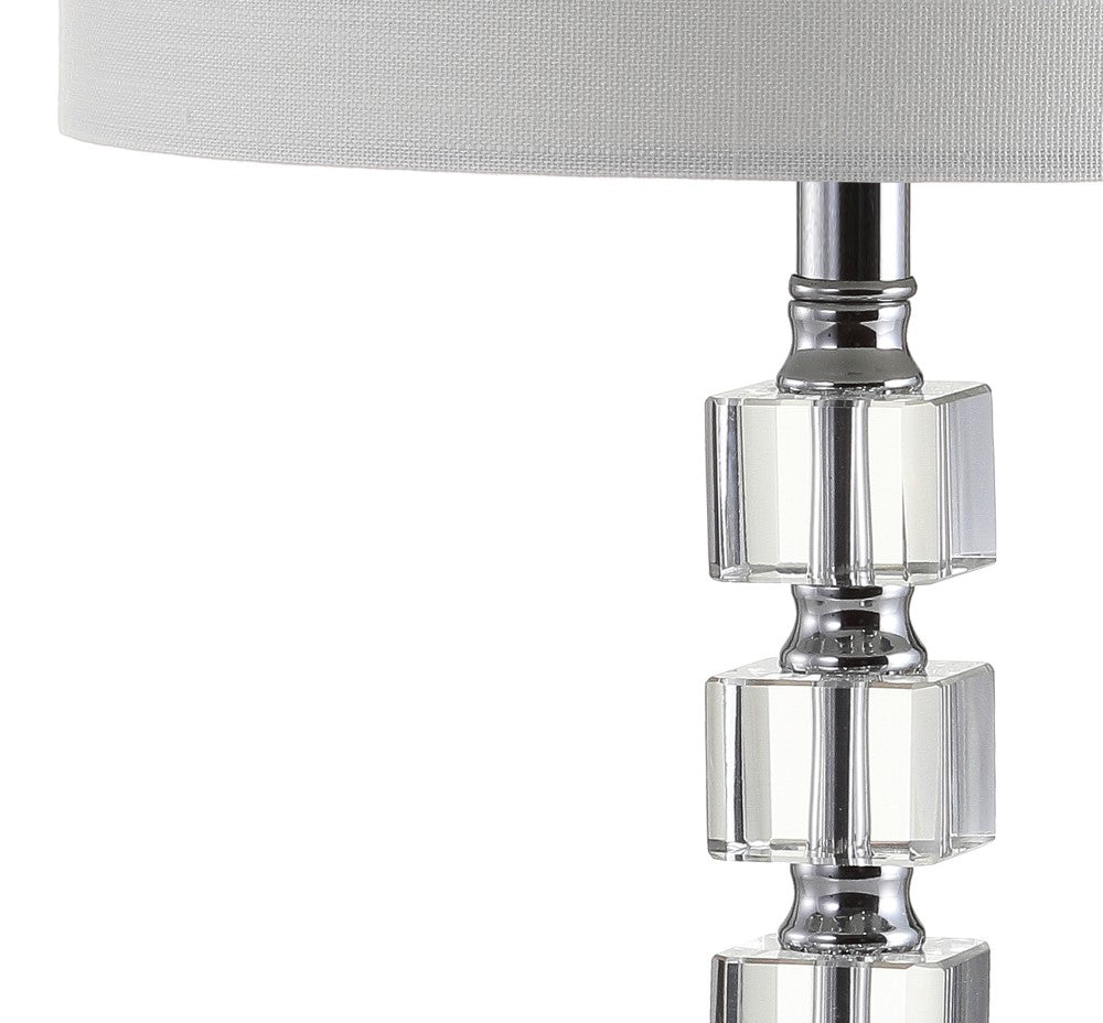 Add sparkle to any room with this contemporary crystal glass table lamp. The body features stacked cubes of clear crystal accented by chrome fittings. This appealing design is topped with a white fabric drum shade.