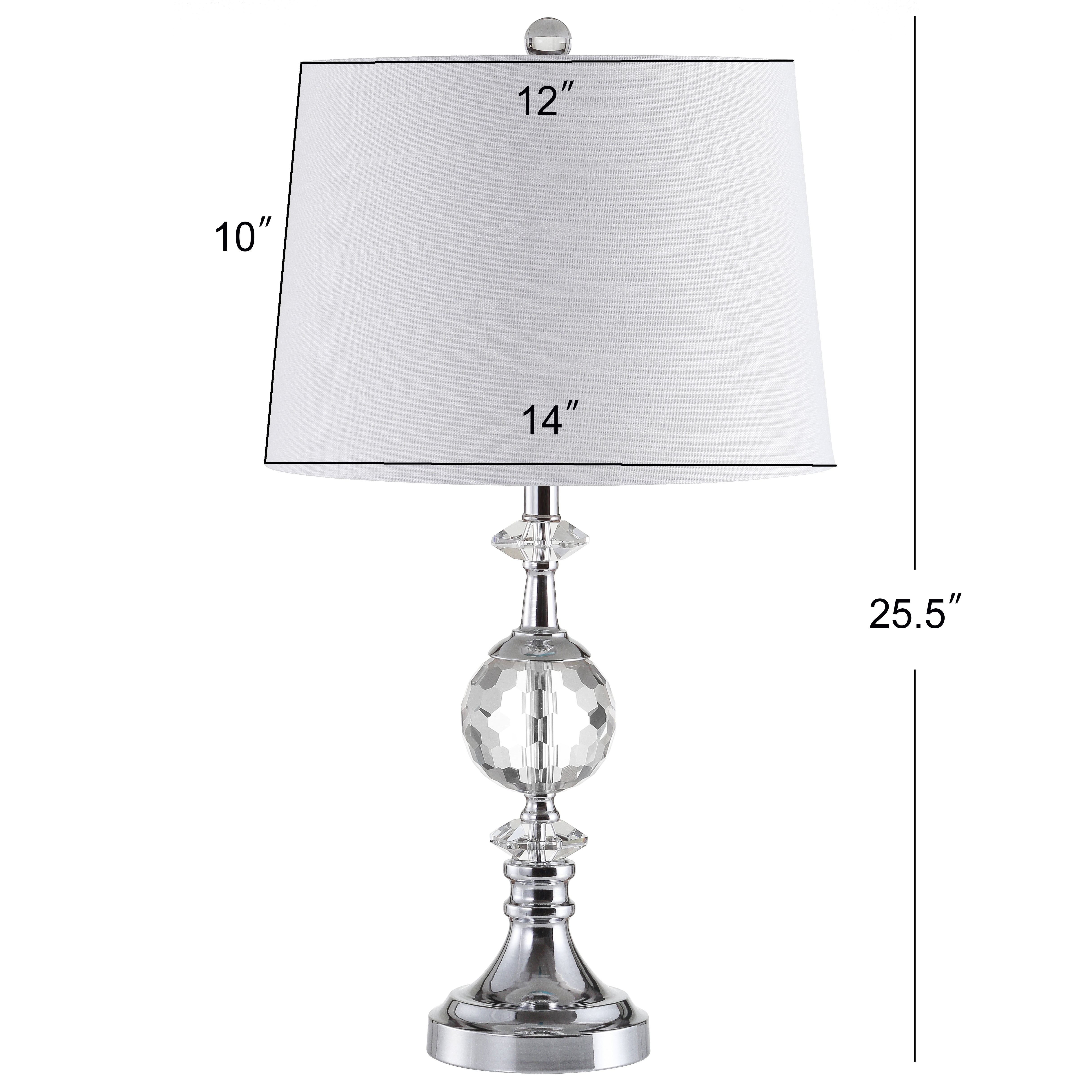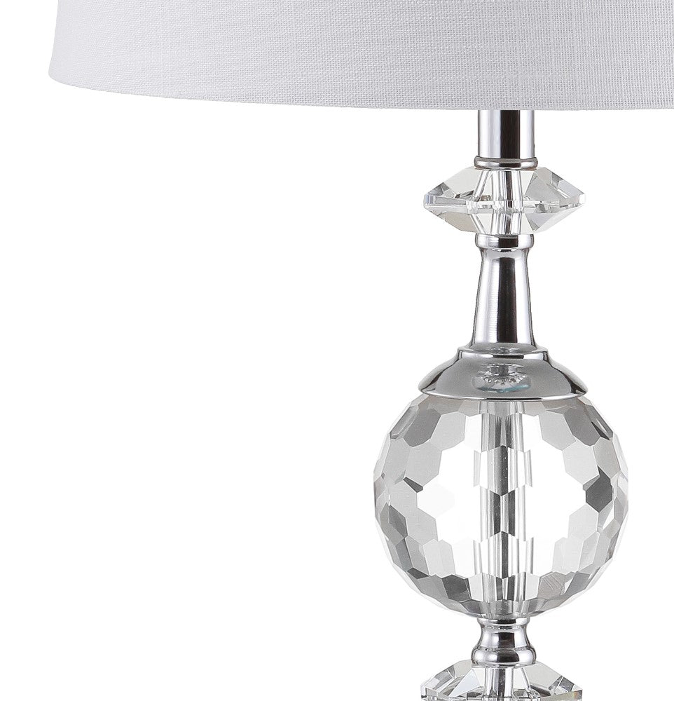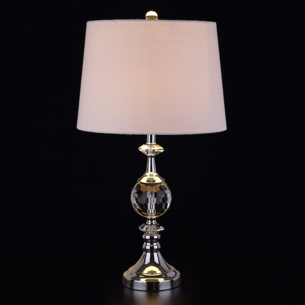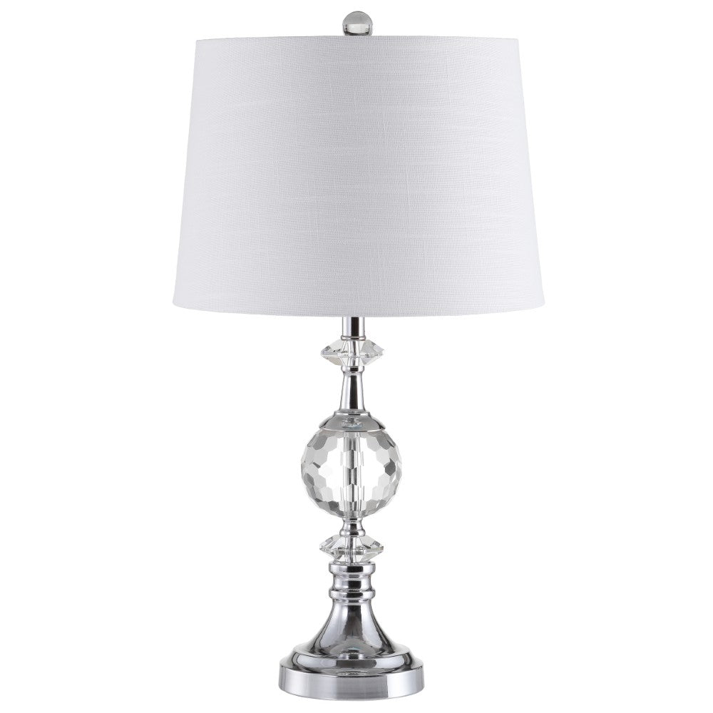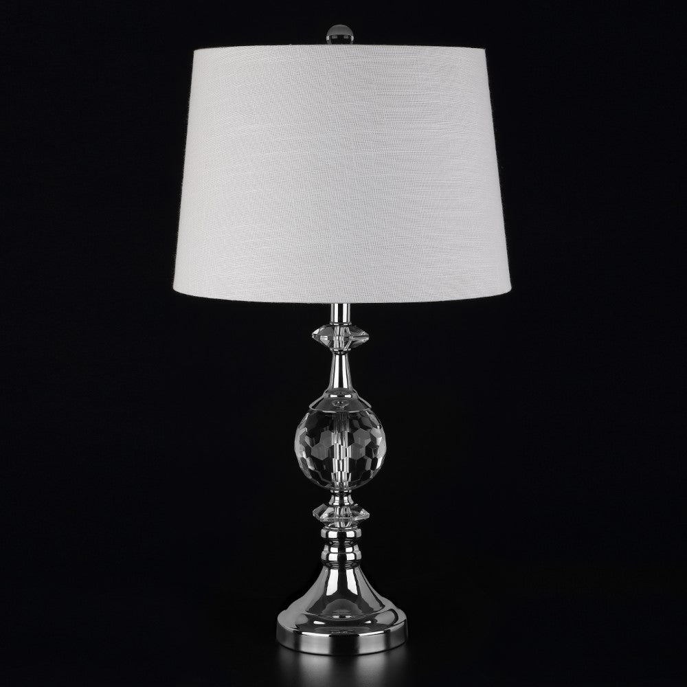 A sphere of faceted crystal is combined with chrome finish accents for an eye-catching effect. The center is set atop a footed stand and topped with a slightly tapered linen drum shade. A crystal sphere finial completes the look.