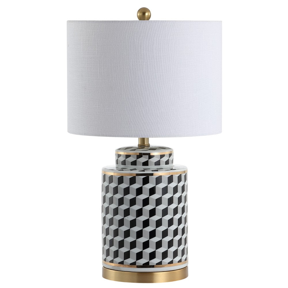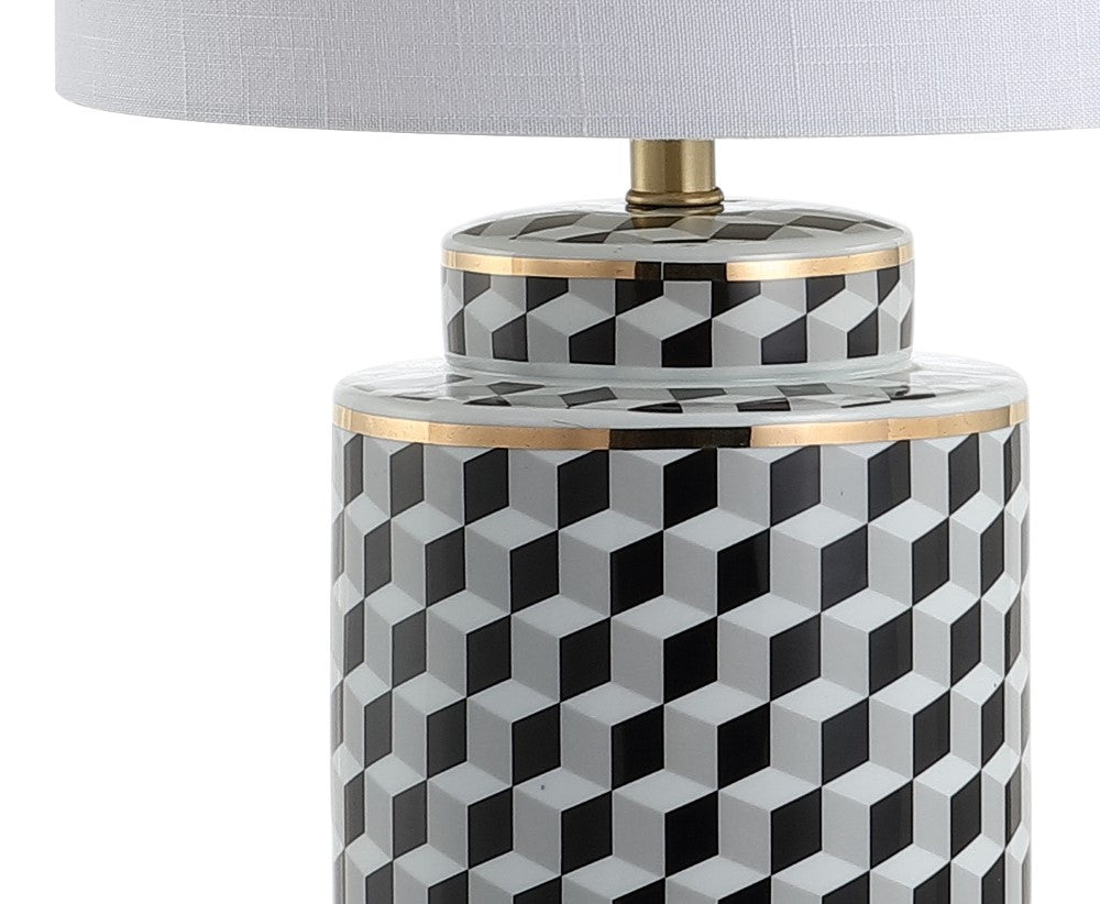 A cylindrical ceramic ginger jar creates the silhouette of this modern update to a classic style. Glazed in a tumbling block motif, this pattern was popular in tilework in ancient Greece and then again as a quilting pattern in the 1800s, but looks decidedly modern in this neutral colorway. A linen drum shade and silk-wrapped cord complete the look.