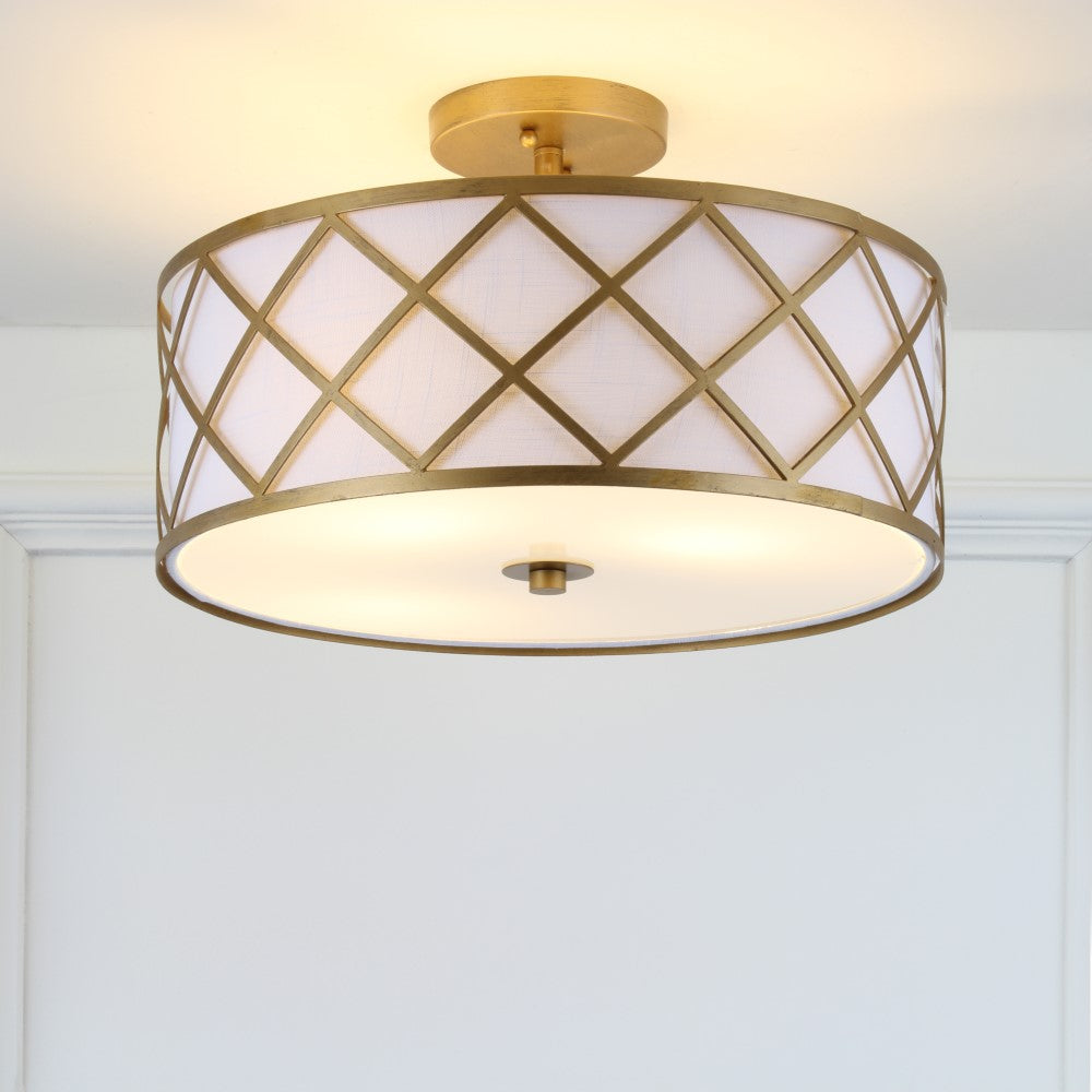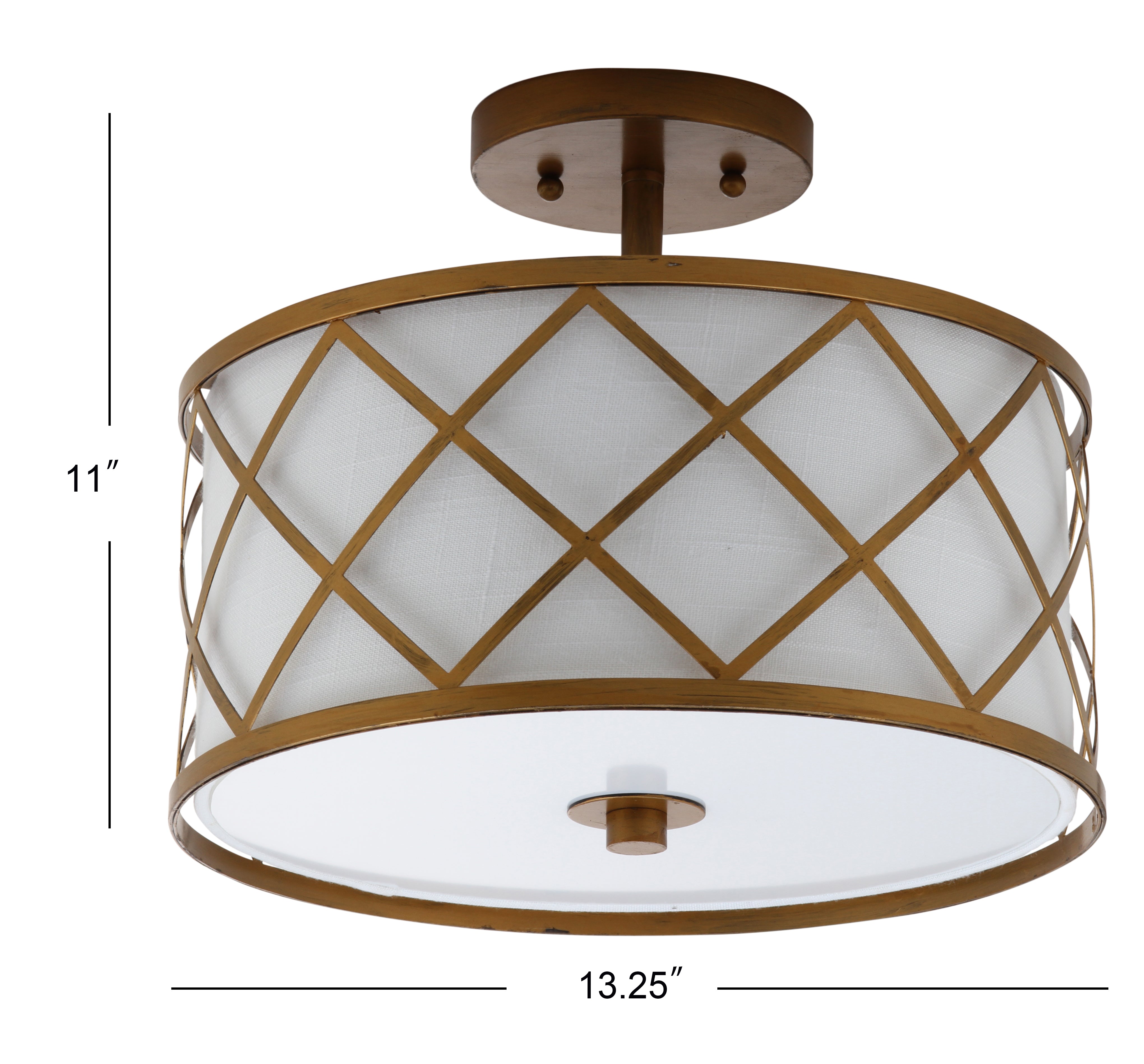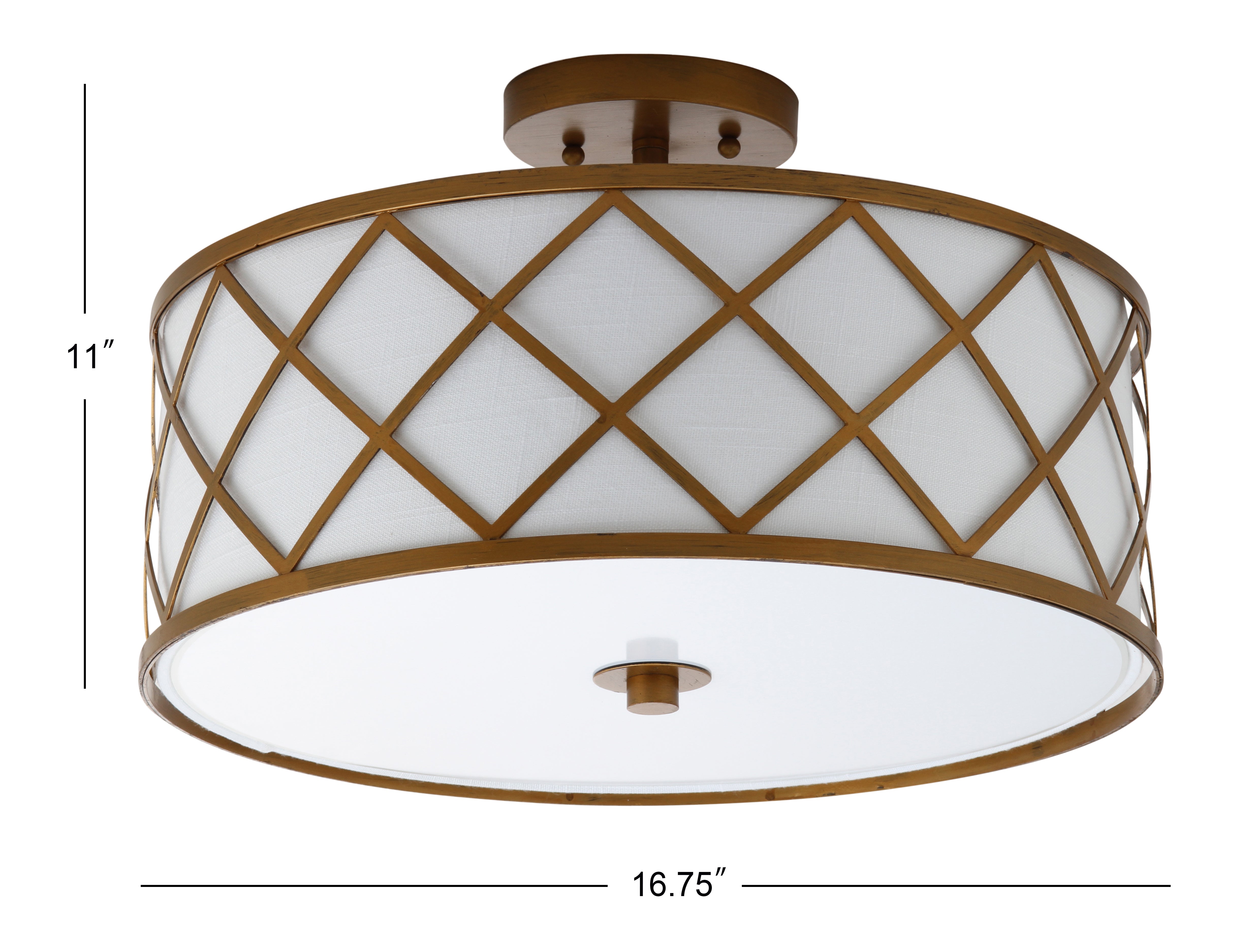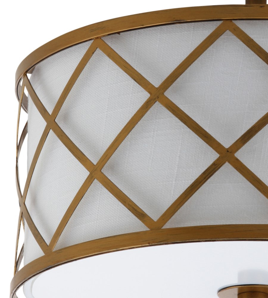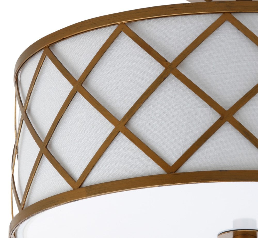 Surrounded by crisscrossed metal lattice in a painted gold finish, this flush mount adds transitional elegance to any room. With only 11" in drop, it will work with any height ceiling and in a neutral white linen shade, with any color scheme. Though easily installed, we recommend using a professional electrician to hard wire it on the ceiling.