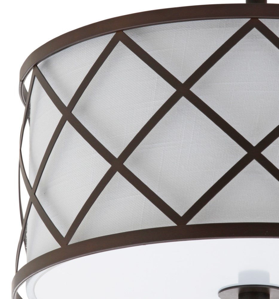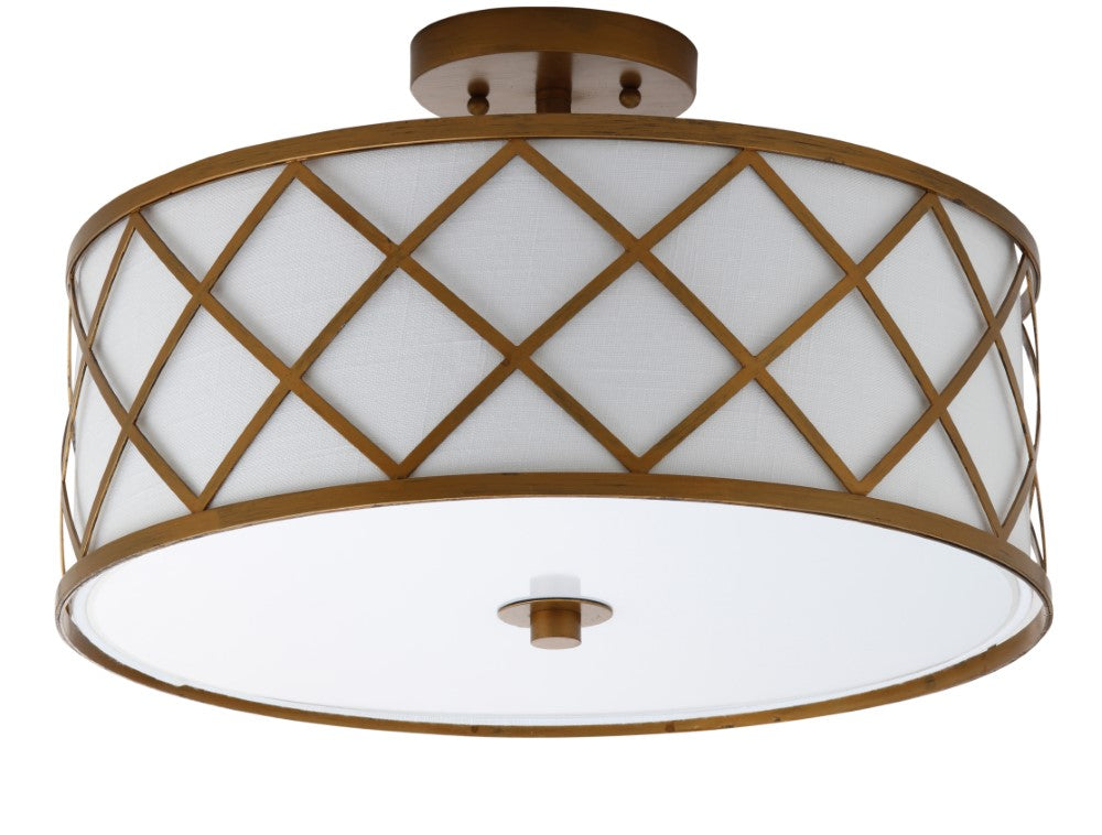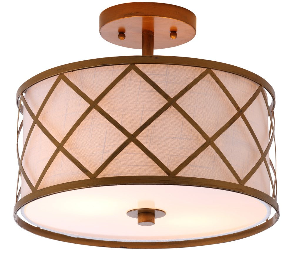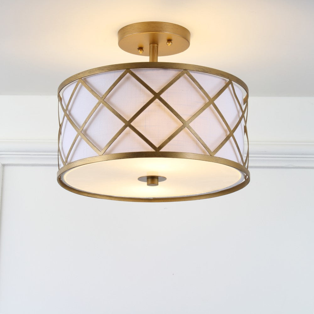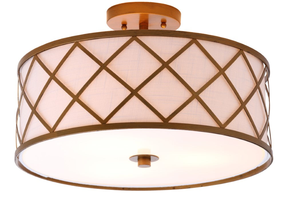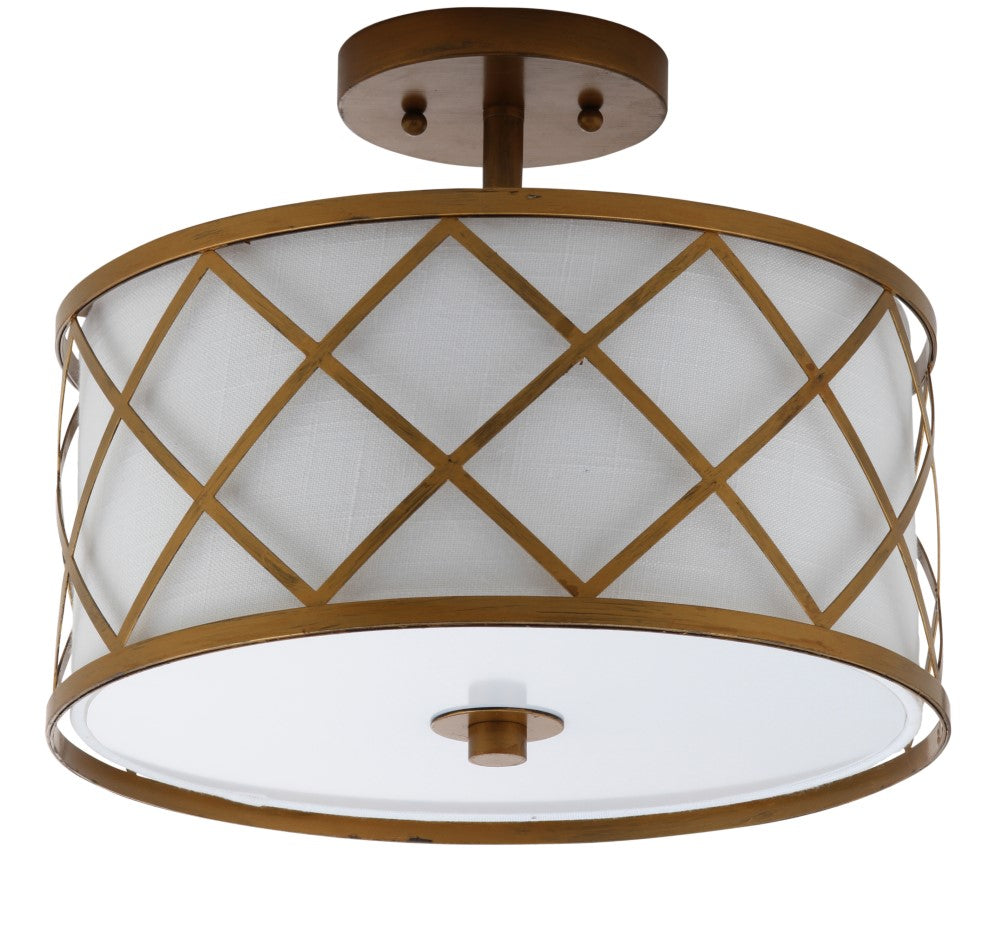 Surrounded by crisscrossed metal lattice in a painted gold finish, this flush mount adds transitional elegance to any room. With only 11" in drop, it will work with any height ceiling and in a neutral white linen shade, with any color scheme. Though easily installed, we recommend using a professional electrician to hard wire it on the ceiling.