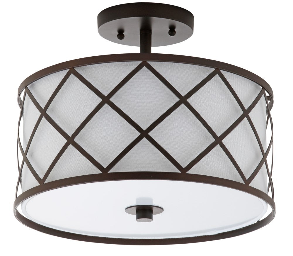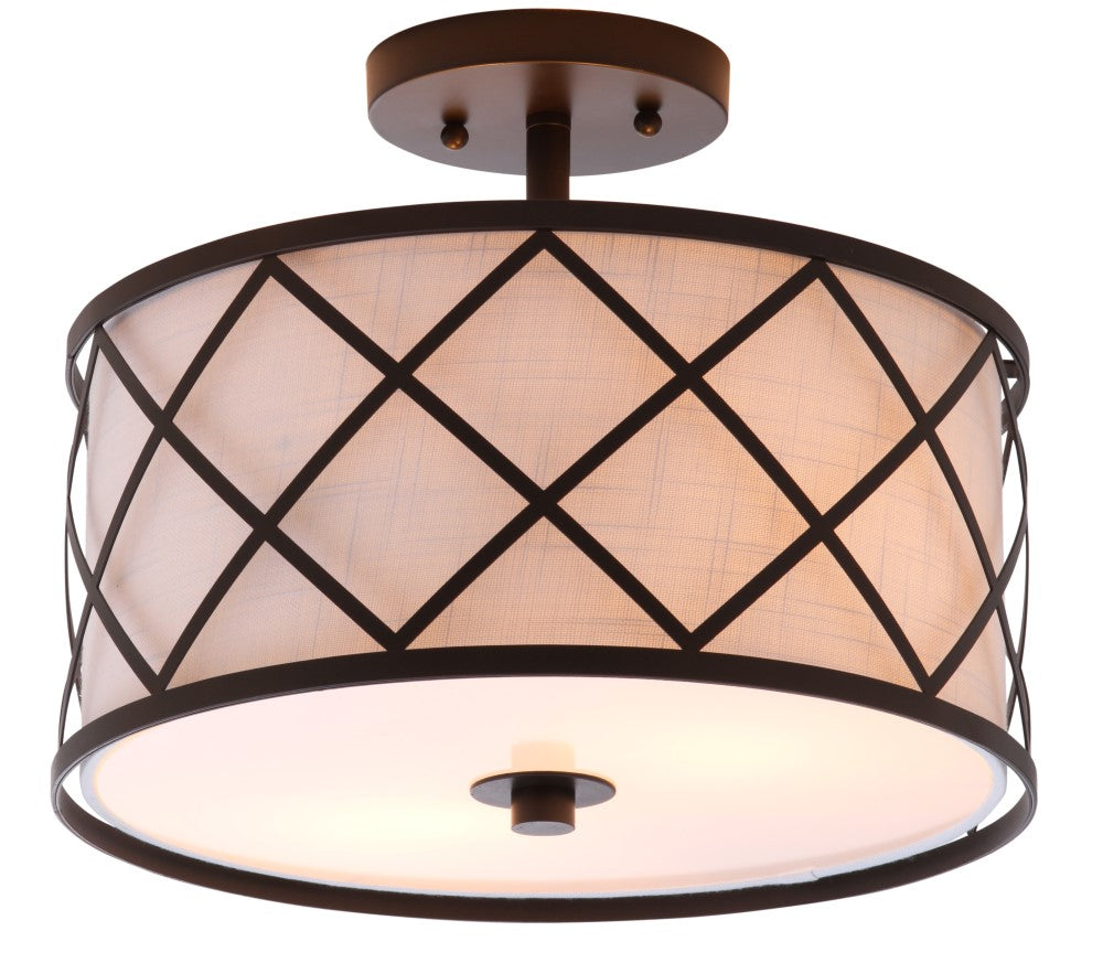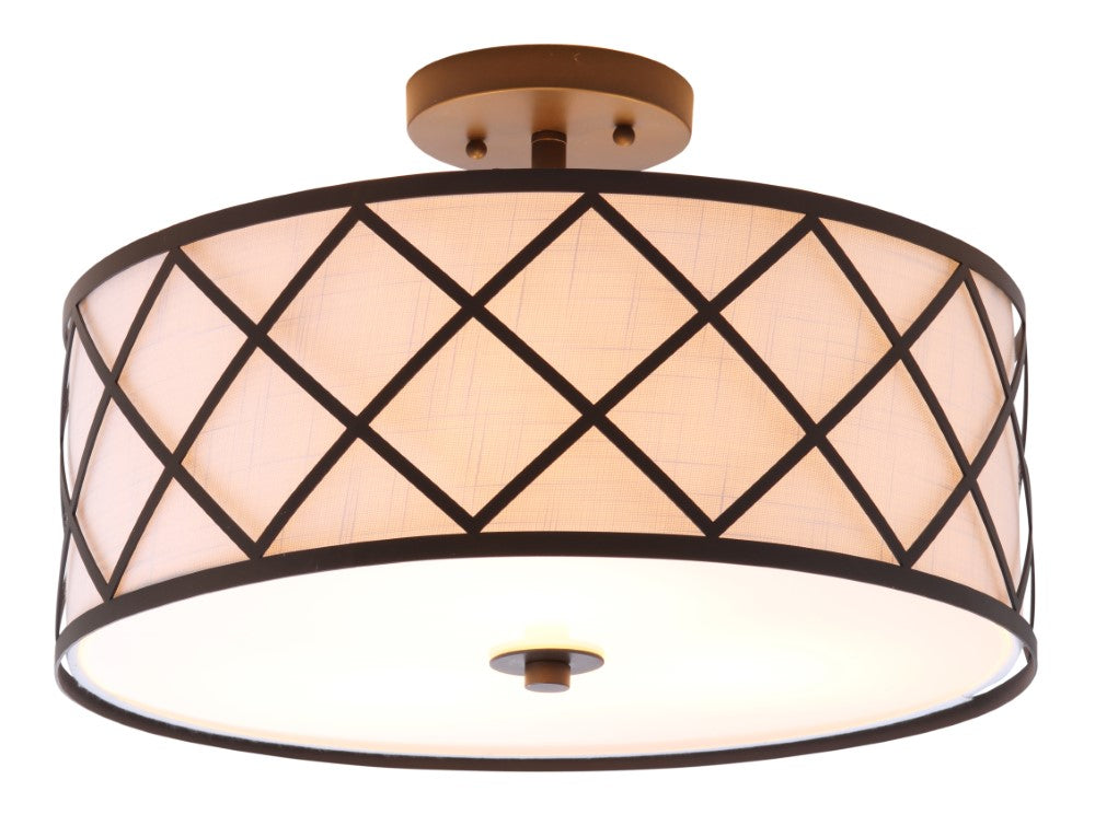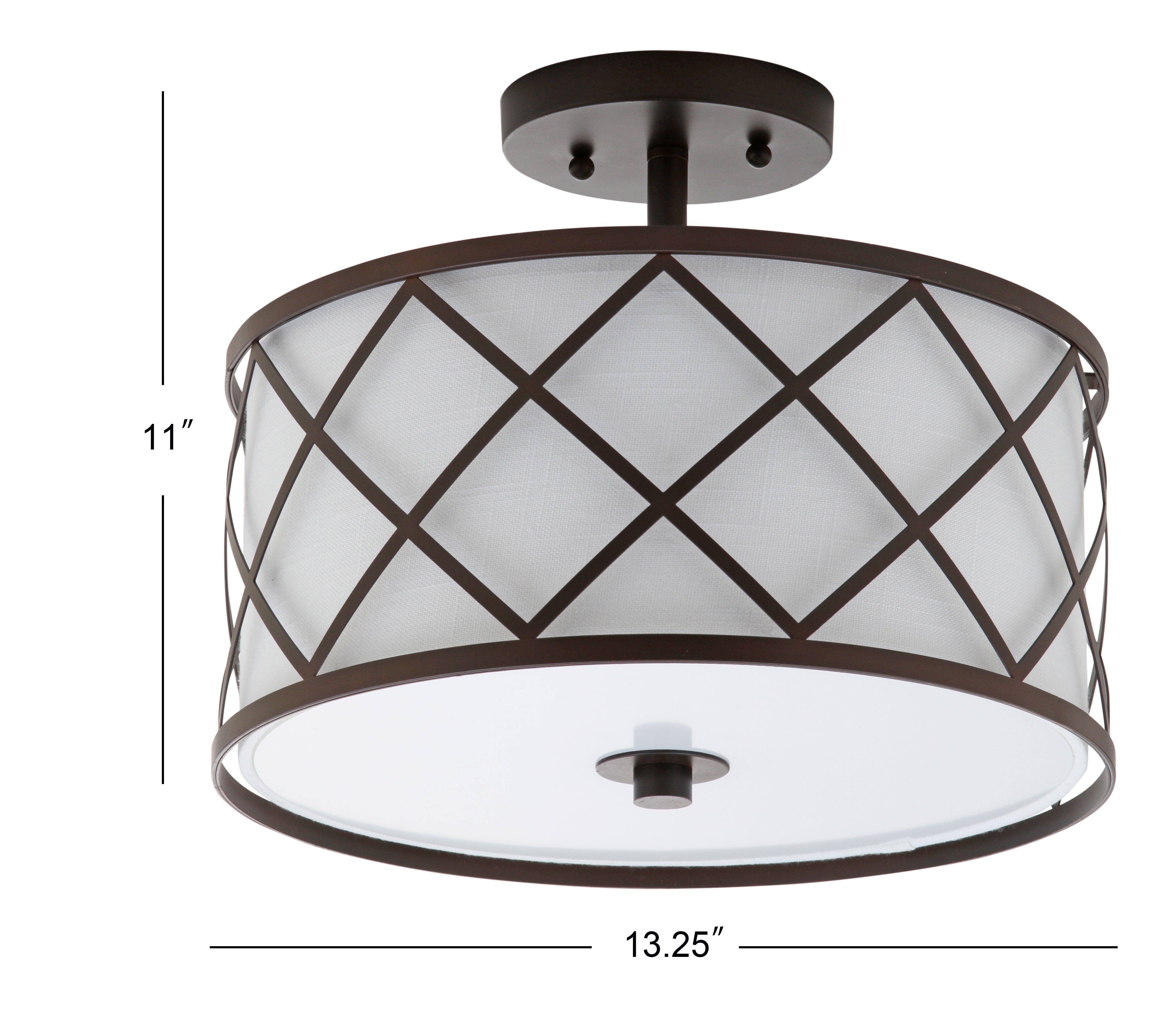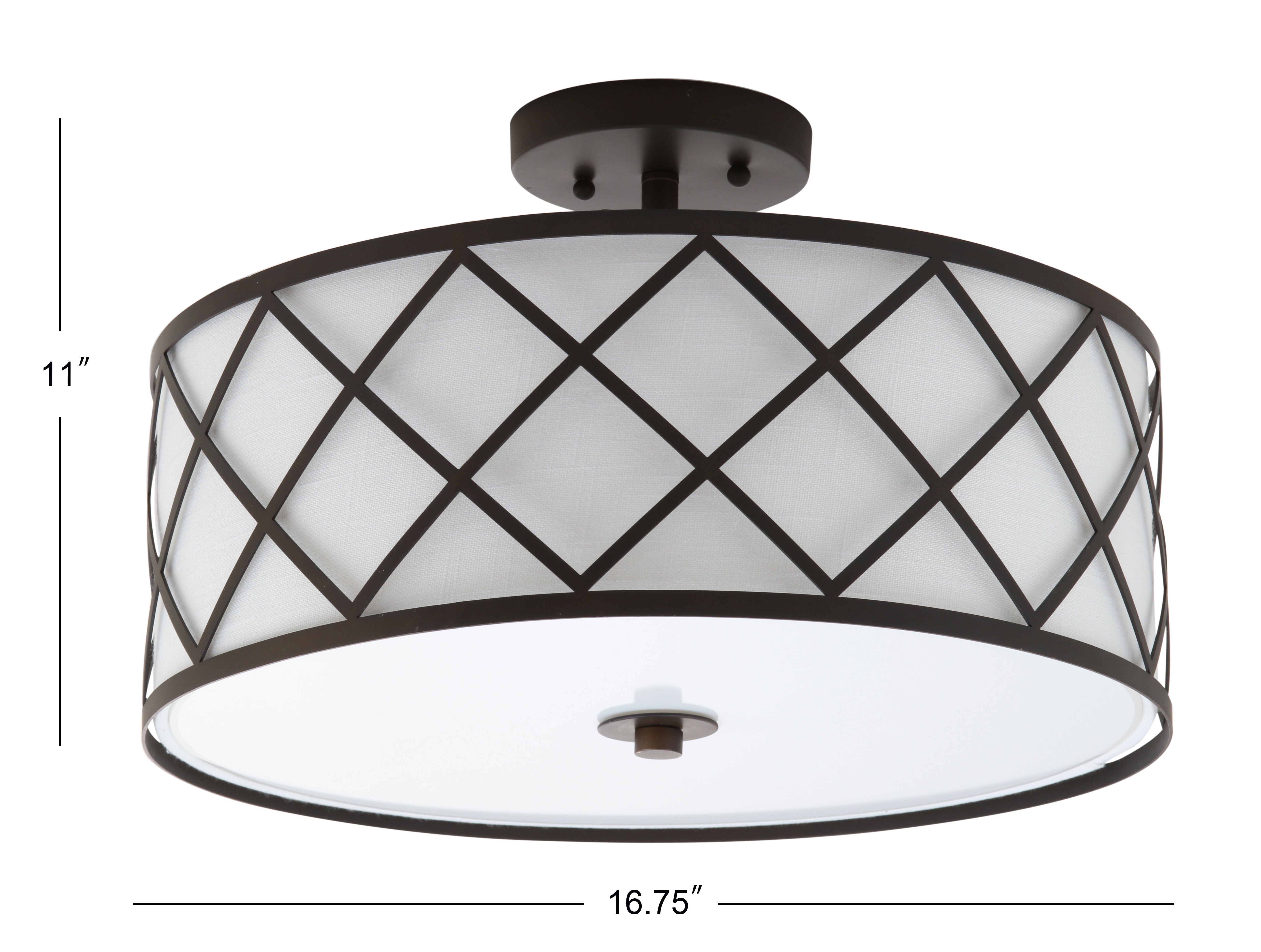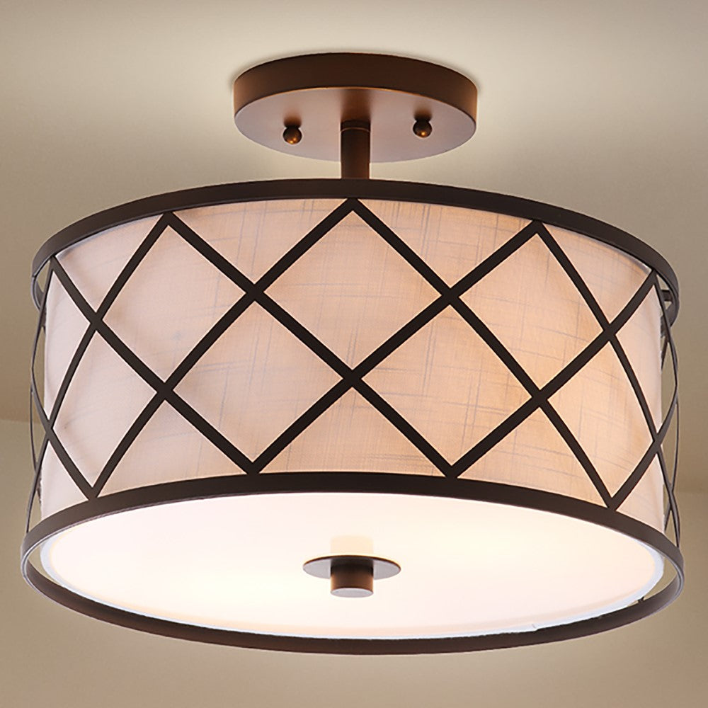 Surrounded by crisscrossed metal lattice in a painted gold finish, this flush mount adds transitional elegance to any room. With only 11" in drop, it will work with any height ceiling and in a neutral white linen shade, with any color scheme. Though easily installed, we recommend using a professional electrician to hard wire it on the ceiling.