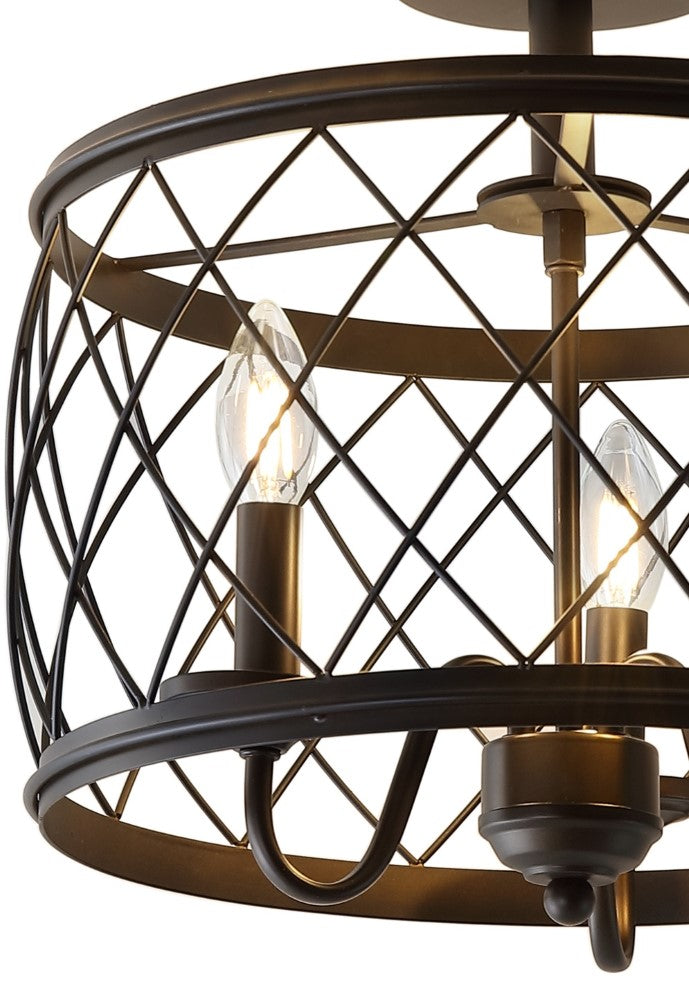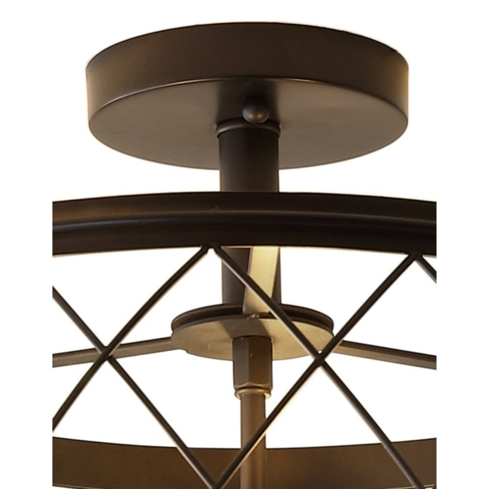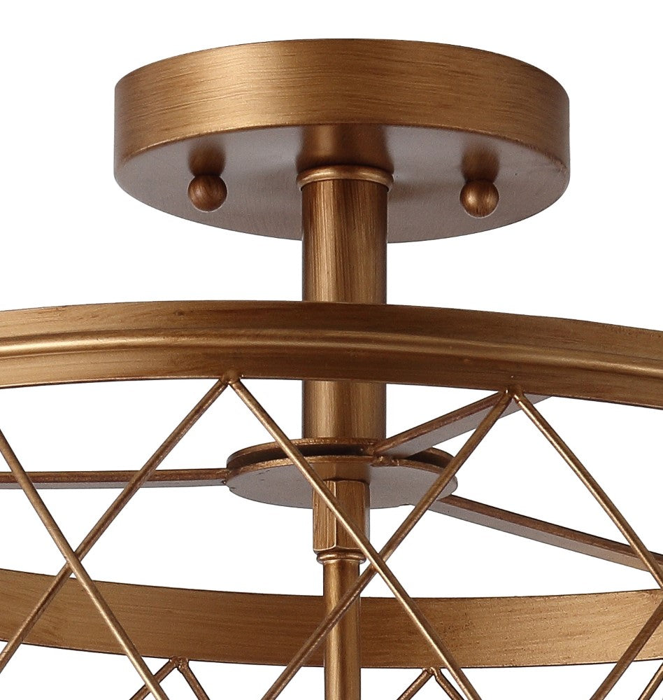 - A cage of forged iron, finished in a soft antiqued gold, accent the three lights of this flush mount