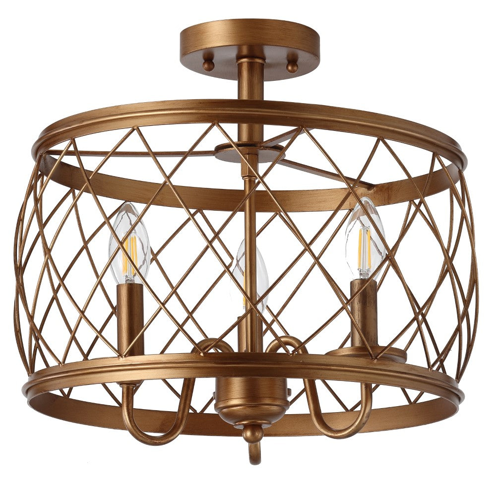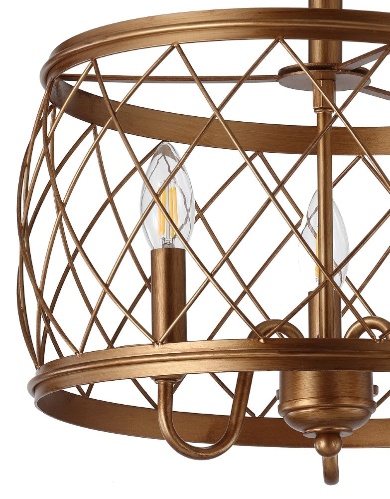Surrounded by a drum of golden iron, three chandelier bulbs emanate a warm glow, creating a sense of "welcome" suitable to any room in the home. Industrial hardware finds restoration with a fresh finish, creating a look that is rugged but feminine. Easy to assemble, maintain, and clean; this fixture is as functional as it is lovely.