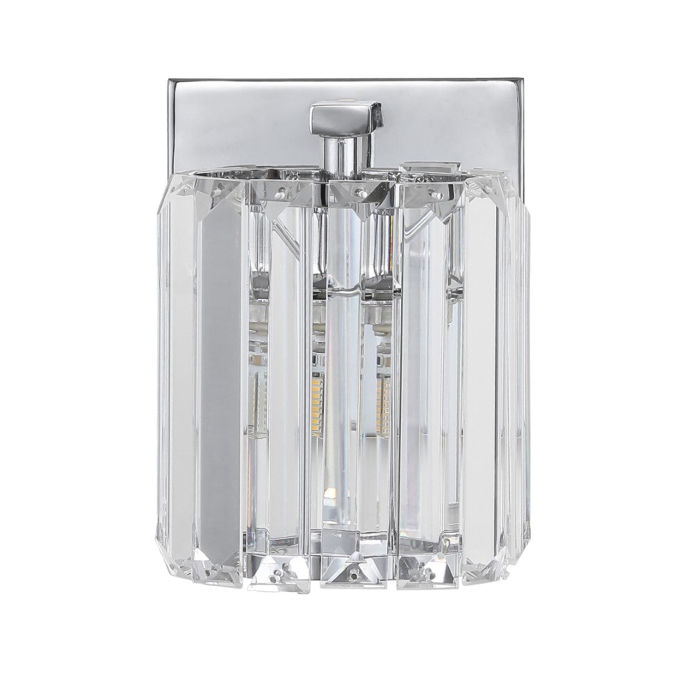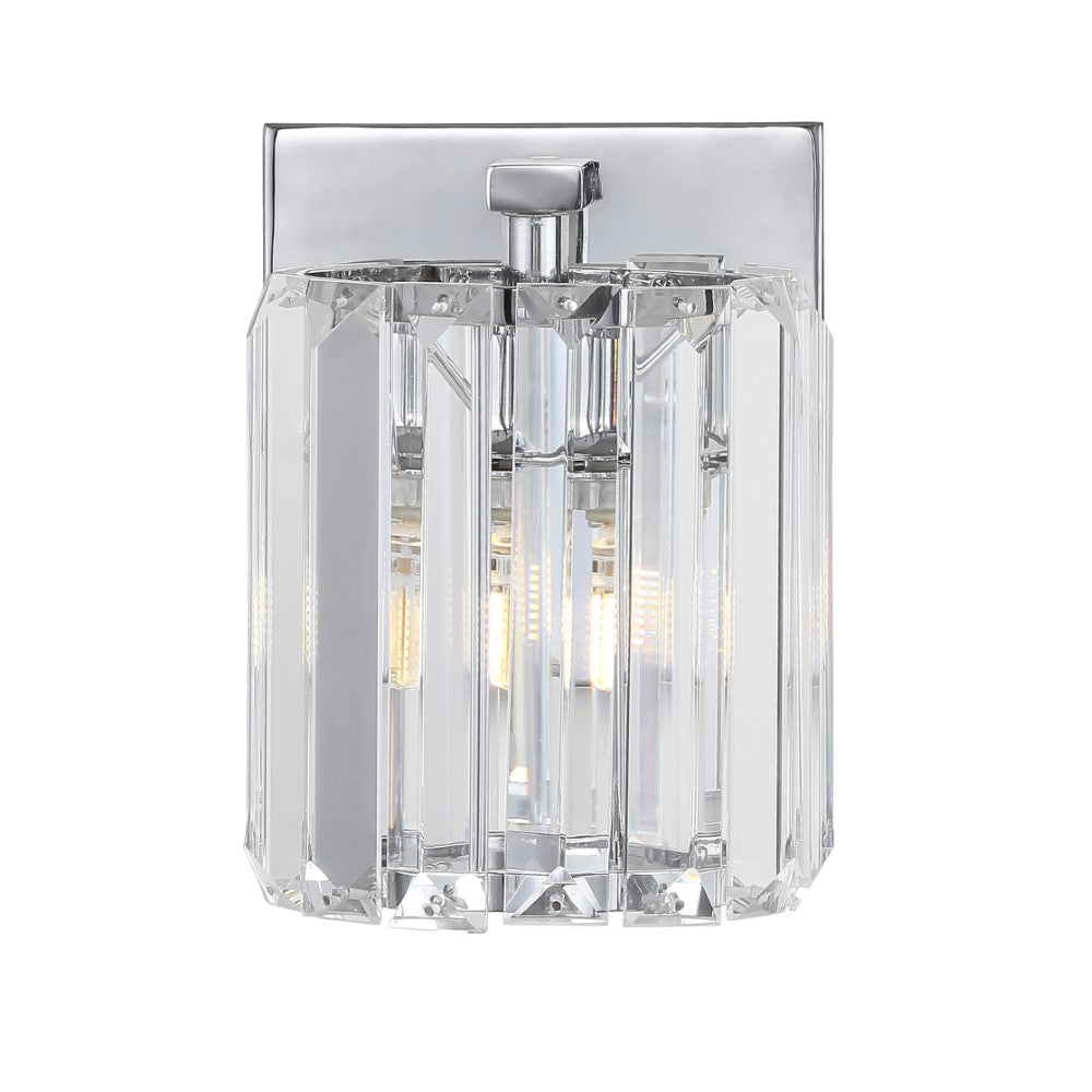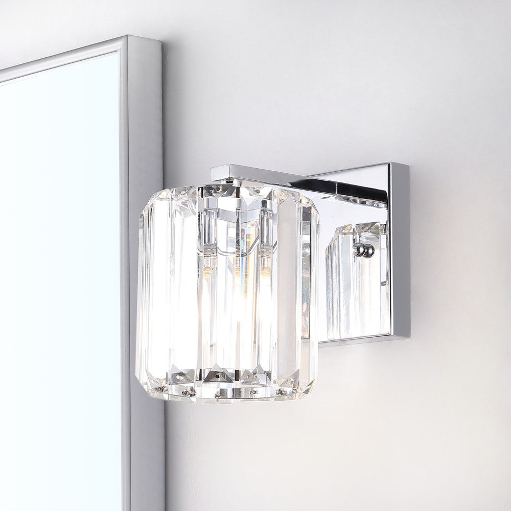 Bring on the glam with our Art Deco-inspired glass prism wall light. A single LED bulb casts a warm glow, providing plenty of light. Sparkling glass and chrome add feminine style to your bath vanity, kitchen, hallway, or entry.