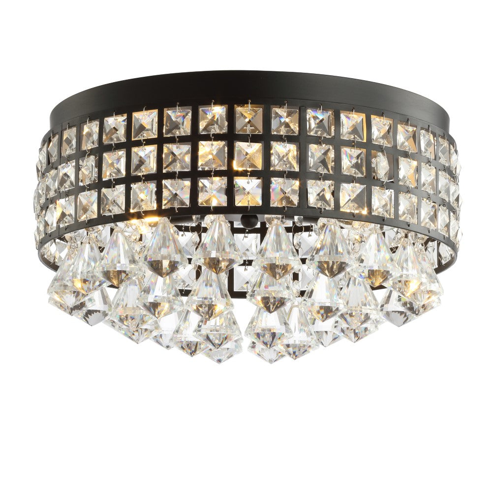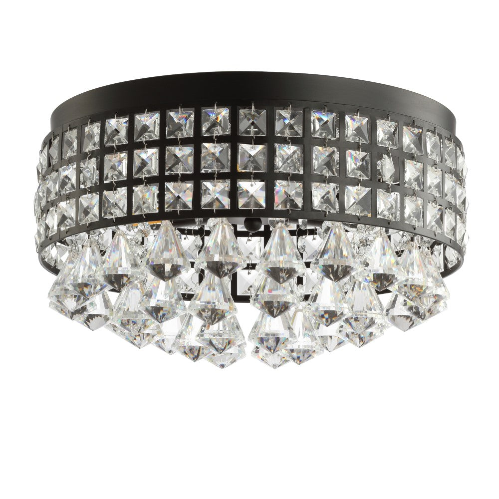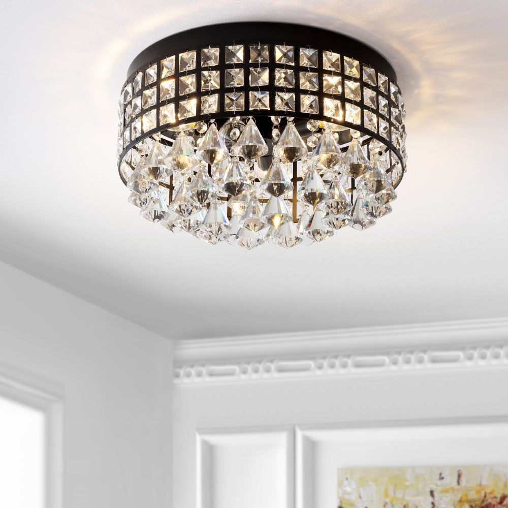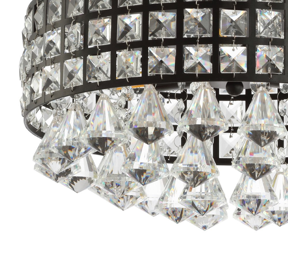 Add sparkle to your ceiling with our modern flush mount Meredith fixture. With faceted crystals set into a chic black metal grid and a collection of crystal drops, this unique light fixture adds a touch of glamour to your hallway, bedroom or bathroom. Perfect for low ceilings, the 8 5" height fits just about anywhere.
