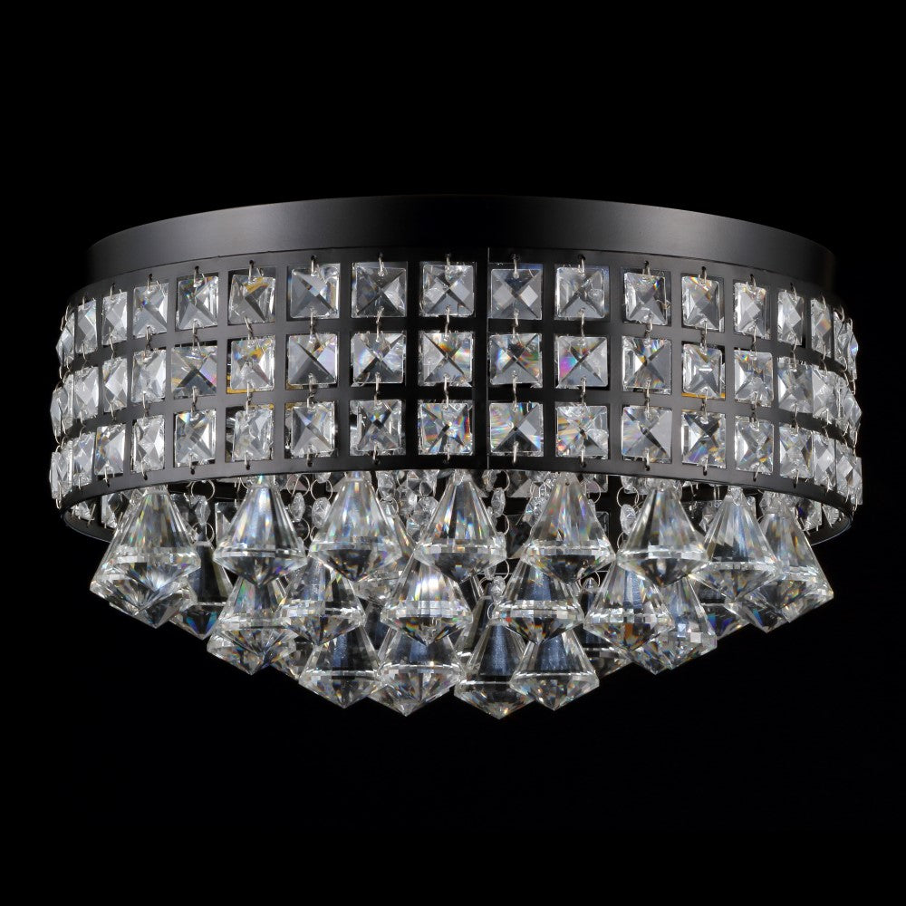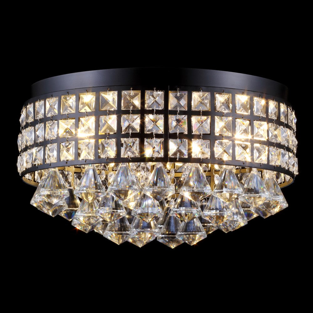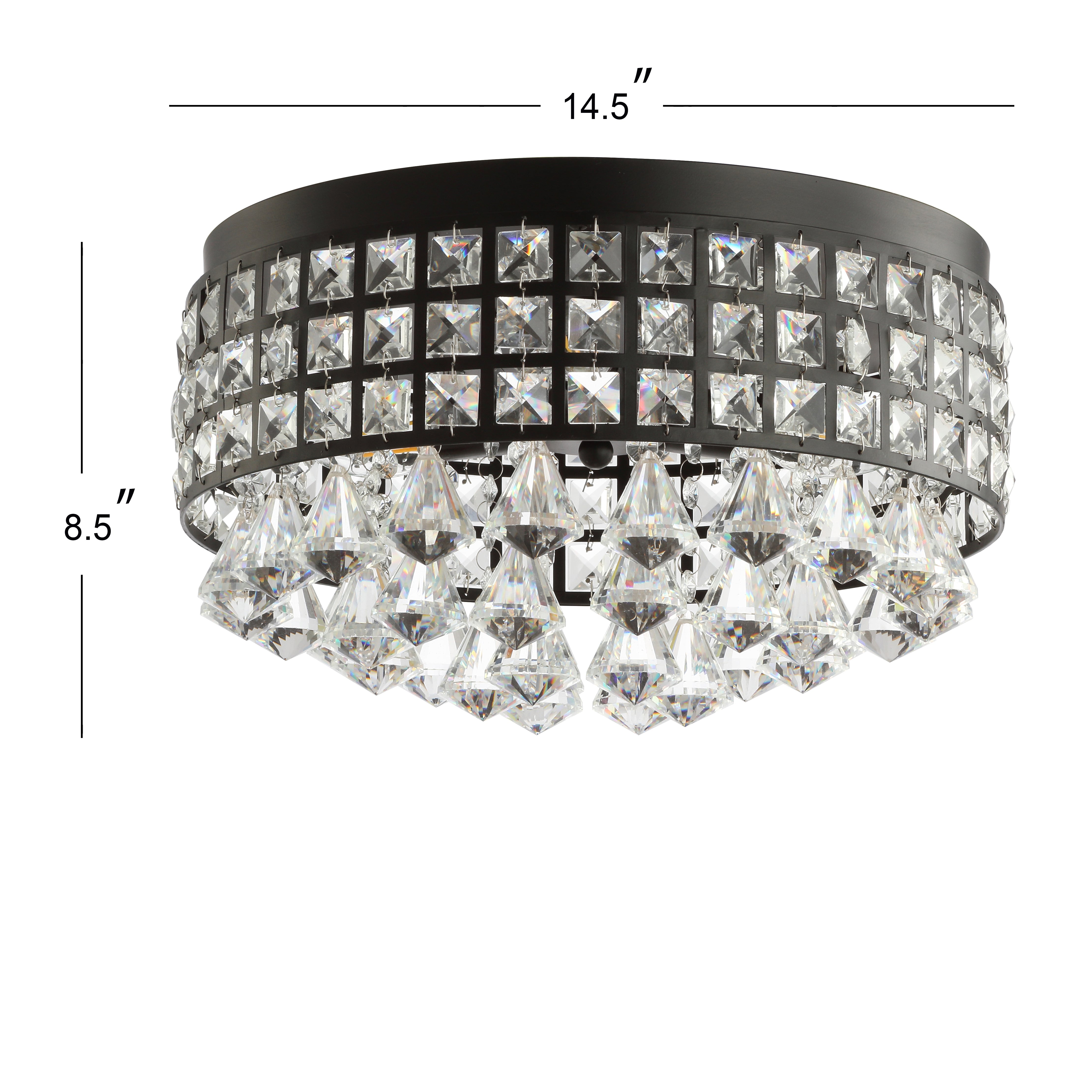 Add sparkle to your ceiling with our modern flush mount Meredith fixture. With faceted crystals set into a chic black metal grid and a collection of crystal drops, this unique light fixture adds a touch of glamour to your hallway, bedroom or bathroom. Perfect for low ceilings, the 8 5" height fits just about anywhere.