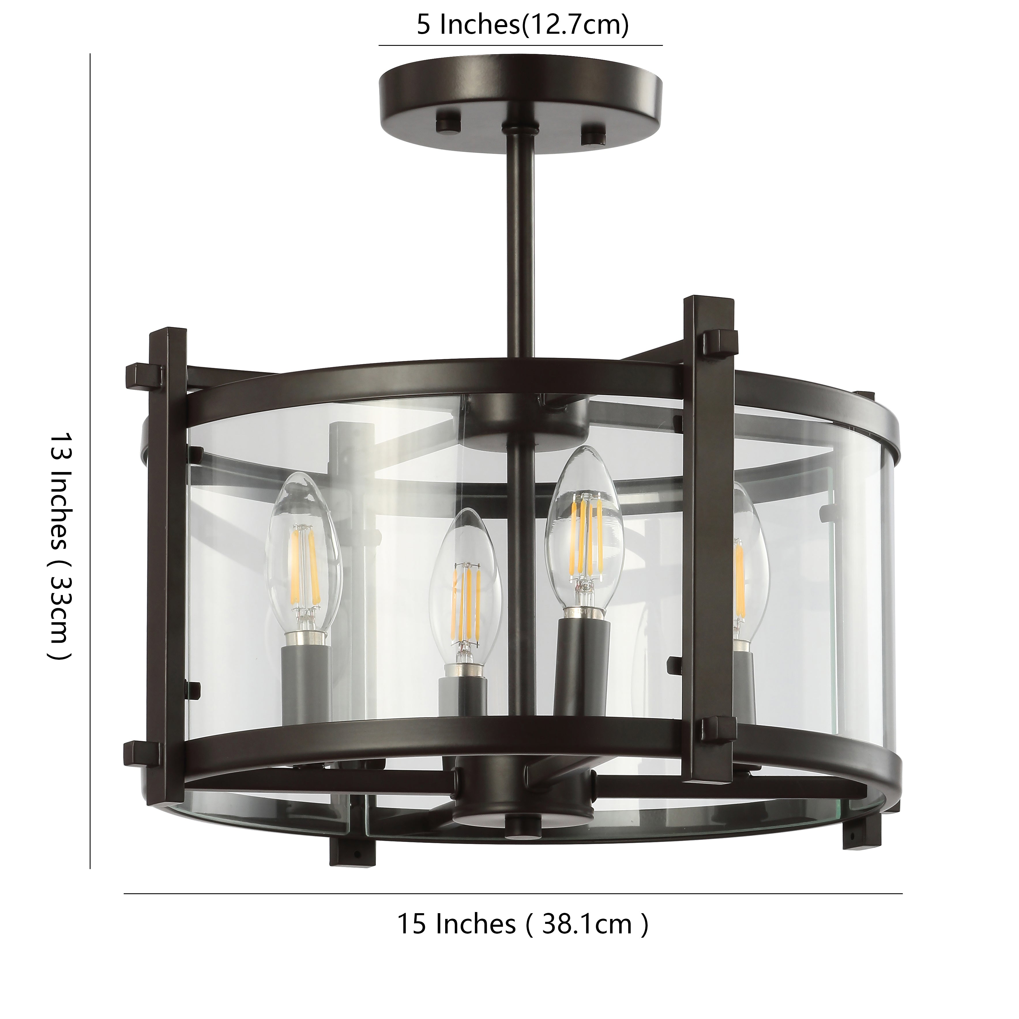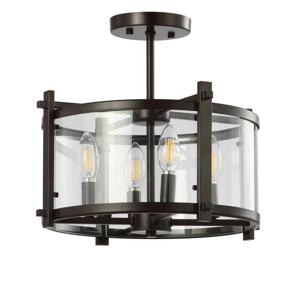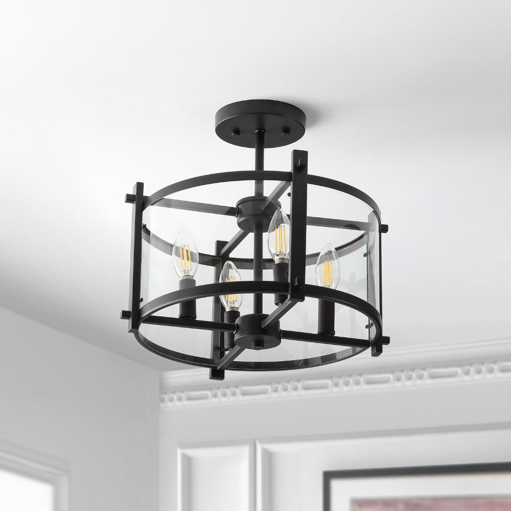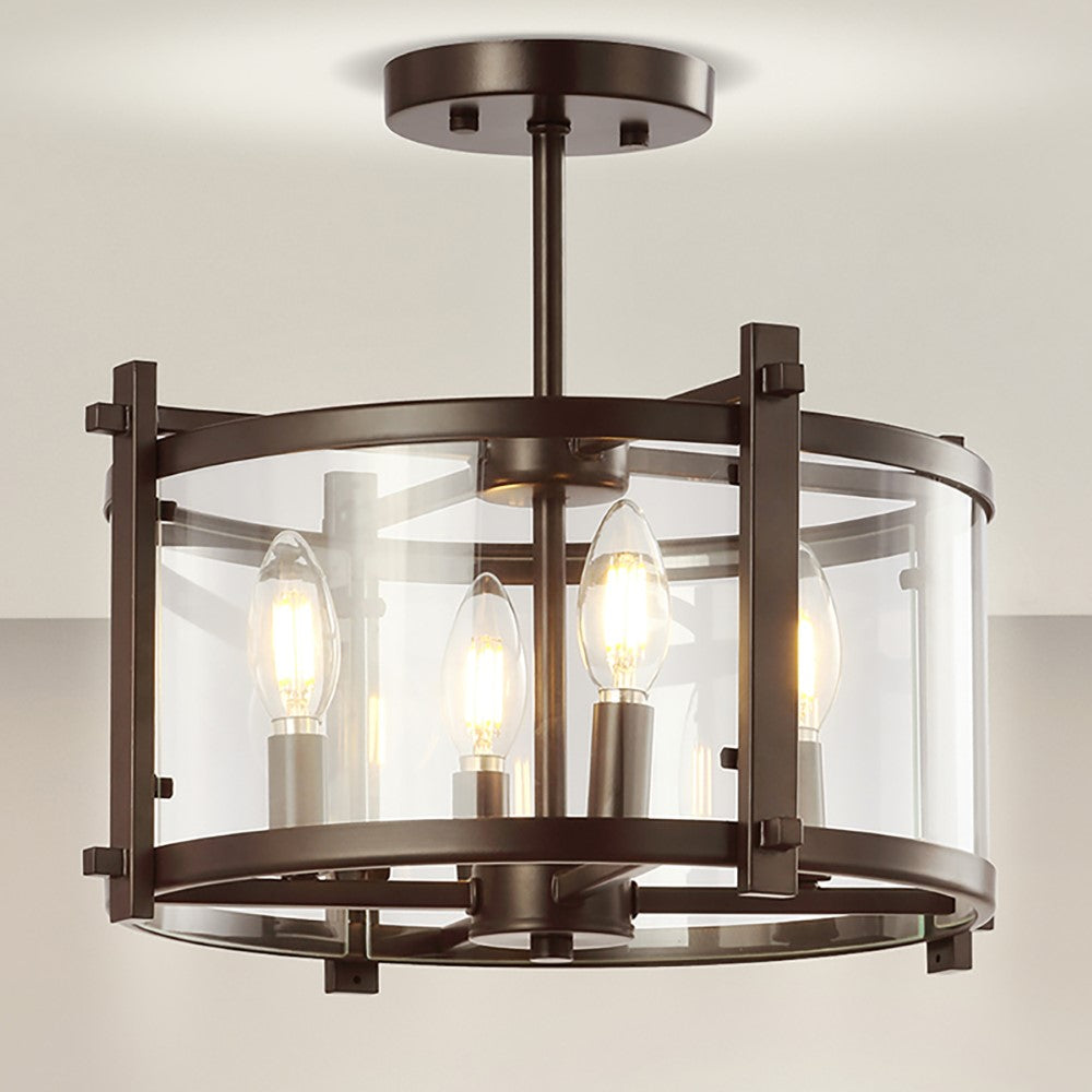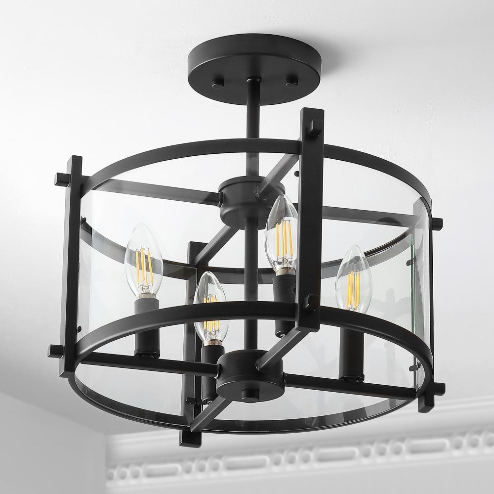 Whether your home is Rustic or Traditional, the classic drum shape of this semi-flush ceiling light fits right in. Clear glass side panels are framed in black metal with a handcrafted look. This ceiling fixture is perfect for an entry, kitchen, living room, hallway or bedroom.