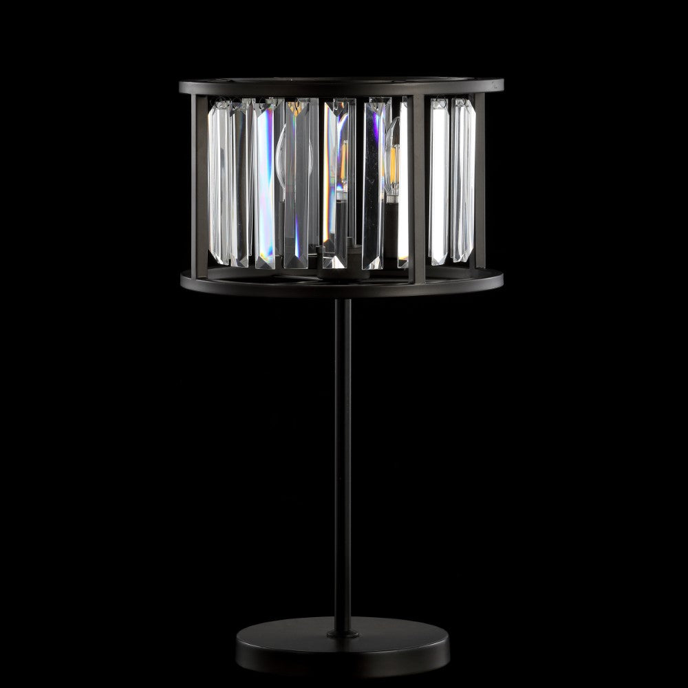 Thin linear crystals stand in for the glass cylinder shade of a hanging lantern in this sparkling, oil rubbed bronze table lamp. A fresh twist on a classic table lamp, two lights glow from the center, casting a beautiful refracted glow through the surrounding crystals. The overall silhouette is geometric and elegantly simple, but the sparkling details are distinctive and unlike anything else you're bound to discover.
