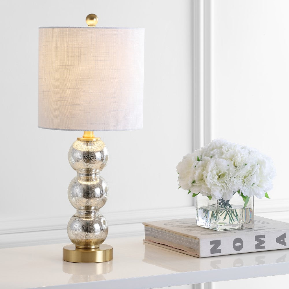 Combining a playful elegance and luxe materials, this stacked sphere glass table lamp will gracefully light any space. Taken from Art-Deco inspiration, its gracious silhouette is created by the linear geometry of three symmetrical curves, as if containing identical spheres. Finished with brass gold hardware, the look is both elegant and statement-making.