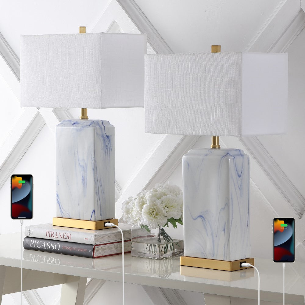 This chic pair of marbled ceramic lamps adds modern cottage style to any space. Rectangular shades are a perfect fit for a dining room console or bedroom chest. The handy USB charging ports make them ideal for vacation homes too.