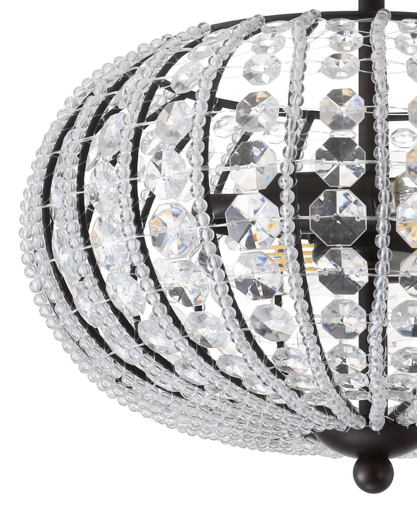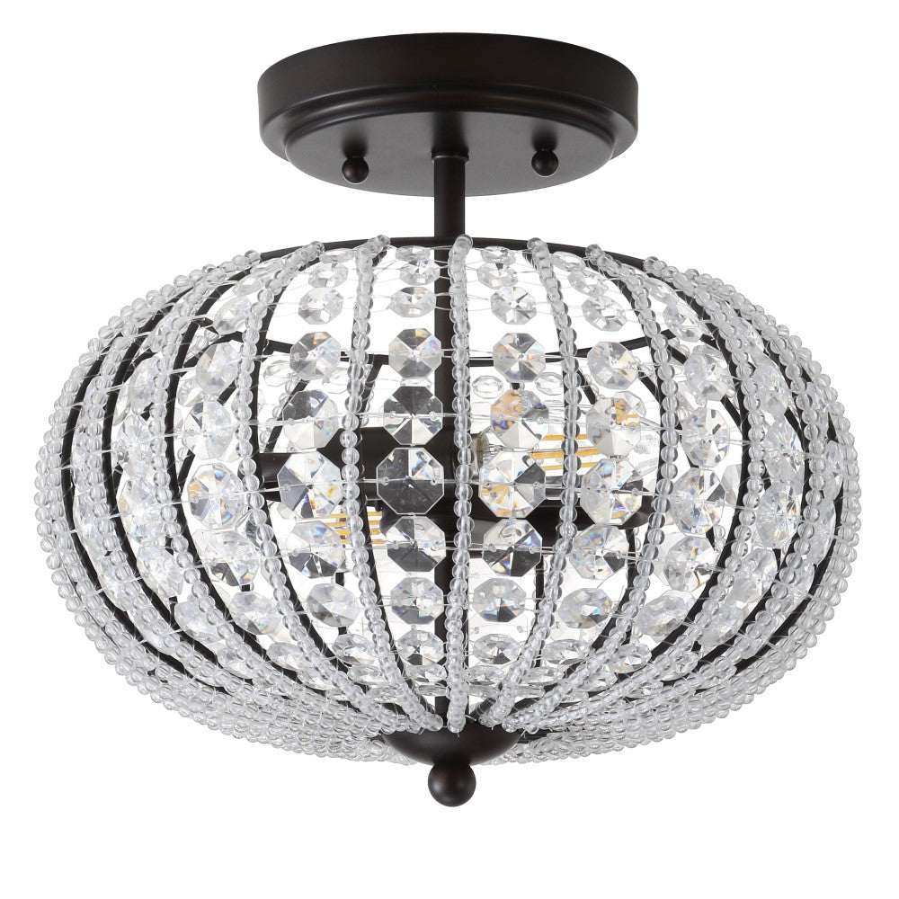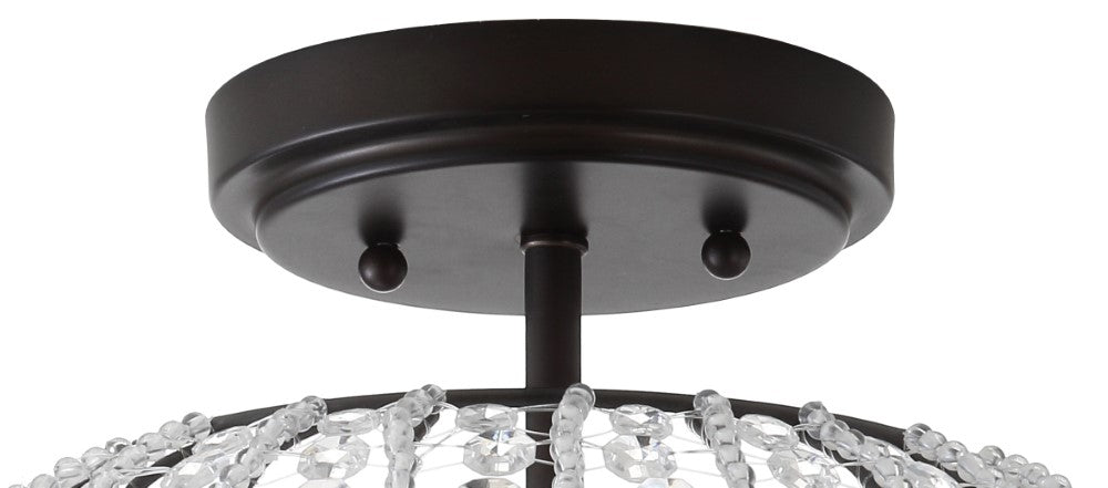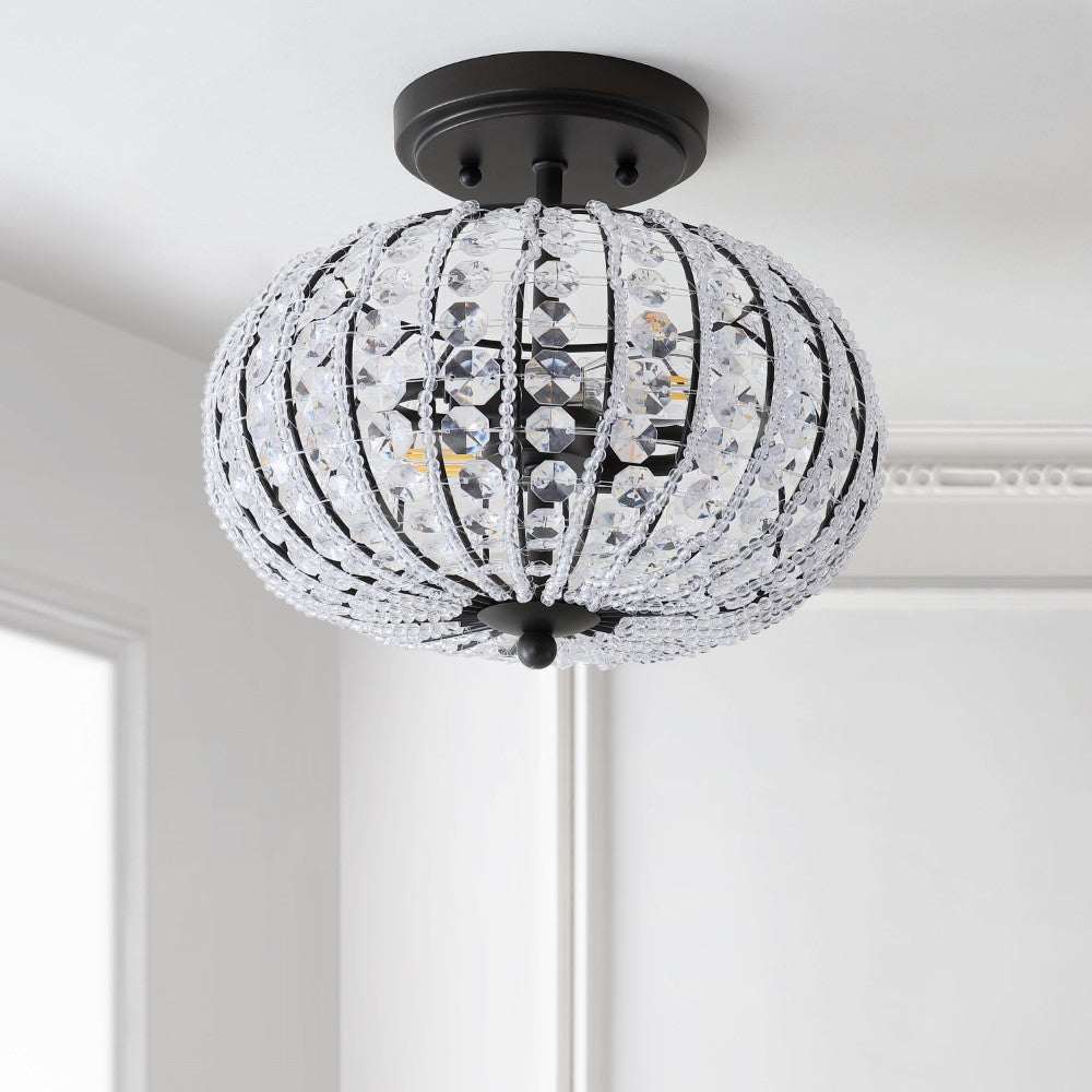 Crystal beads of different sizes adorn this round semi-flush mounted lighting fixture. When illuminated, the two bulbs' light is reflected and refracted through the faceted crystals to stunning effect. To change the bulbs, simply unscrew the bottom finial and remove the crystal cover to access the sockets.
