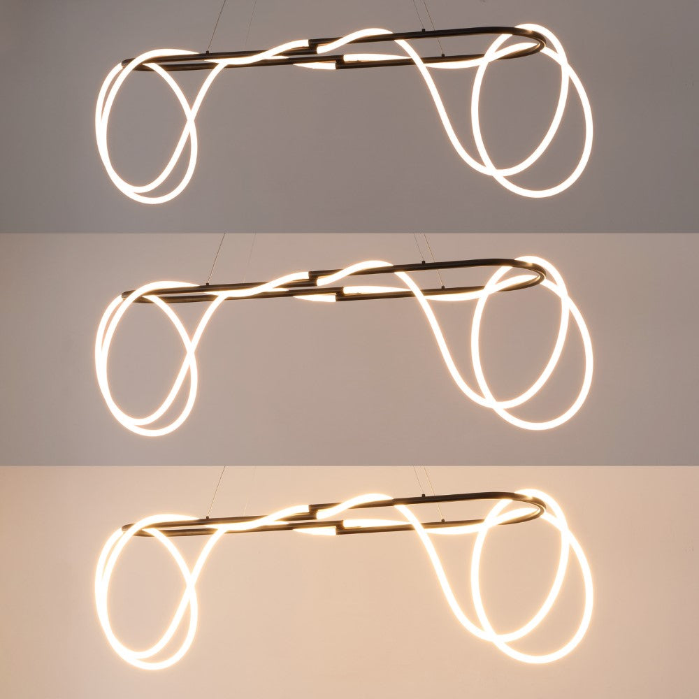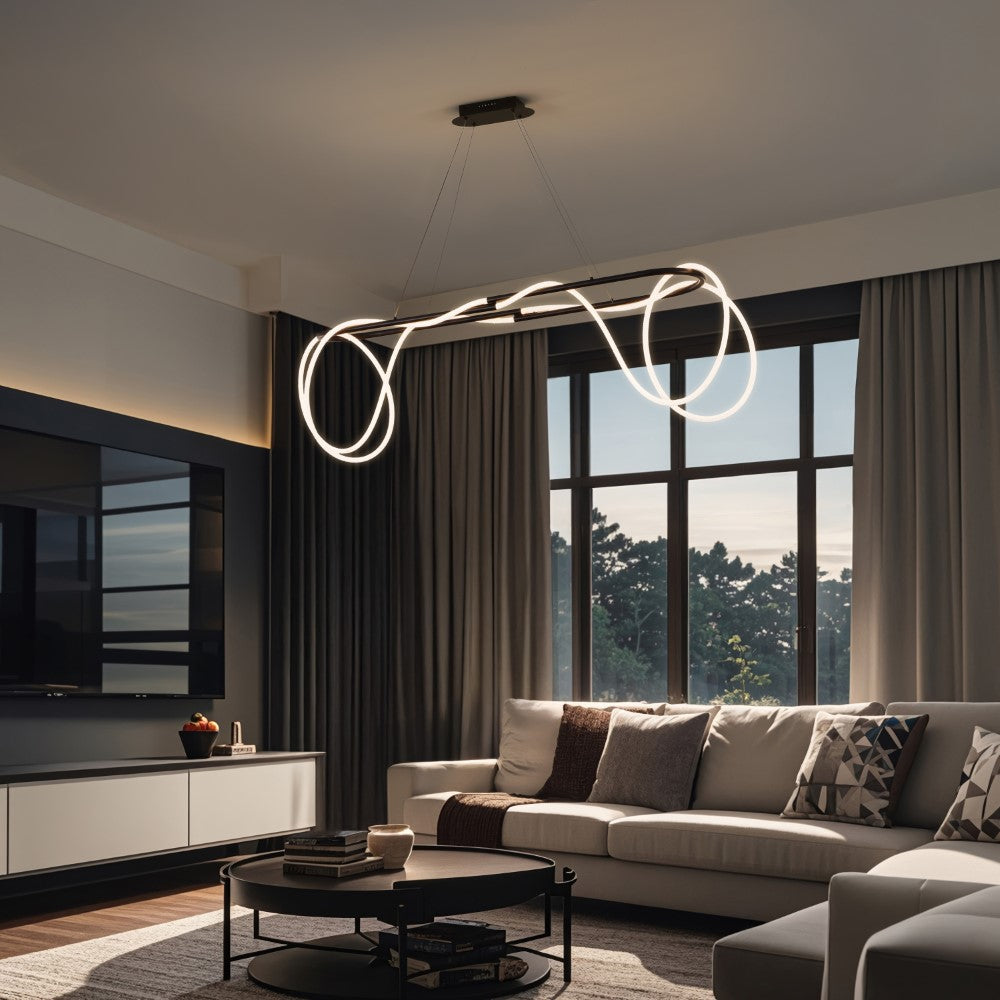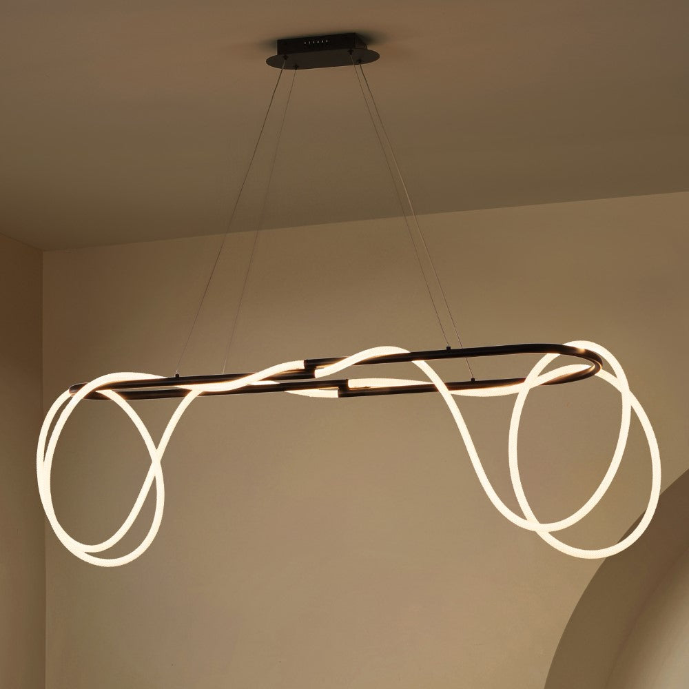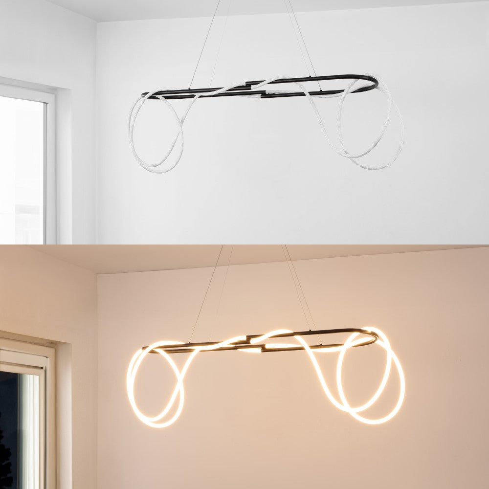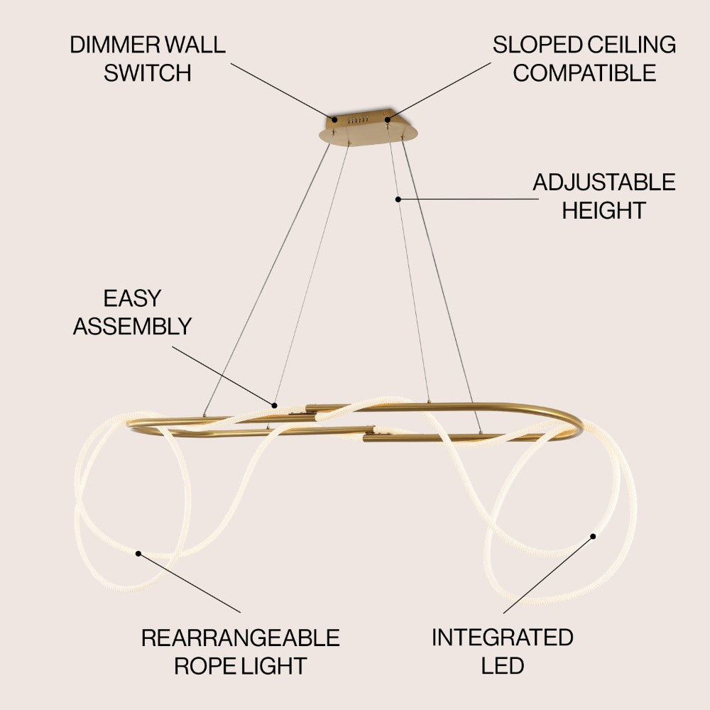 Our modern, minimalist chandelier combines a sleek metal ring draped with integrated, roped LED lights in a contemporary design. Flexible silicon rope lighting can be customized at any time. Flood the room with ambient, warm light or use a dimmer wall switch to set the mood in the living room, dining room, or home office.