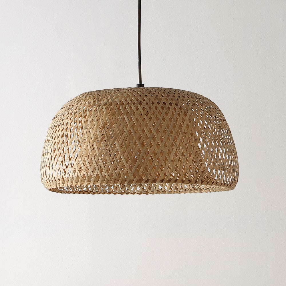 This midcentury-inspired rattan pendant light is perfect for modern or resort homes. The 18" wide woven rattan shade is has a retro diamond weave. The natural rattan helps diffuse a single bright LED light bulb; plug in or hardwire for instant chic in the kitchen, dining room, bedroom, or office.