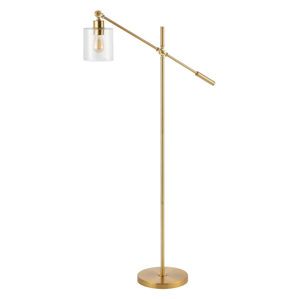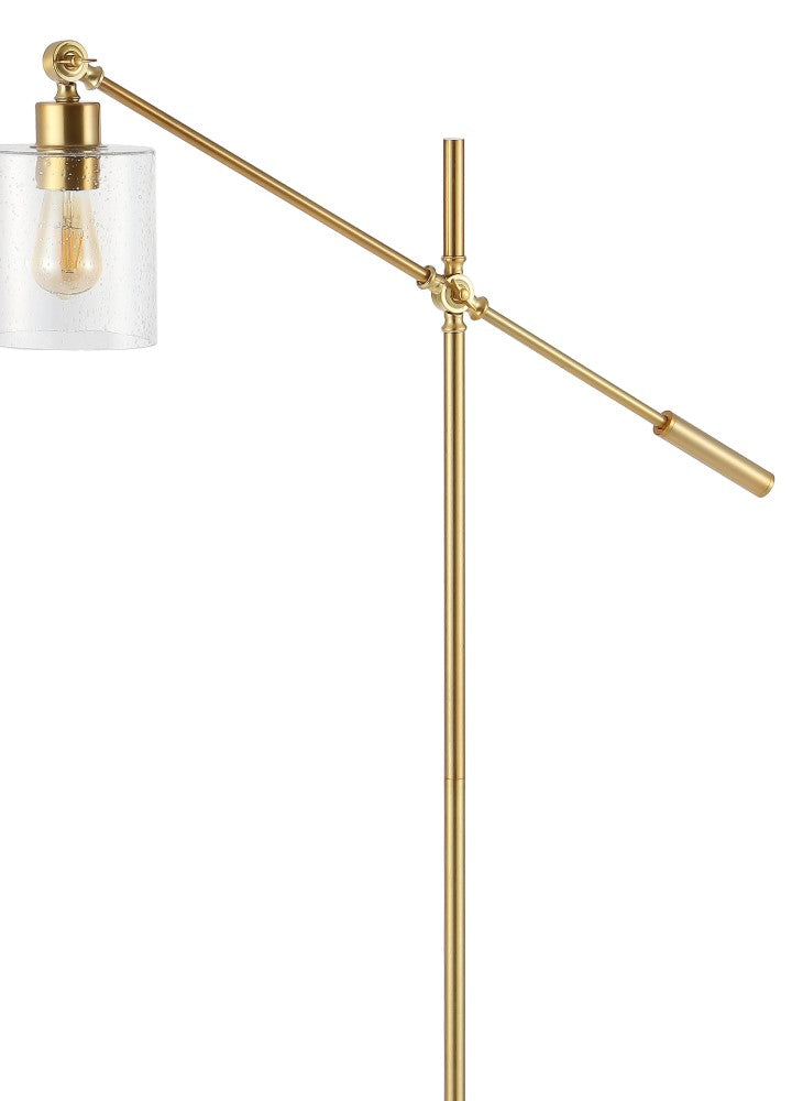 Upgrade your living room, home office, or bedroom with our adjustable brass-gold lamp. A clear seeded glass shade highlights the Edison-style LED bulb. These modern desk or floor lamps are the perfect solution for a vacation home or hospitality project.