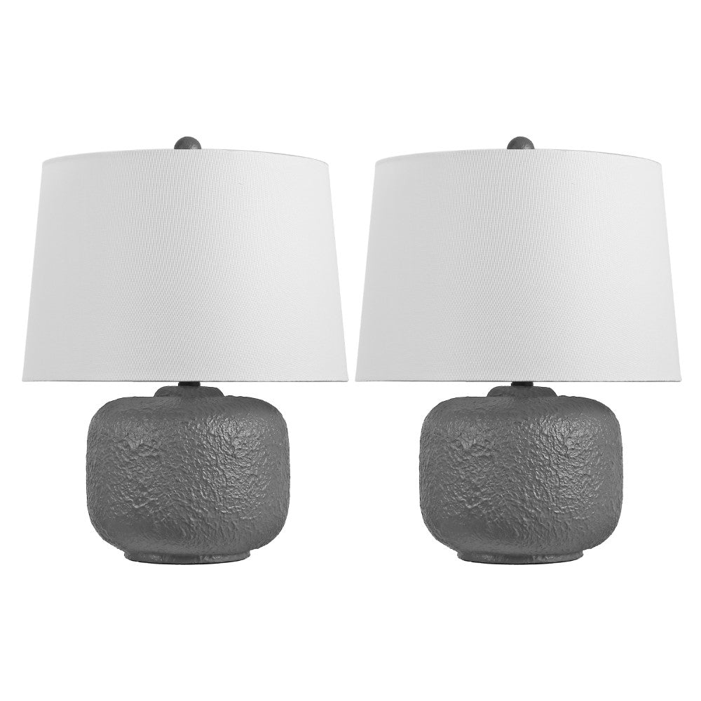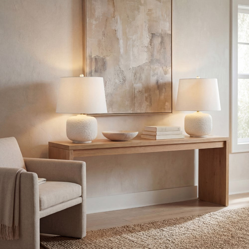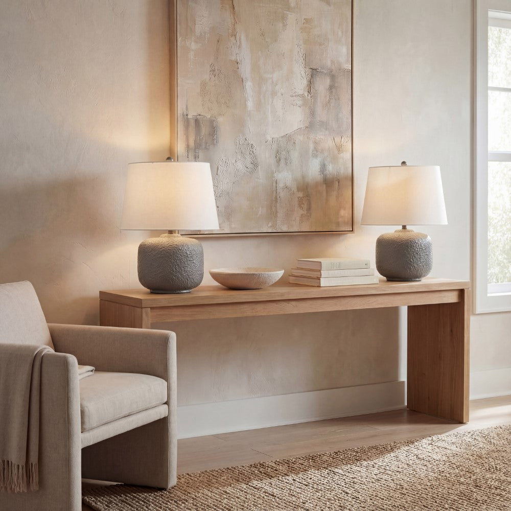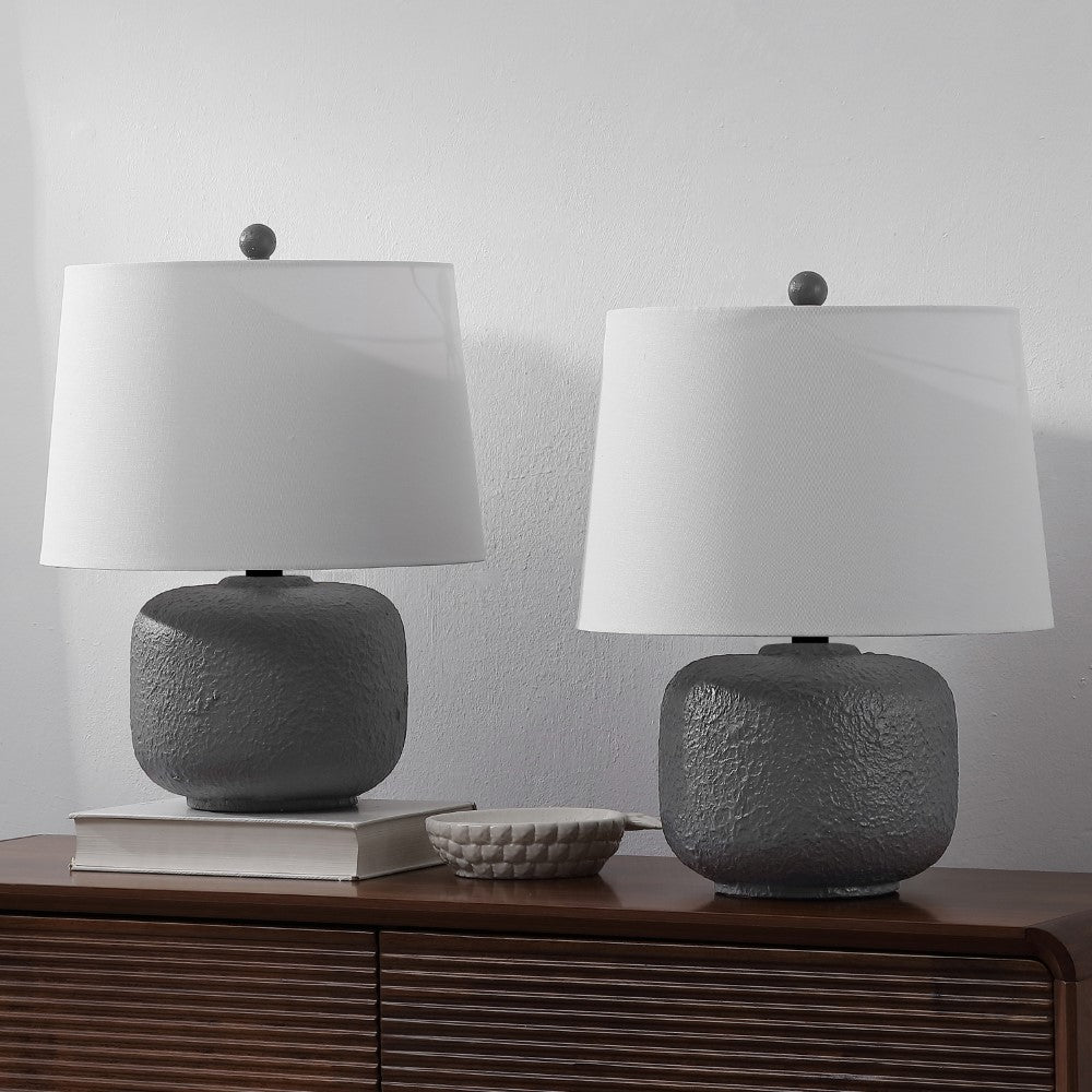 This set of two table lamps combines a timeless finish with a clean, sculptural silhouette, making them a versatile choice for refined interiors. The rounded resin bases feature a textured surface that enhances visual depth, complemented by linen shades for soft, even illumination. Perfect for use on nightstands, side tables, or consoles, these lamps bring harmony and understated elegance to any space.