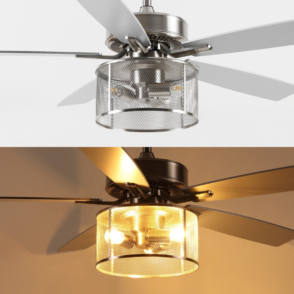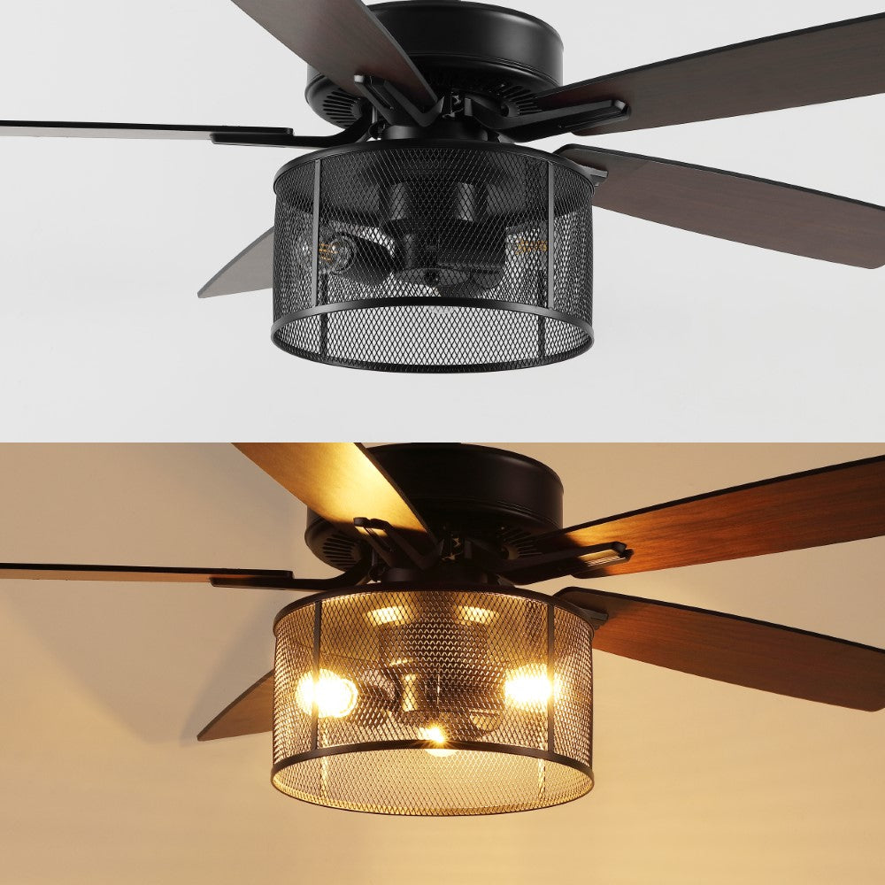 This fan is finished in industrial style black, with fan blades in a dark walnut finish