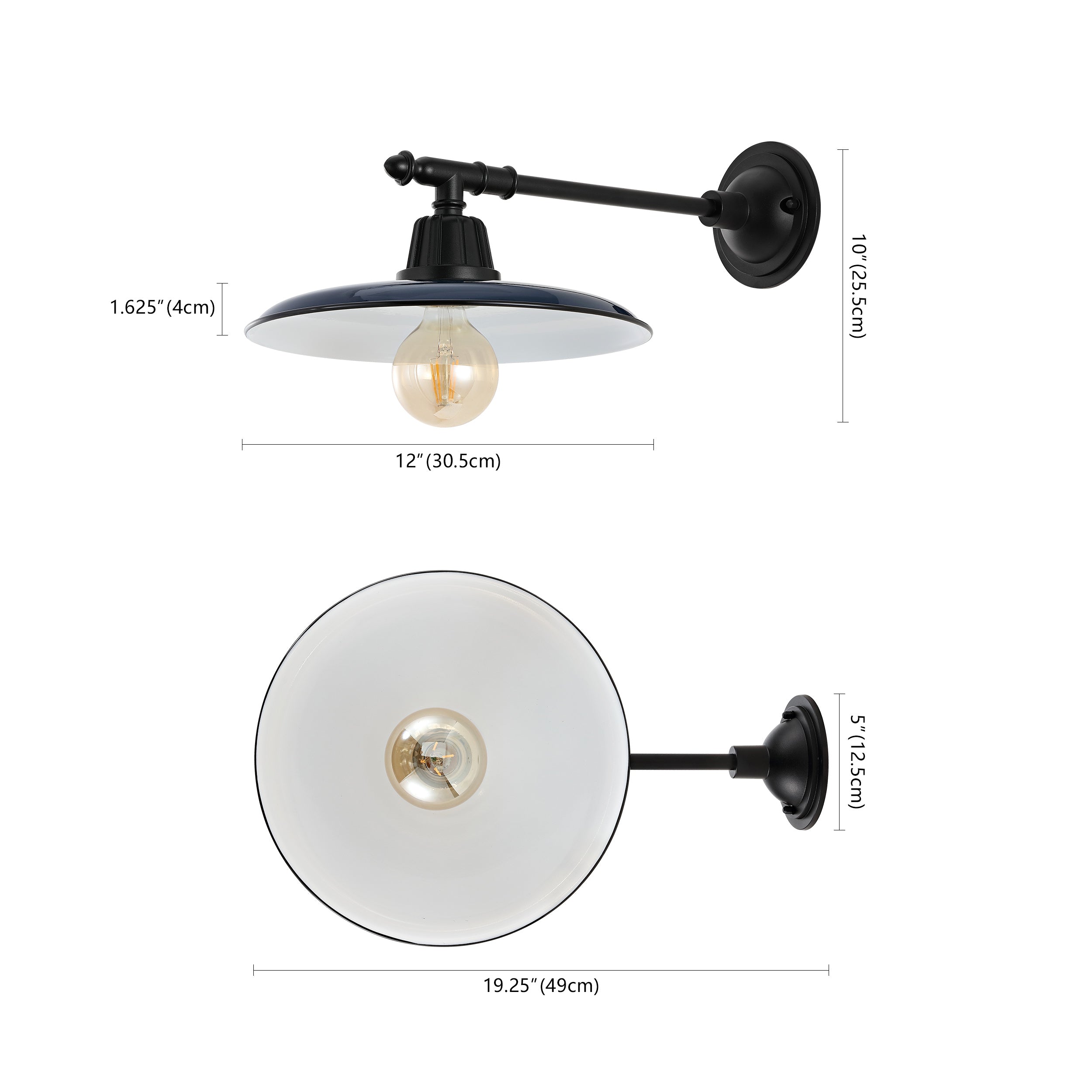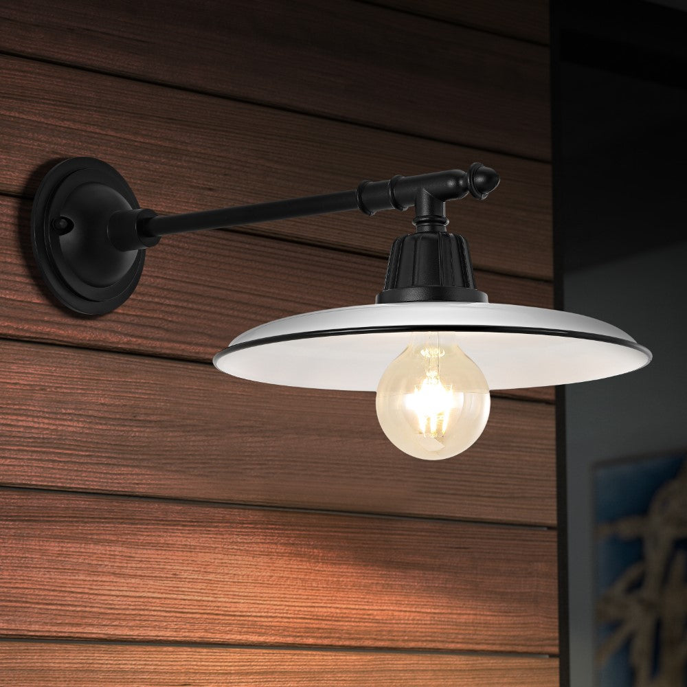 - This modern wall light features a straight black arm and flat white and black metal shade with an exposed globe LED bulb