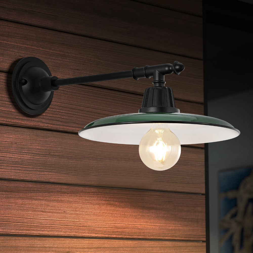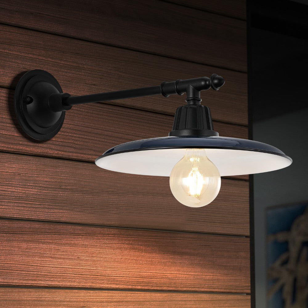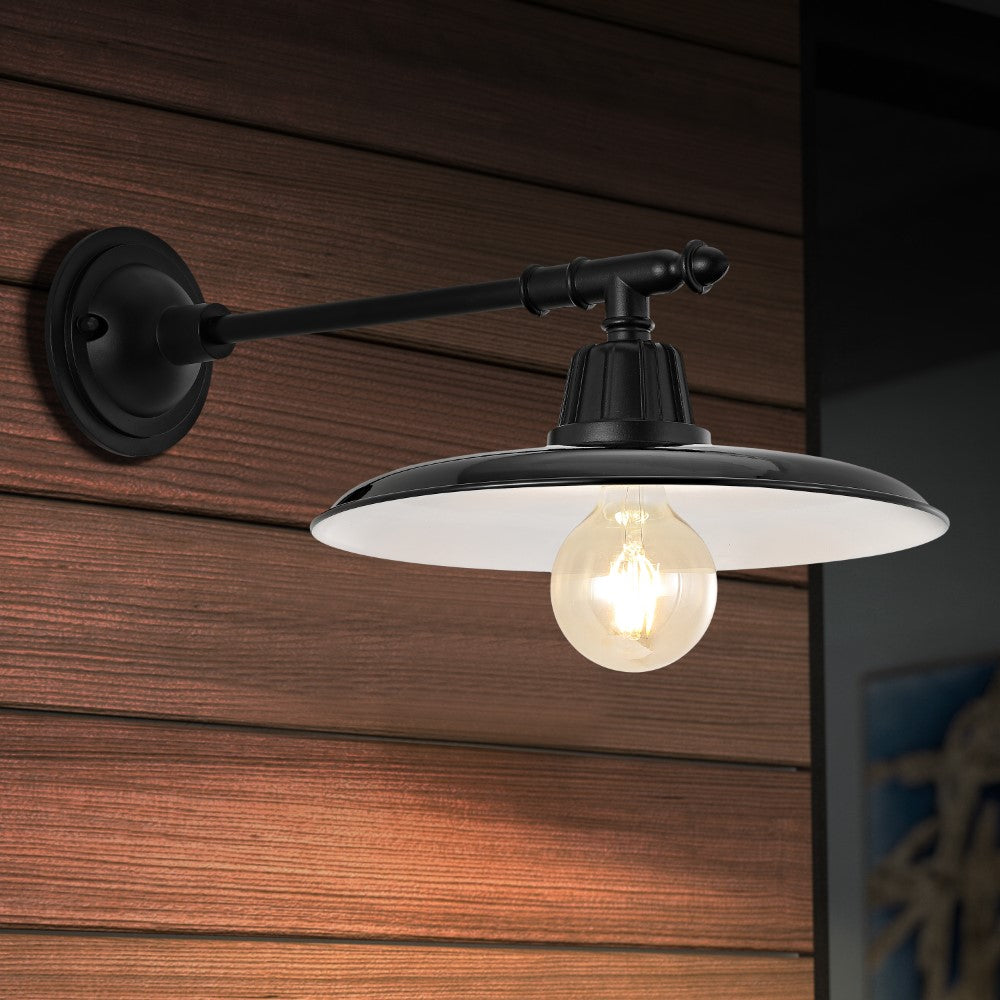 Our metal wall light adds a modern touch to a classic farmhouse look. A flat painted shade and a straight bracket set off the warm globe LED bulb. Use this outdoor light fixture indoors too for residential and hospitality projects.