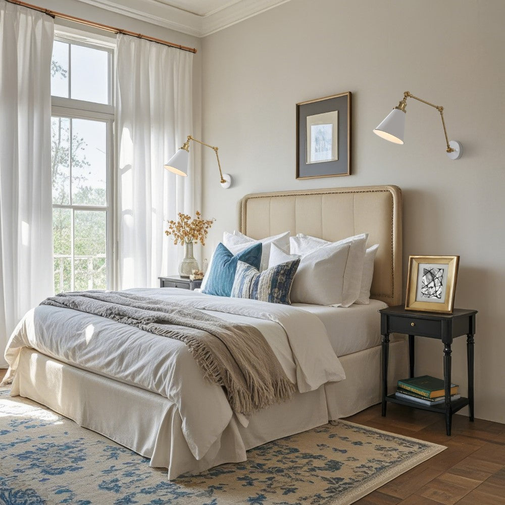 With an adjustable arm and easily focused metal shade, this sconce is the perfect solution for bedside lighting - no nightstands required! For added luxury, have your electrician install a switch below each light so you don't have to get out of bed to turn it on or off. When space is limited, they also make for excellent focused lighting, such as over bulky wall art, or above a vanity mirror. With LED compatibility, you'll rarely have to reach up to change the bulb.