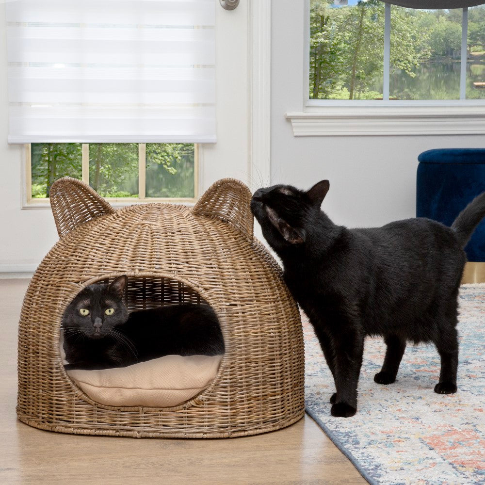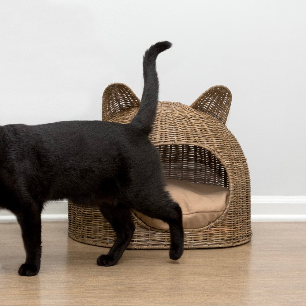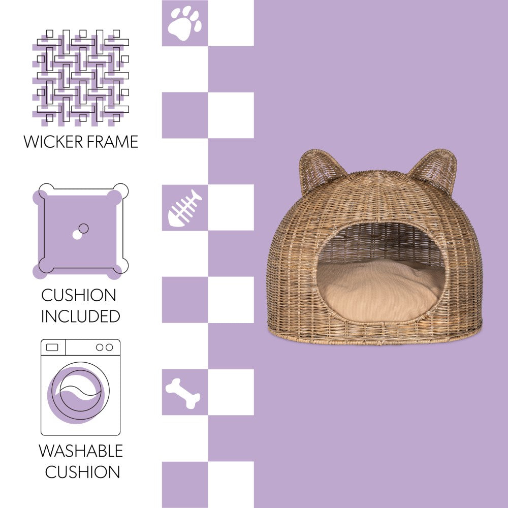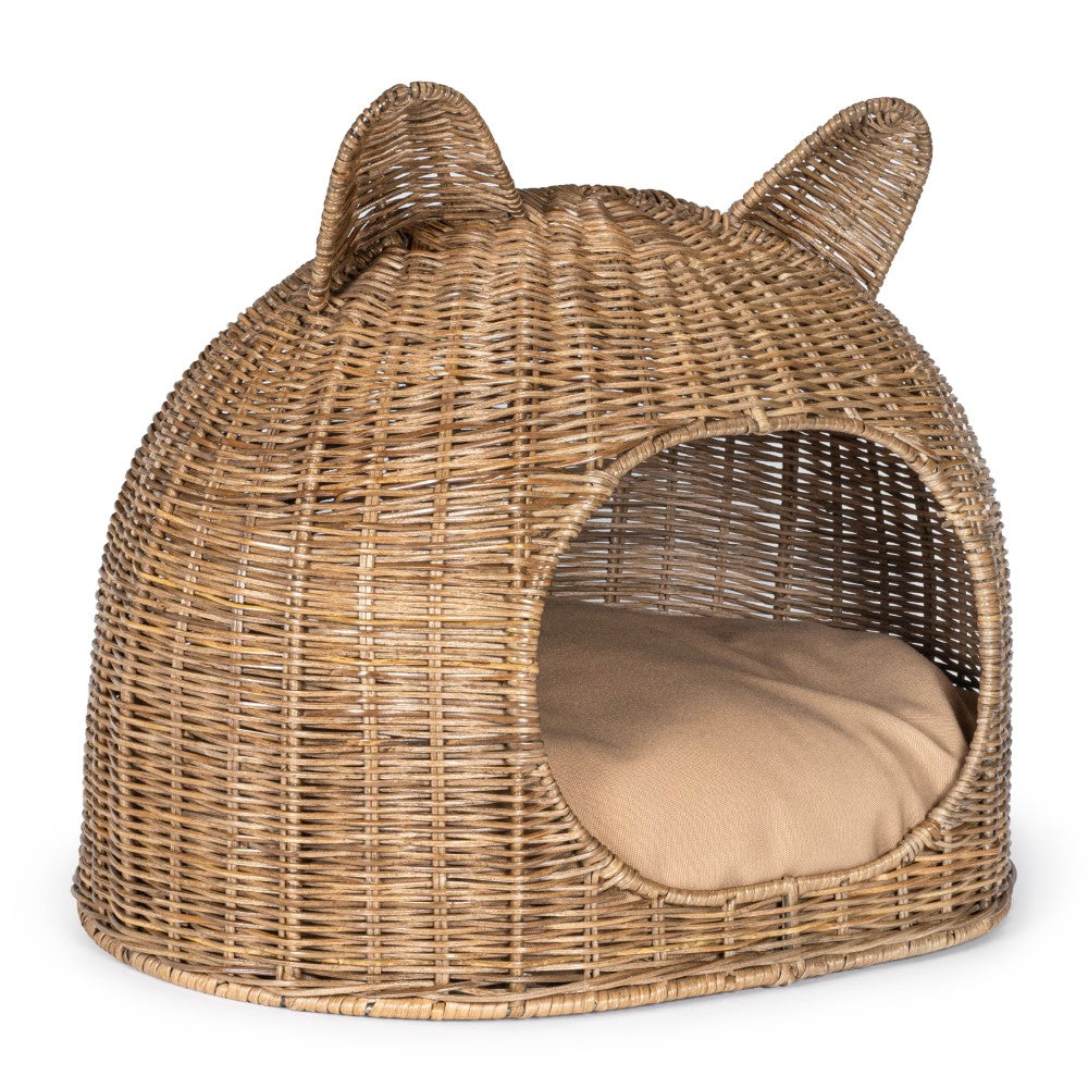 Make your cat feel at home with our novelty cat ear shaped wicker bed. Designed with a cozy dome shape and cat ears, this bed will fit in well in any bohemian or cottage styled home. At 20 inches wide, this bed can fit any adult cat.