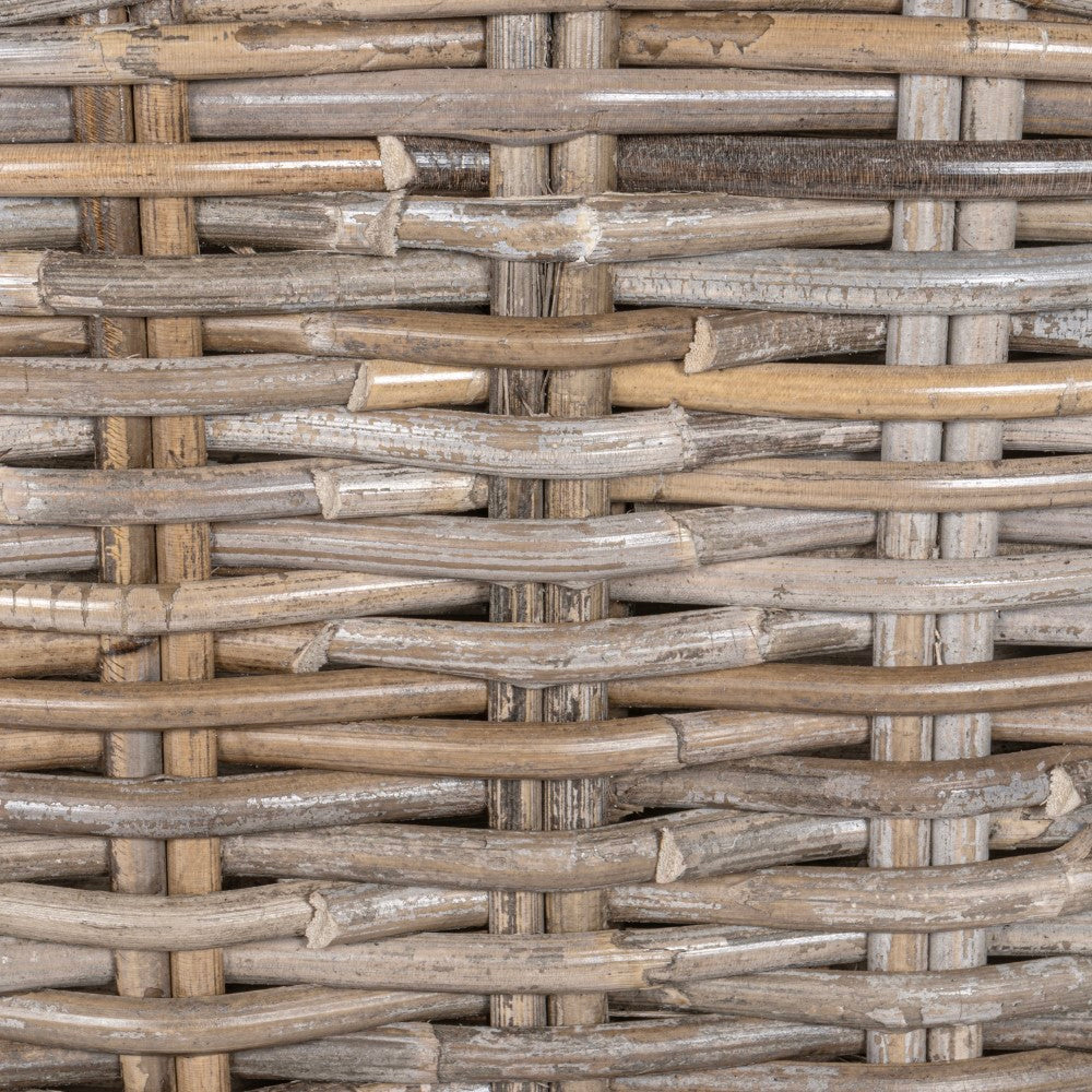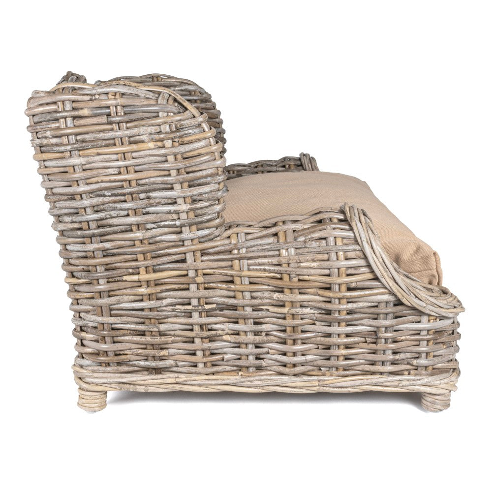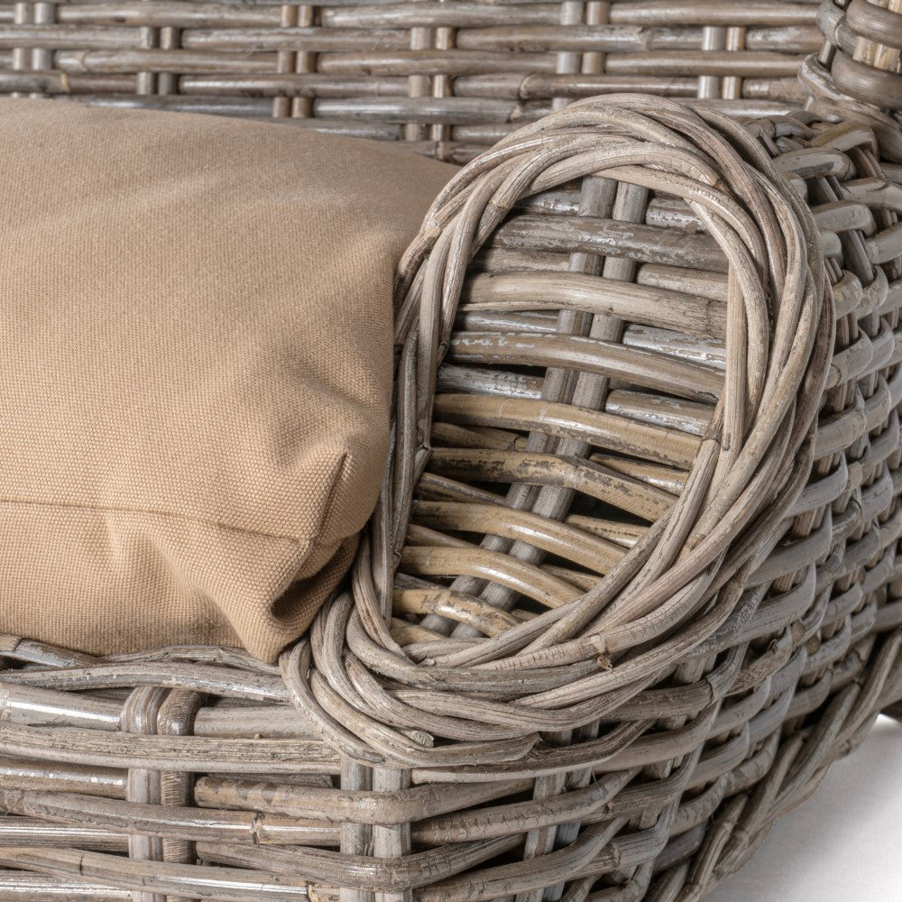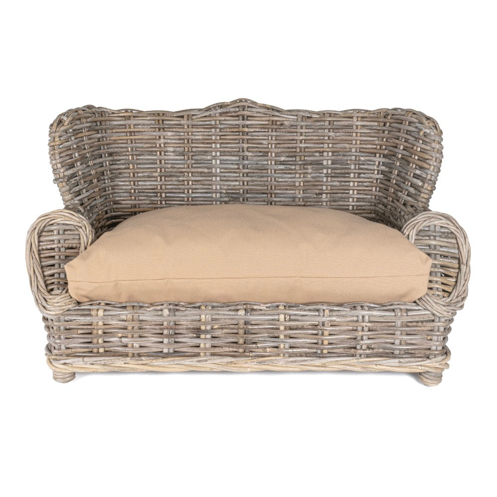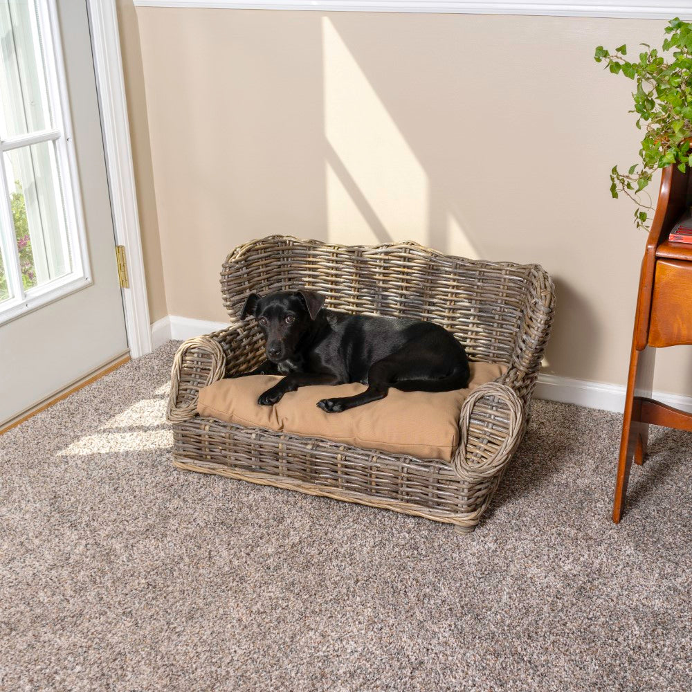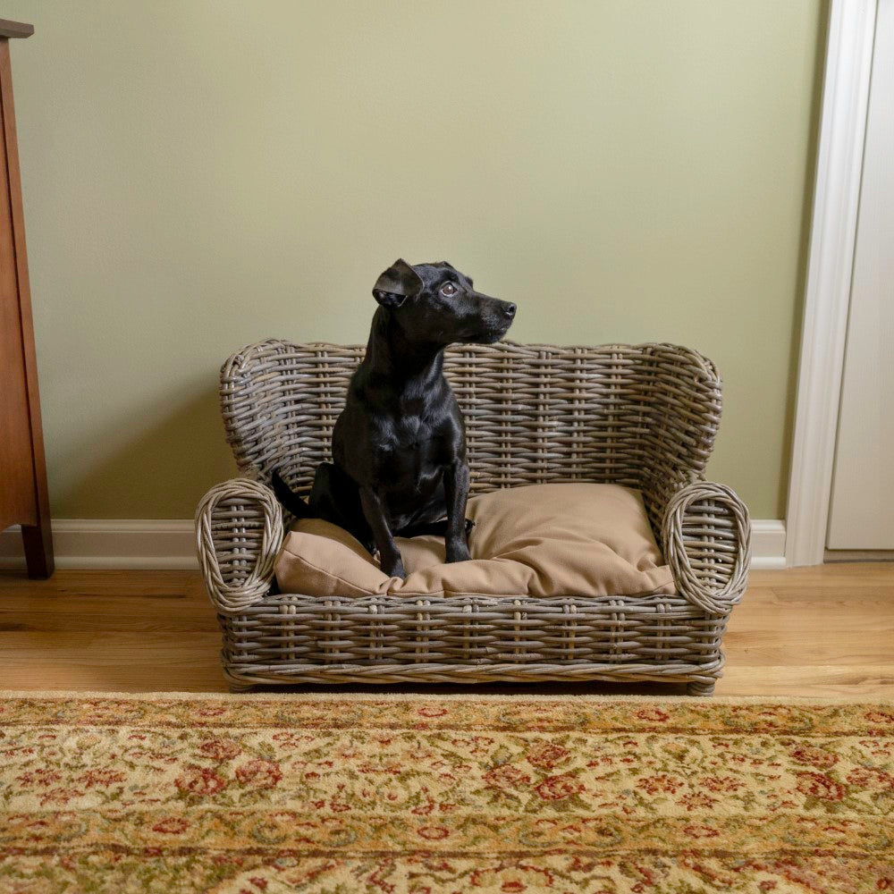- This wicker dog daybed is made of a Kubu gray rattan weaving and is decked out with a beige cushion