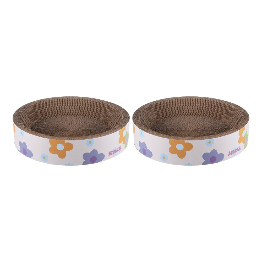 Our cozy cat-scratcher bowls are perfect for active scratching and relaxed snuggling. Set of two bowls has a corrugated cardboard interior and a modern floral design around the outside. Use one now and save one for later, or scatter them around the house as cat beds.