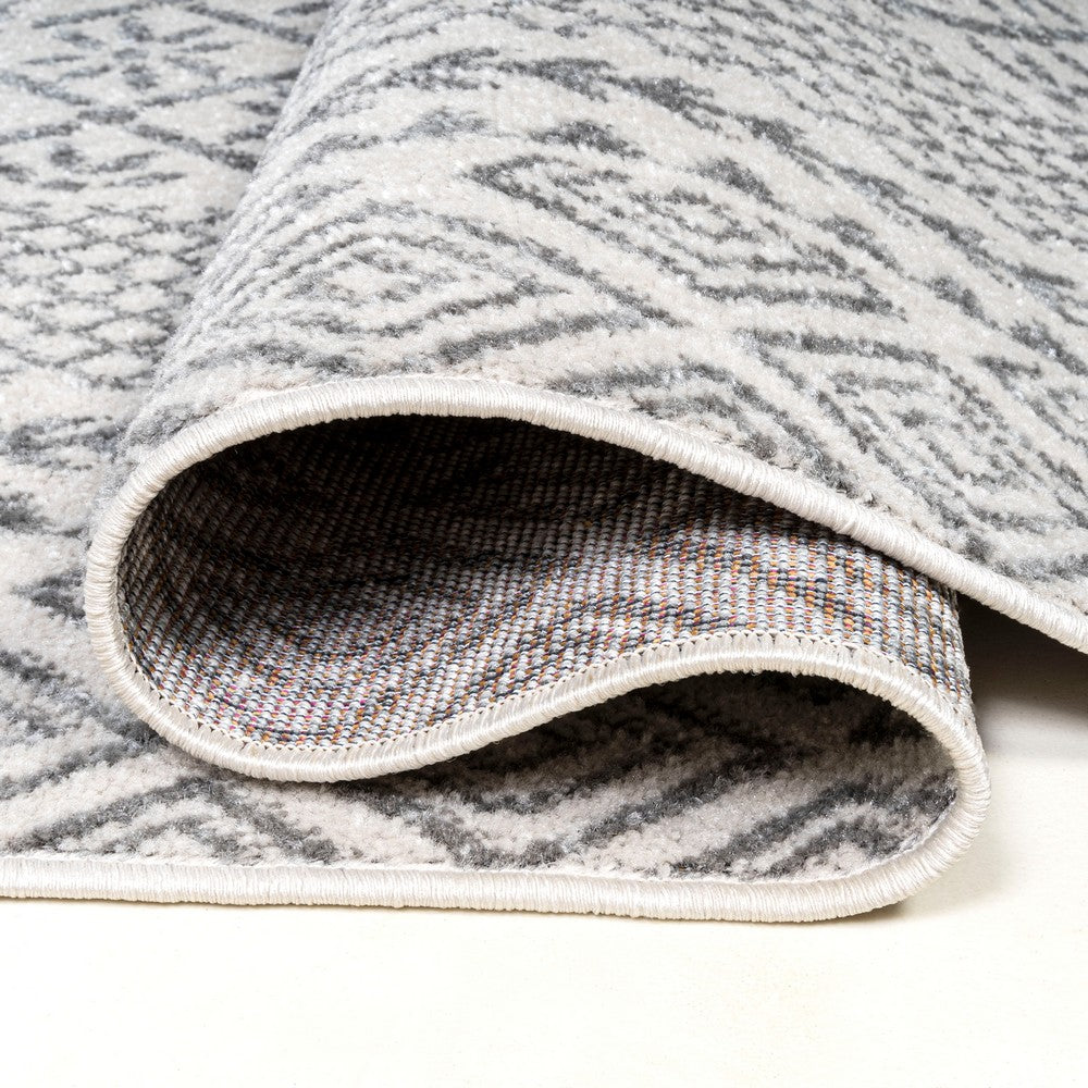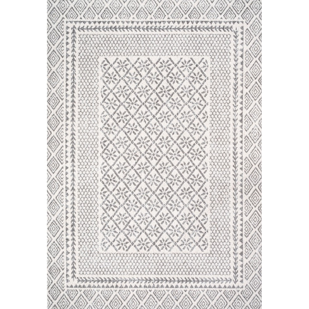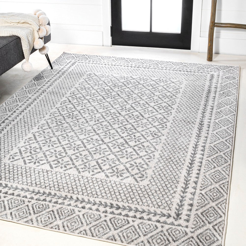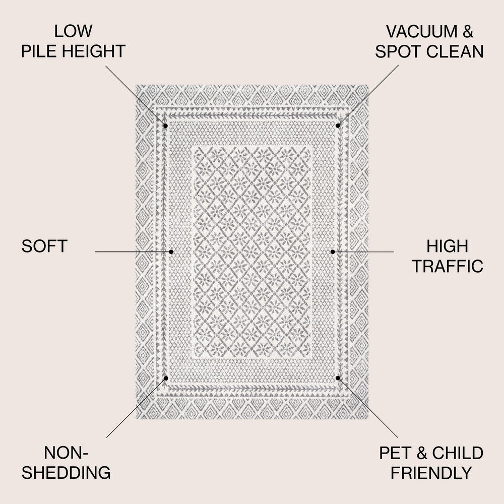 - The ivory mingled background and gray geometric pattern is ideal for high-traffic rooms