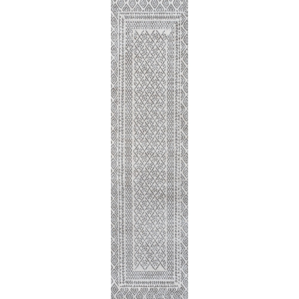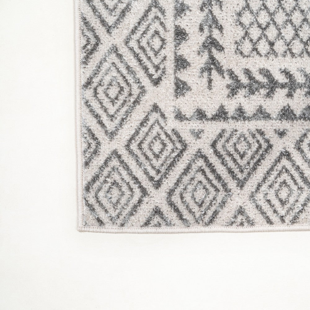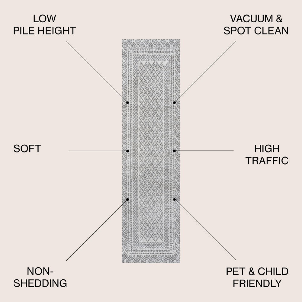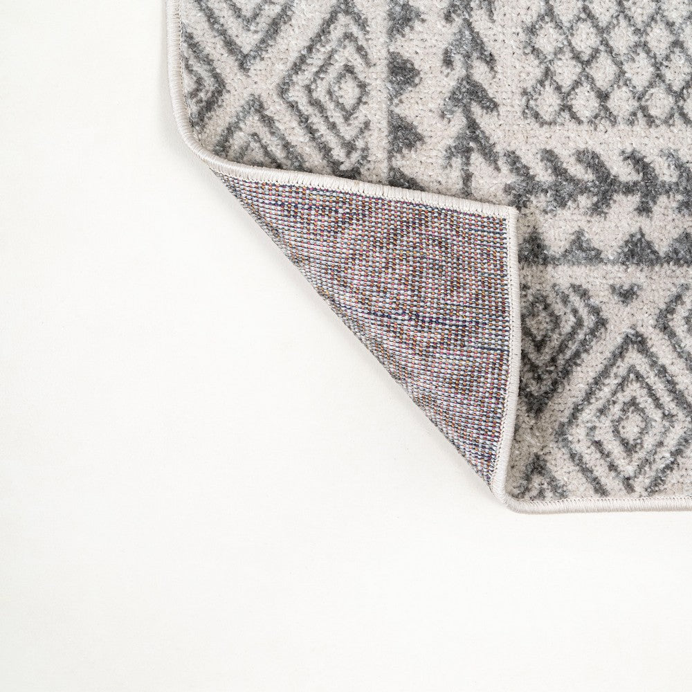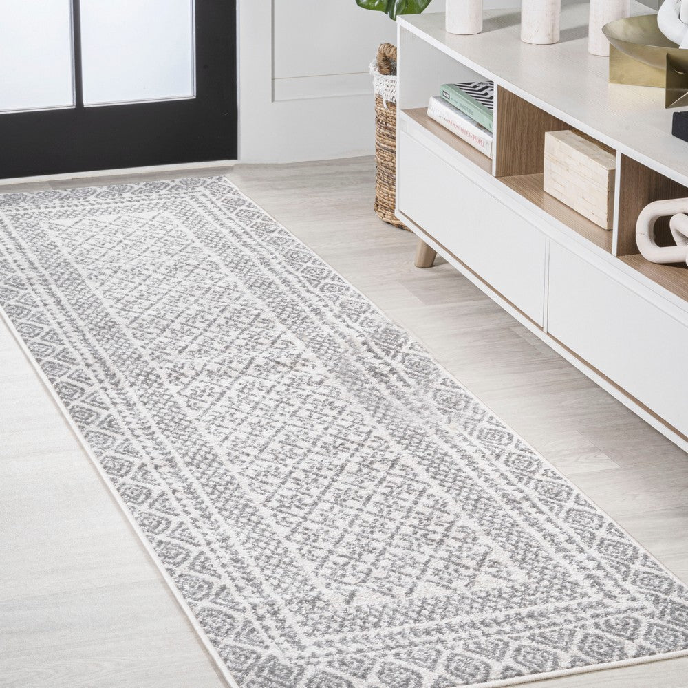 - The ivory mingled background and gray geometric pattern is ideal for high-traffic rooms