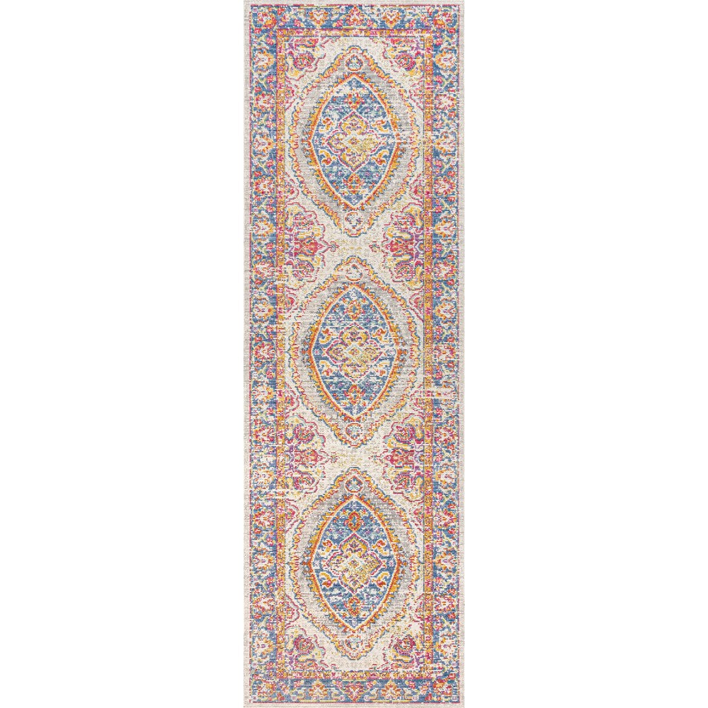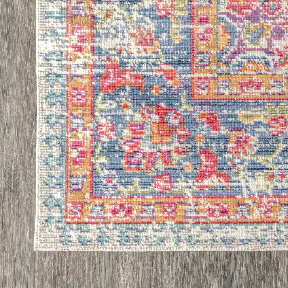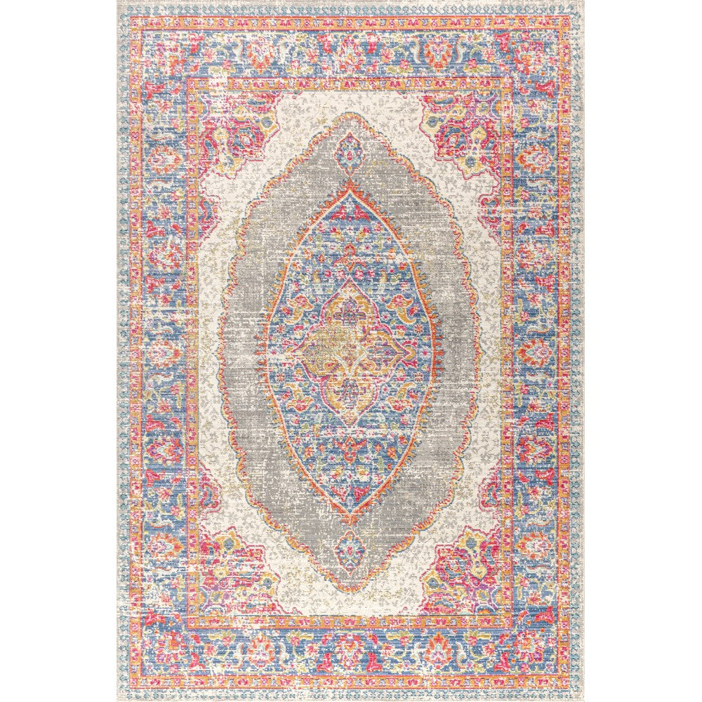 Featuring a floral central medallion and a rich Bohemian color scheme, this beautifully patterned rug adds a vintage vibe to your living room, bedroom, or den. The deep blue and raspberry scheme on a gray and ivory ground has a timeworn, faded effect. Power loomed for durability and constructed in polypropylene for longevity, this stunning piece is made to last.