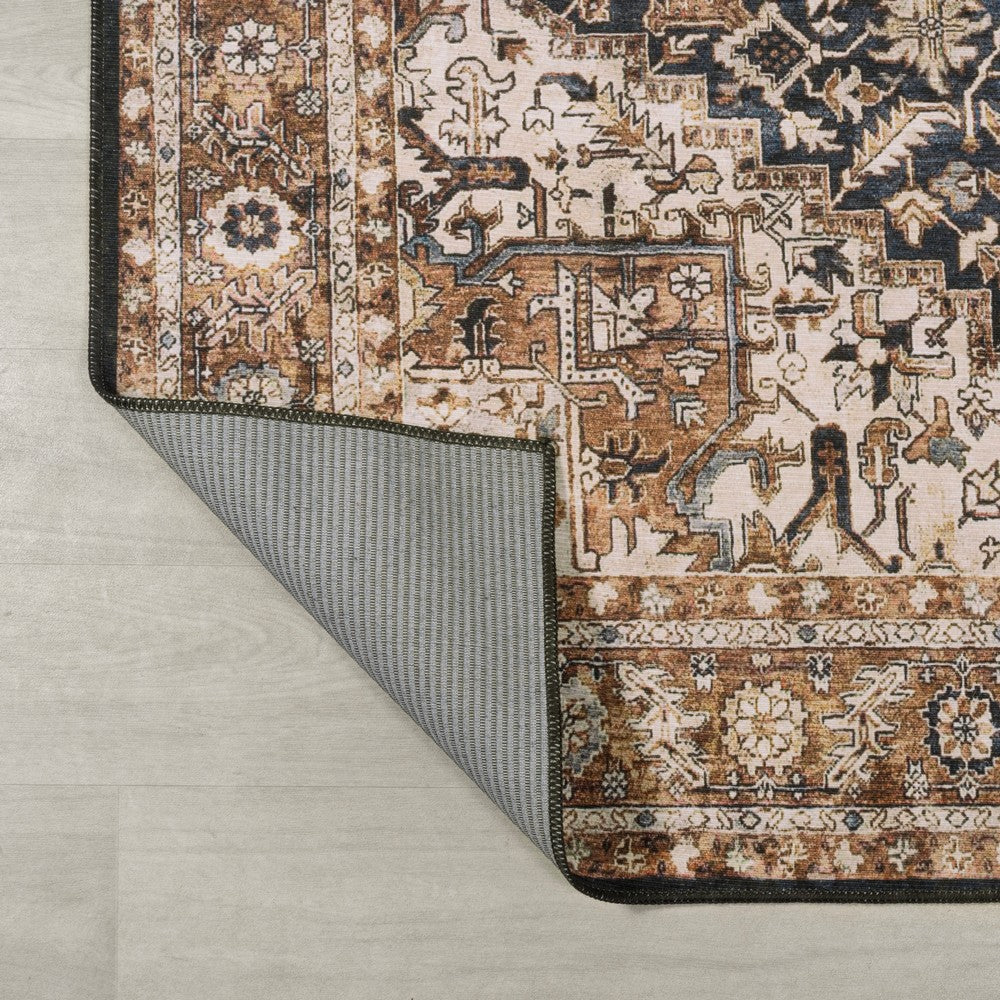Our Persian chenille rug boasts a bold color palette and medallion design. This durable, machine-washable rug is a perfect addition for any busy family. This timeless rug enhances any mid-century or traditional home.